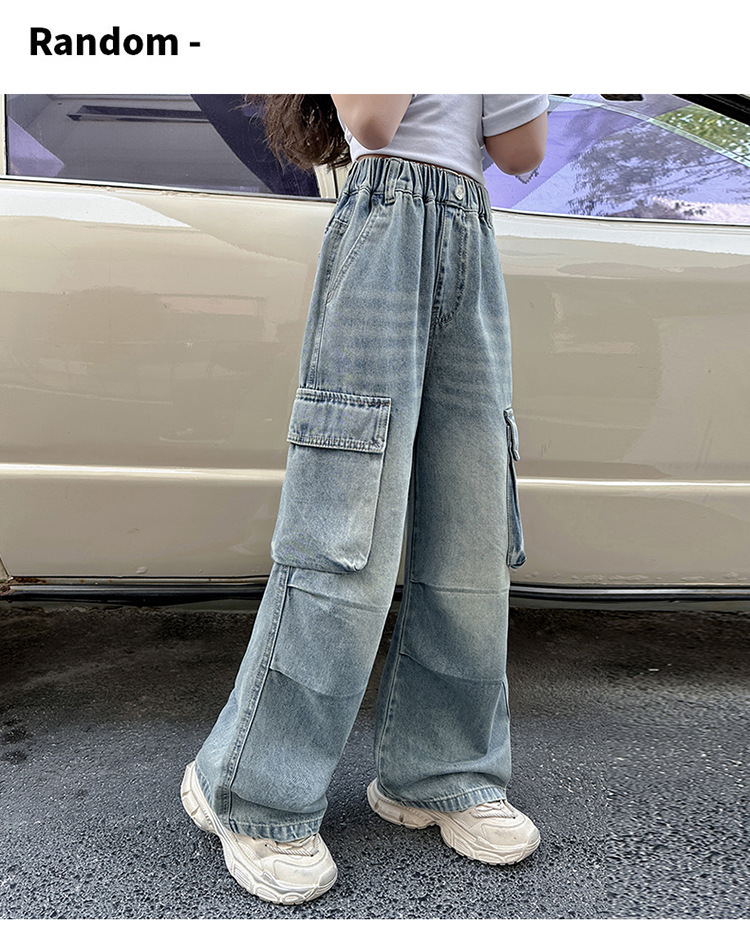 대외 무역 어린이 바지 2025 봄 새로운 소녀 작업 청바지 단색 패션 바지 한국 머리 세대
