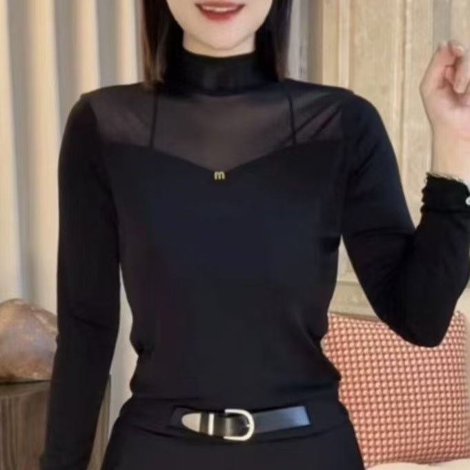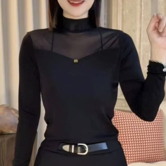 헤어 2025 봄 새로운 패션 세미 하이 칼라베이스 셔츠 슬림 조커 메쉬 최고 여성 긴 소매스토어 가기