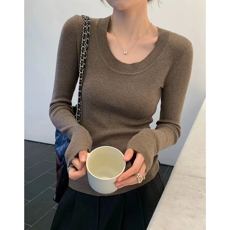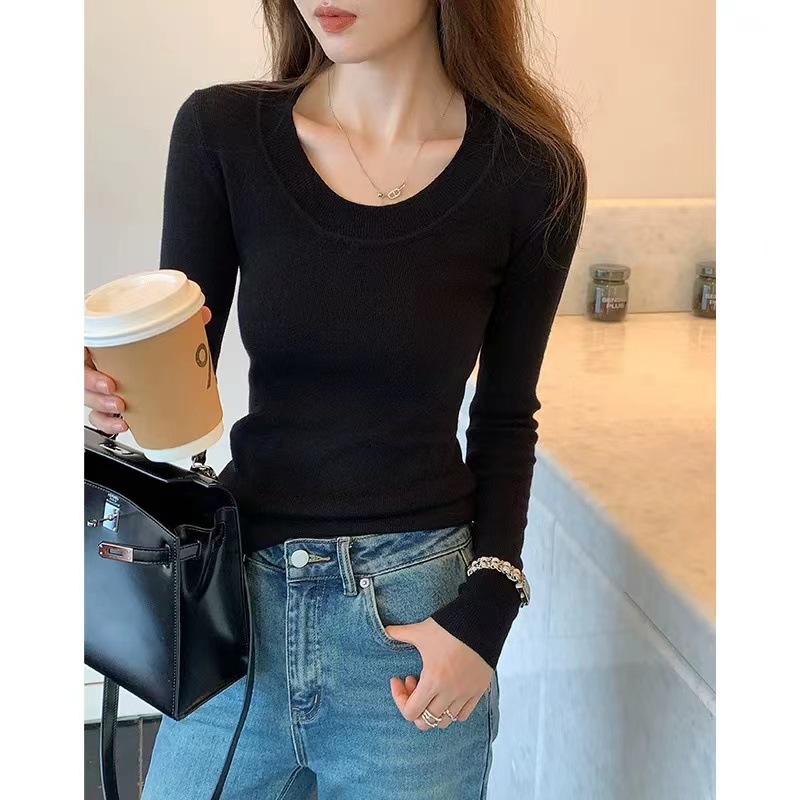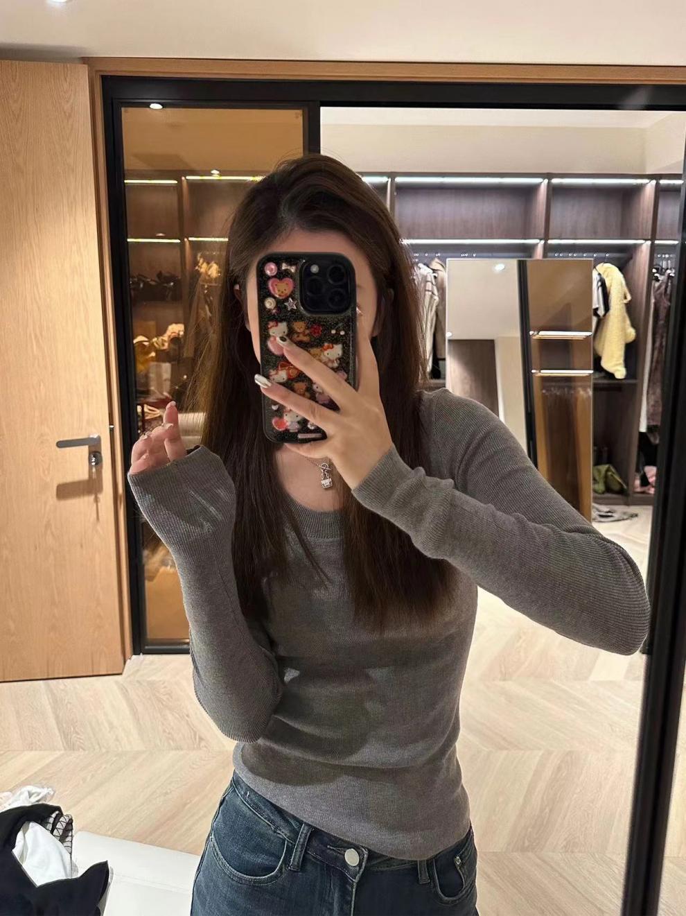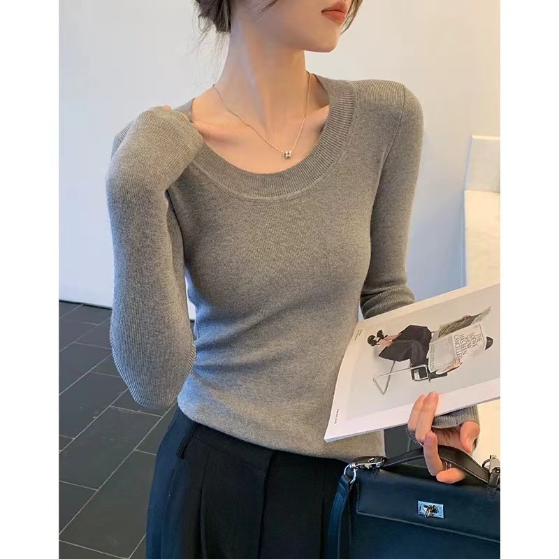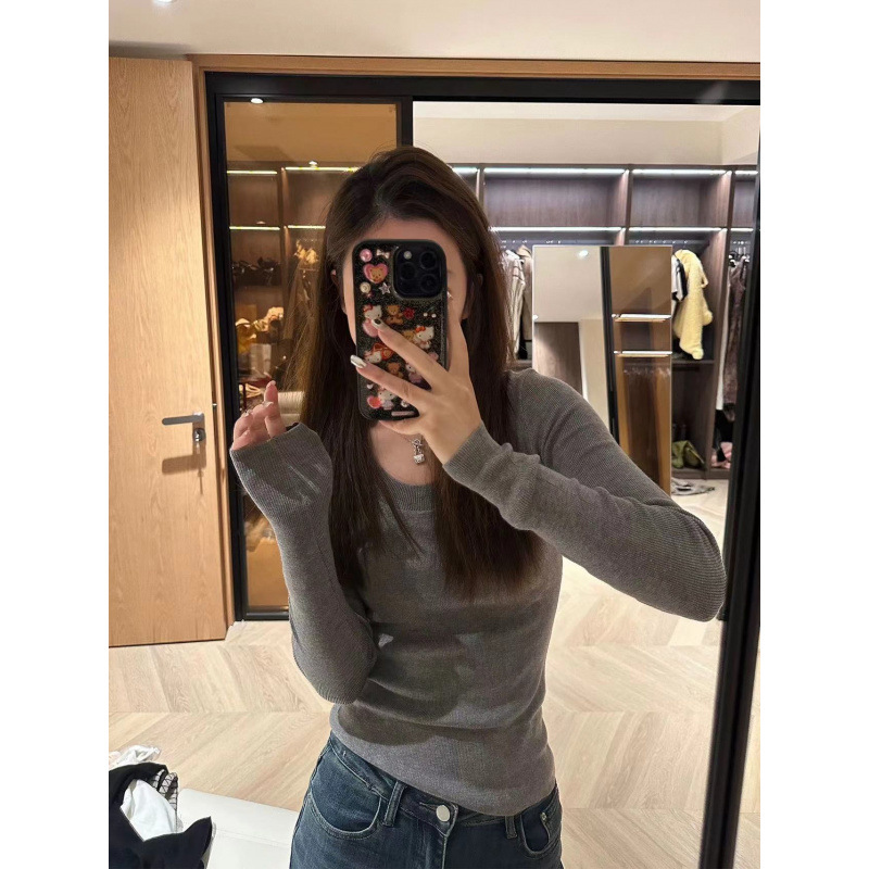 어깨 회색 니트 베이스 셔츠 여자 가을 및 겨울 올 매치 간단한 한국 스타일 슬림 핏 슬림 라운드 넥 긴팔 탑스토어 가기