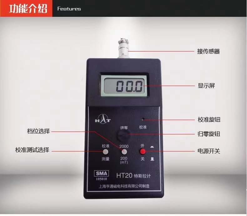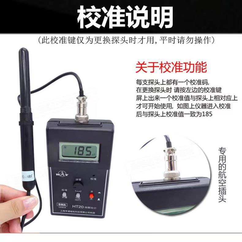 HT20系列便携式数字高斯计/特斯拉计可用于测量直流磁场、交流磁场、辐射磁场等各类磁场的磁感应强度。该便携式高斯计可以随身携带,量程范围宽,操作方便,液晶显示清晰。