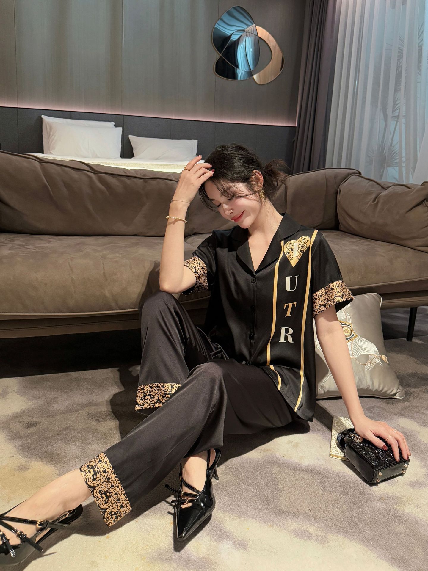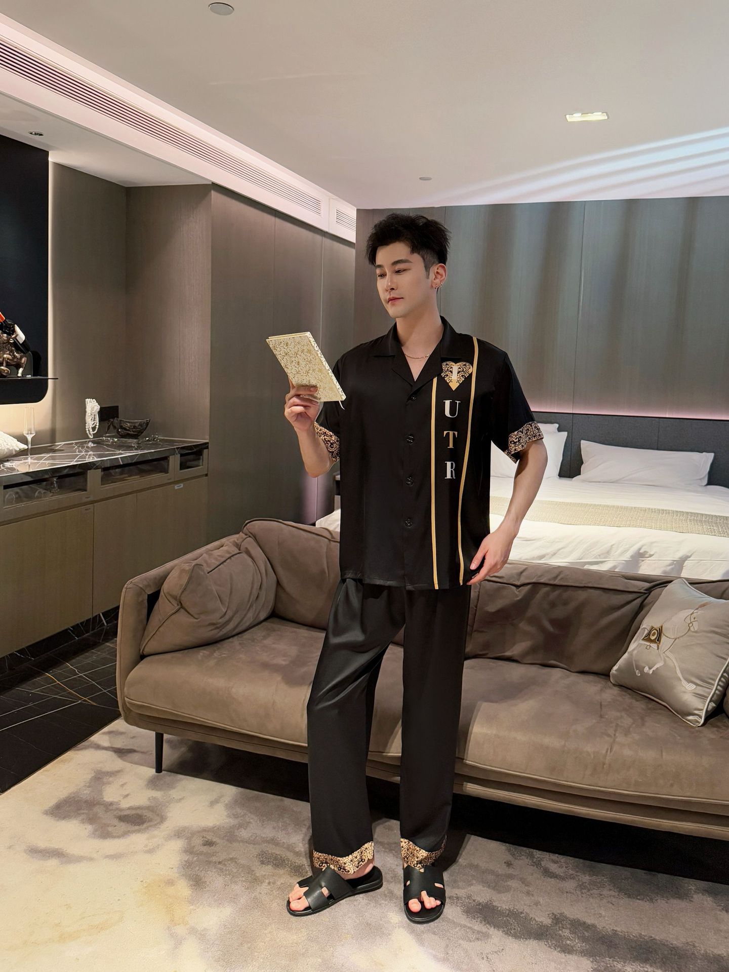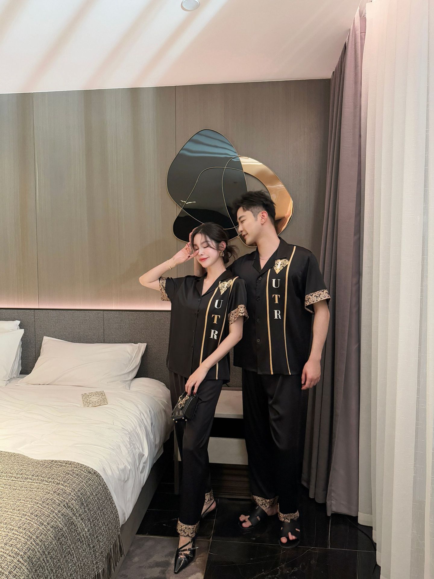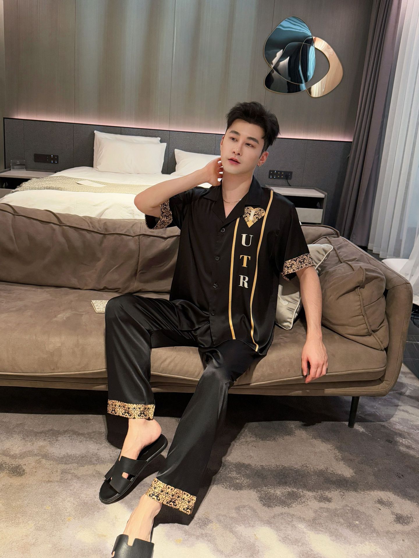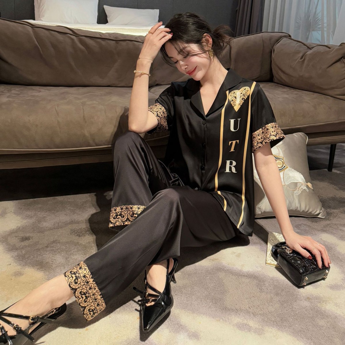 여름 반팔 아이스 실크 잠옷 패션 캐주얼 사랑 인쇄 여성 세트 2025 새 커플 홈 의류 남성스토어 가기
