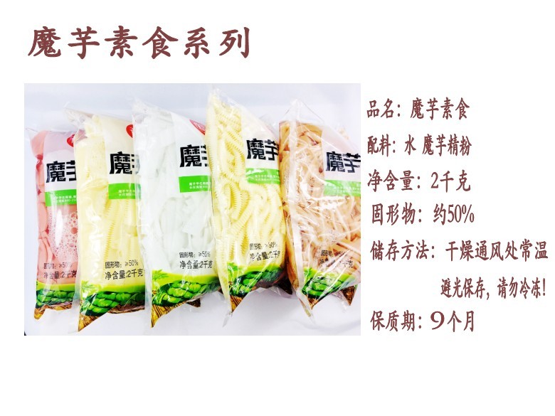 魔芋素食系列是含膳食纤维丰富的菜品,经深加工而成的魔芋仿荤素食。造型逼真,口感入口润滑,有嚼劲,类似肉皮冻。具有低热量的特点,可作为代餐饱腹的理想健康食品。可凉拌 火锅 麻辣烫 卤菜 串串 等制作各种美食。