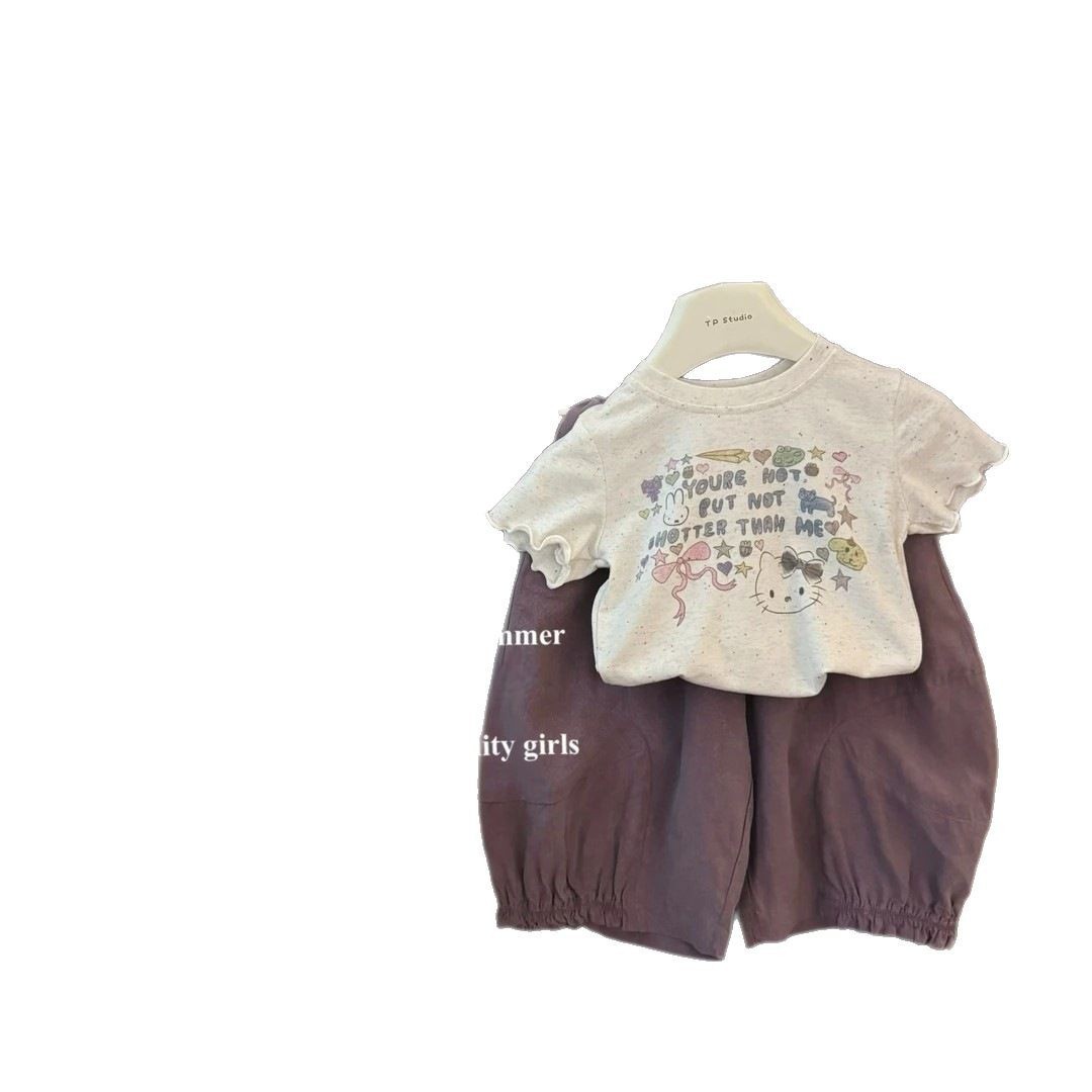 [통 싱위안] 자기 보유! 아기 소녀 유치원 KT 귀여운 탑 반팔 티셔츠 느슨한 블루머스 세트