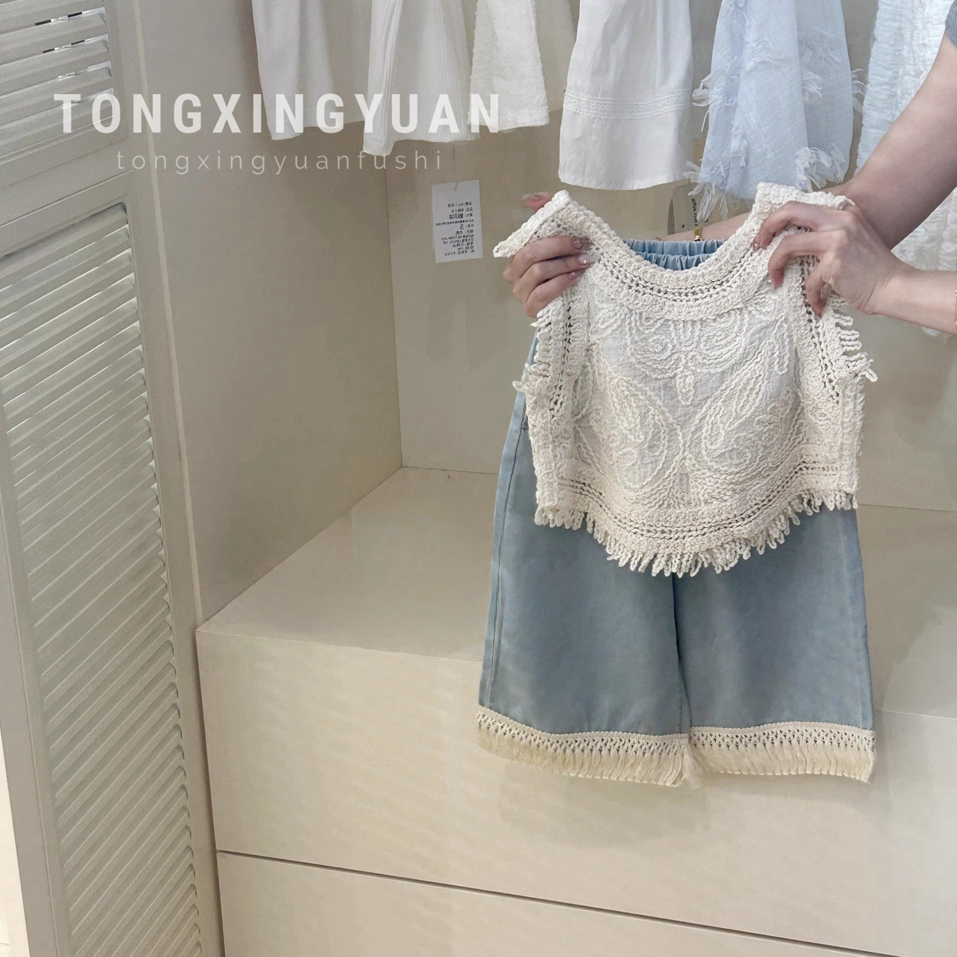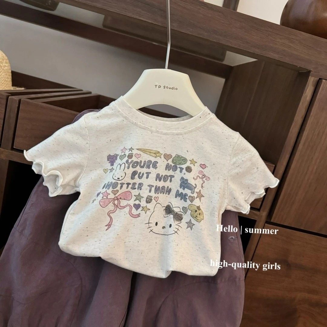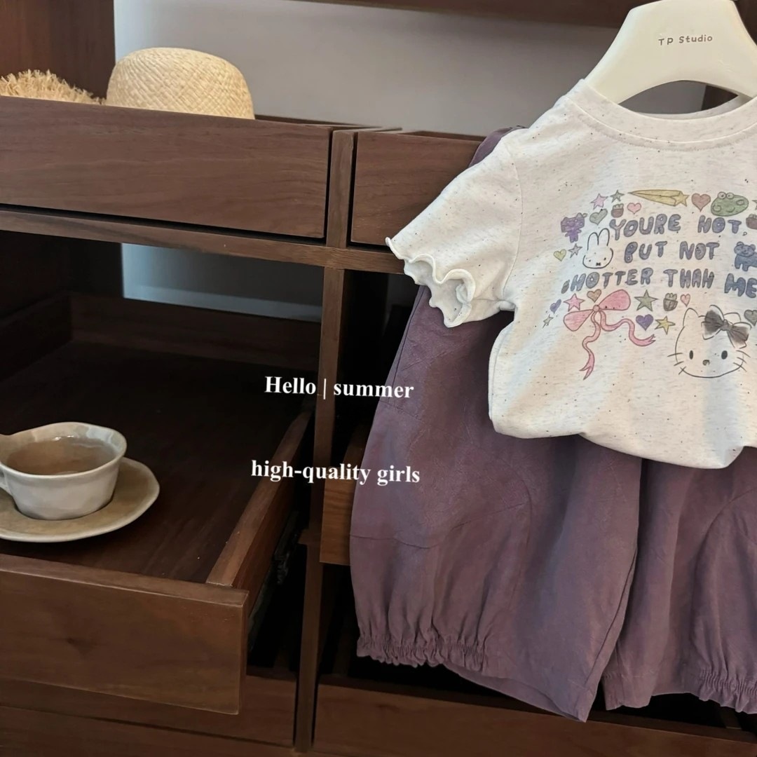 [통 싱위안] 자기 보유! 아기 소녀 유치원 KT 귀여운 탑 반팔 티셔츠 느슨한 블루머스 세트스토어 가기