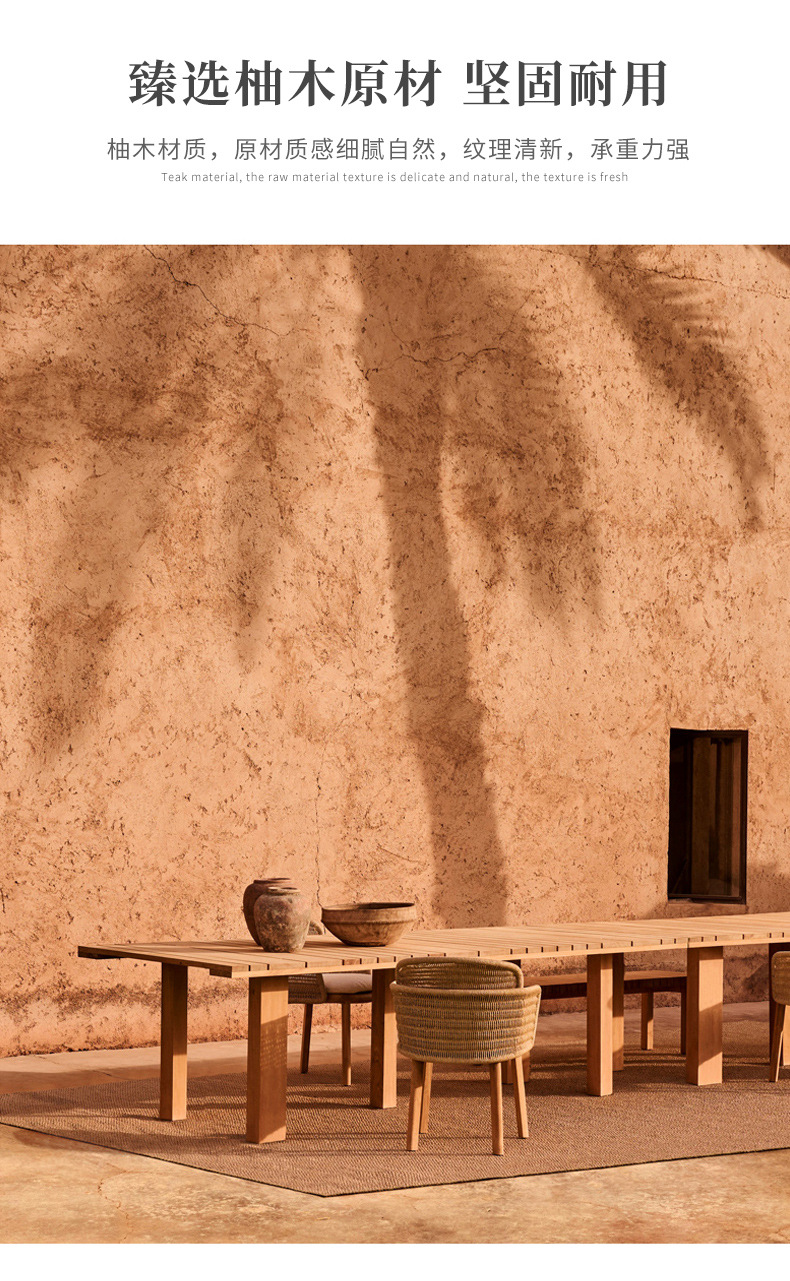 야외 테이블과 의자 식탁 식당 의자 등나무 가구 정원 빌라 안뜰 야외 방수 긴 테이블 단단한 나무 티크 조합