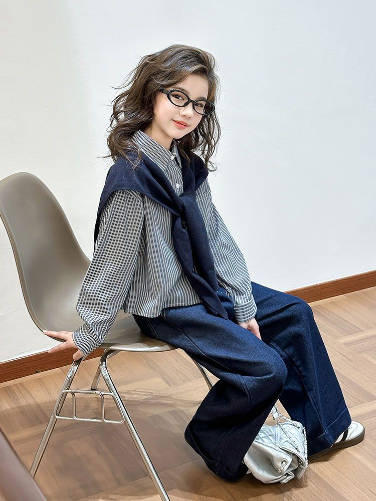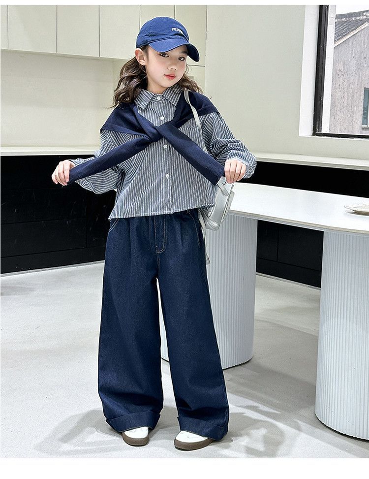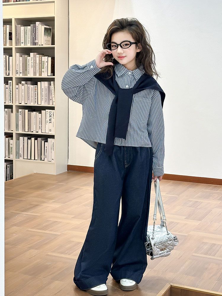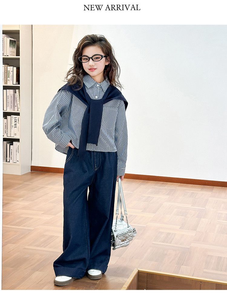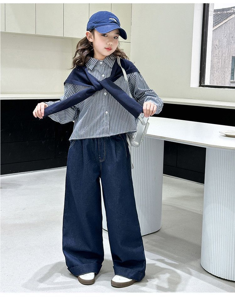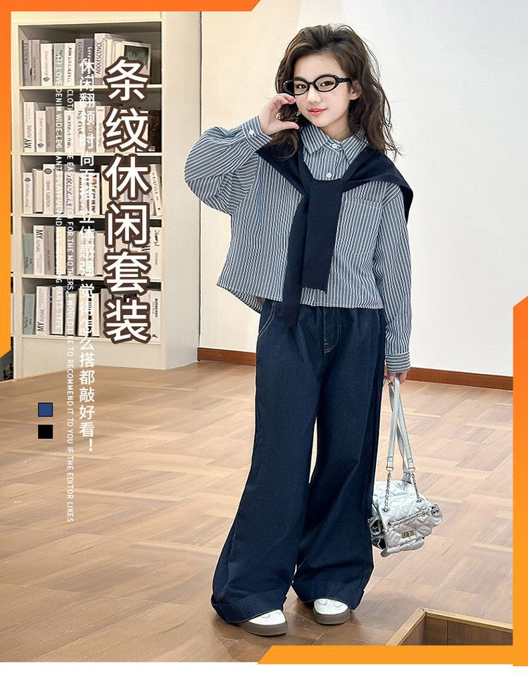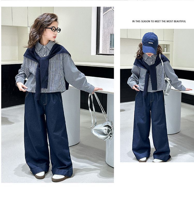 소녀 세트 가을 2025 새로운 큰 어린이 서양식 목도리 셔츠 어린이 넓은 다리 청바지 조수스토어 가기