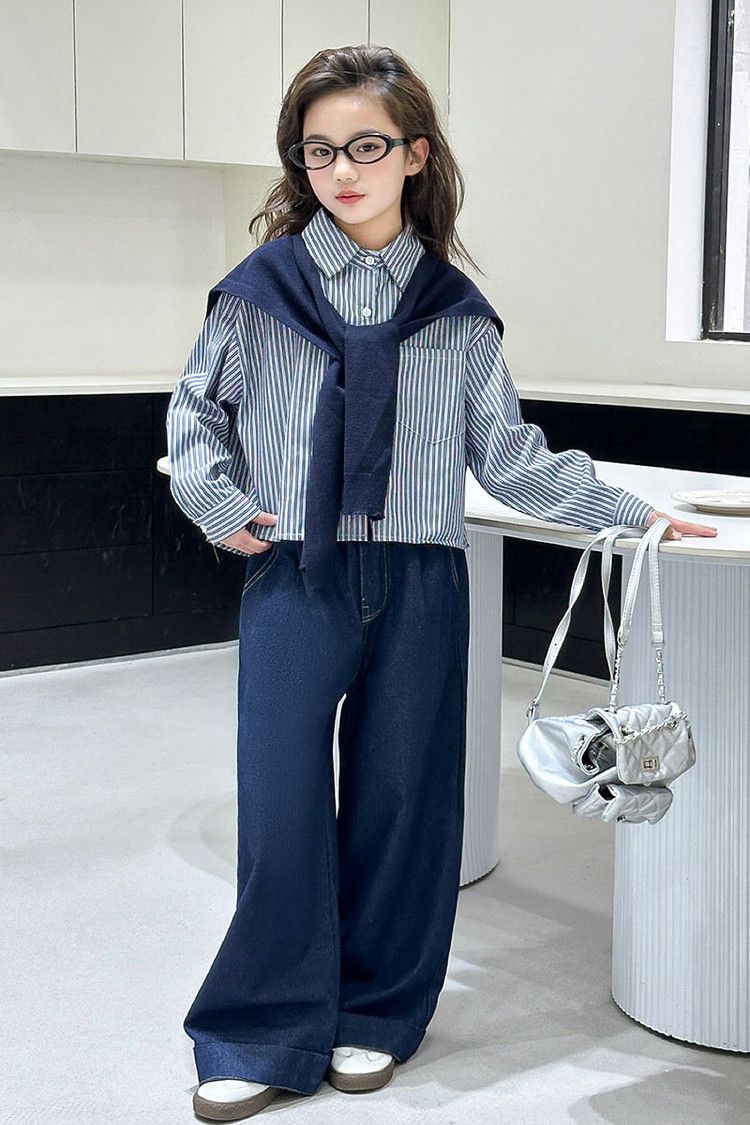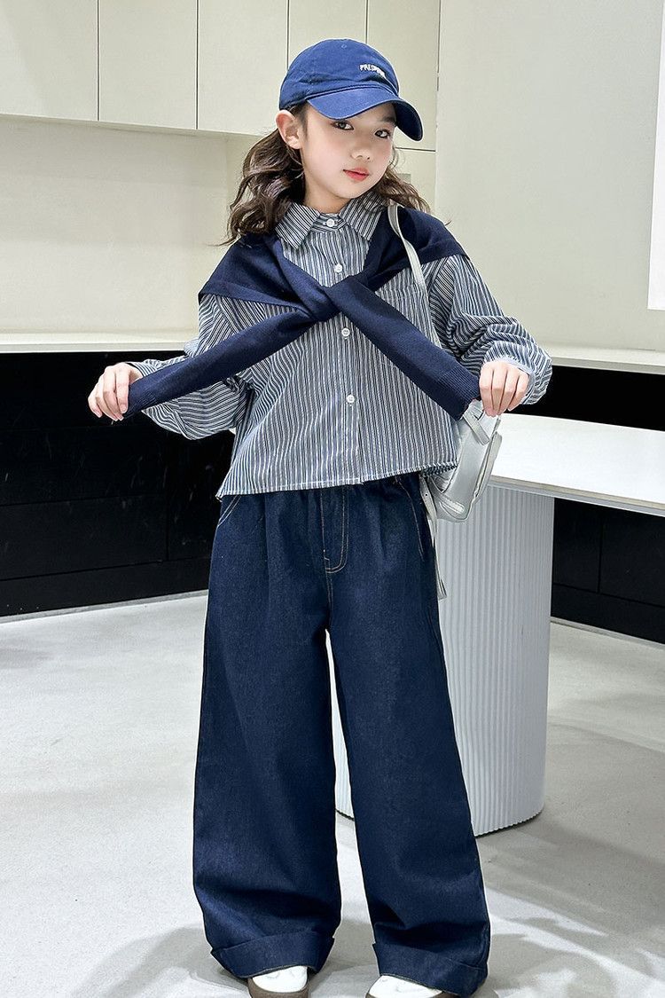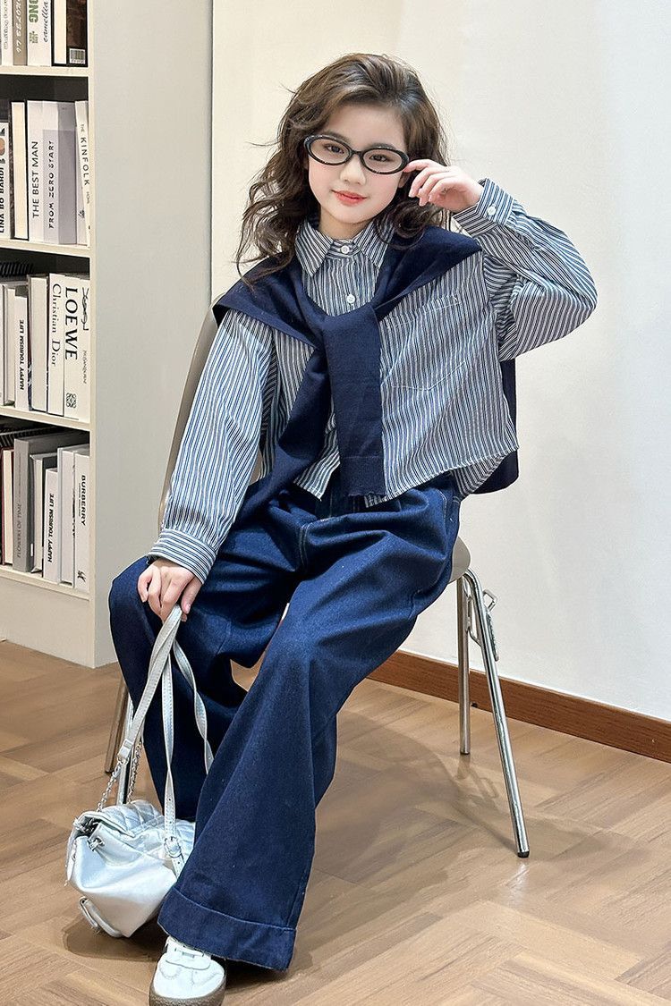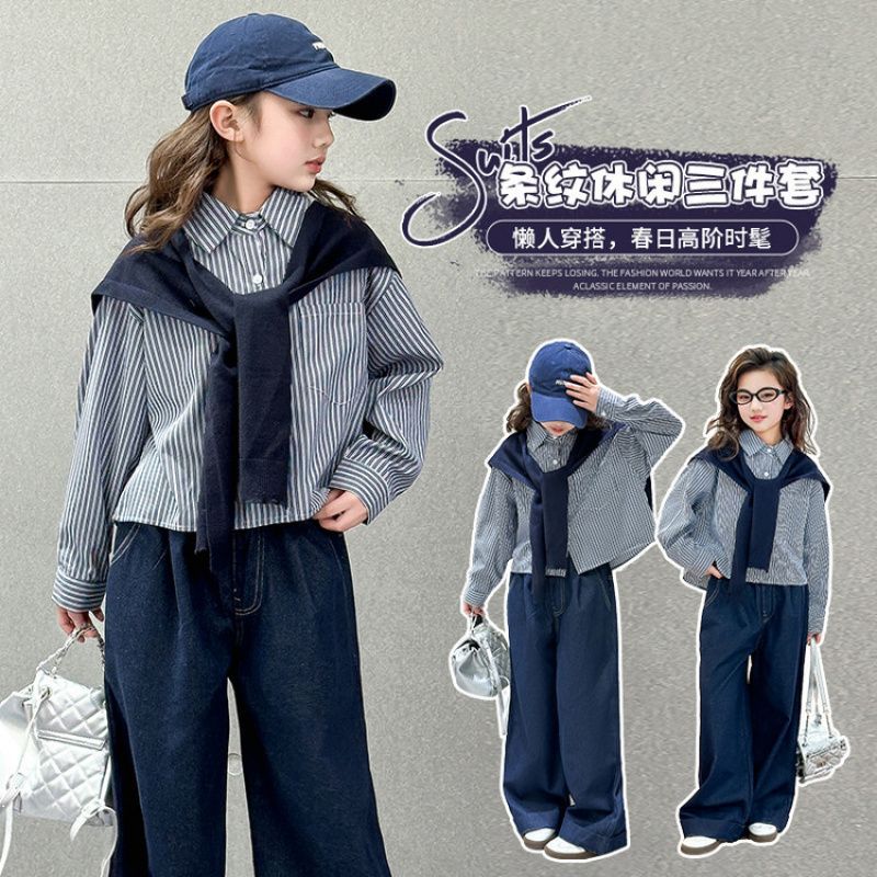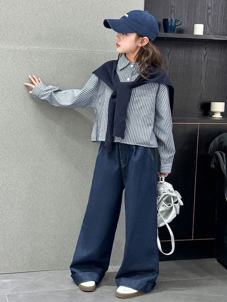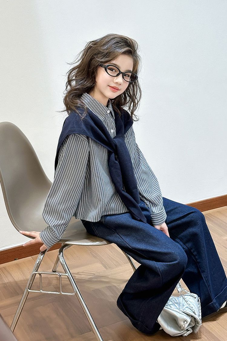 소녀 세트 가을 2025 새로운 큰 어린이 서양식 목도리 셔츠 어린이 넓은 다리 청바지 조수스토어 가기