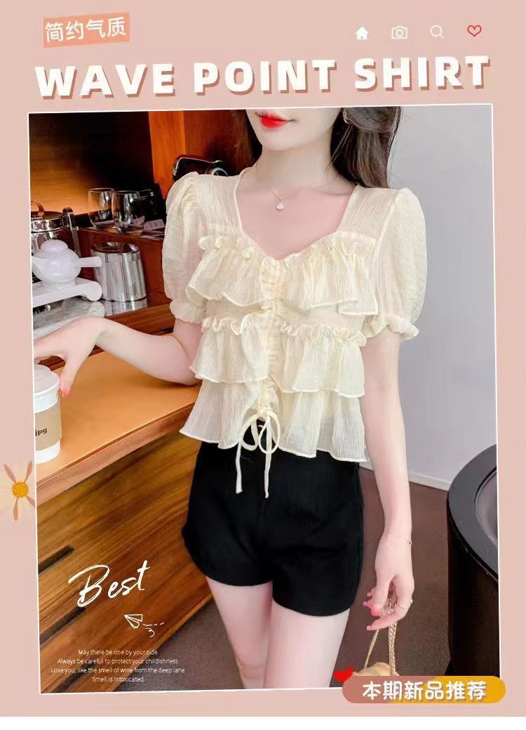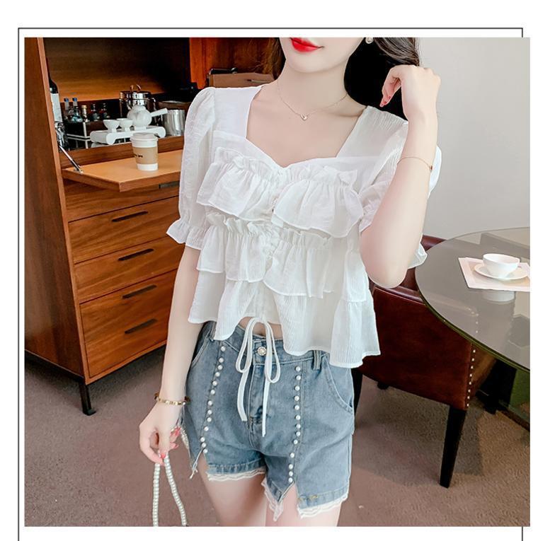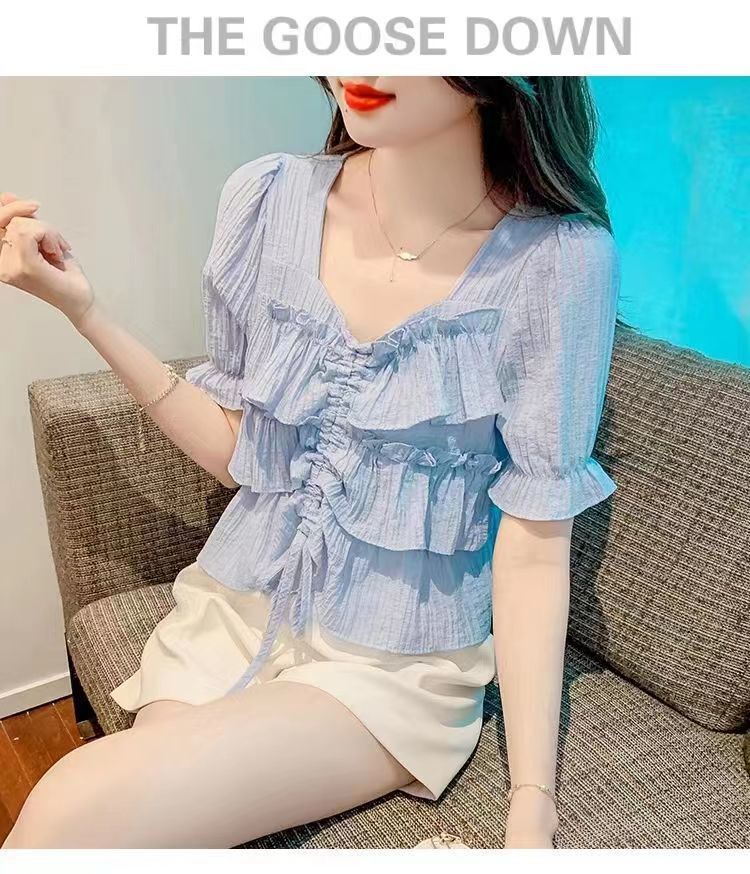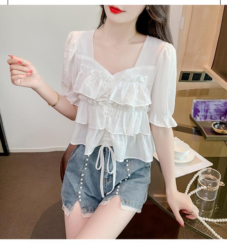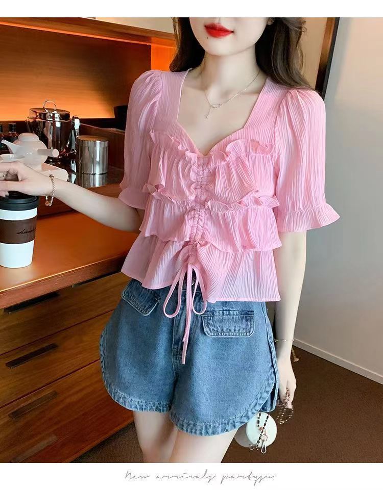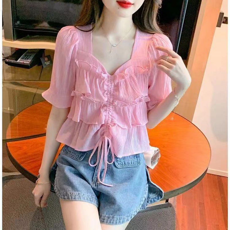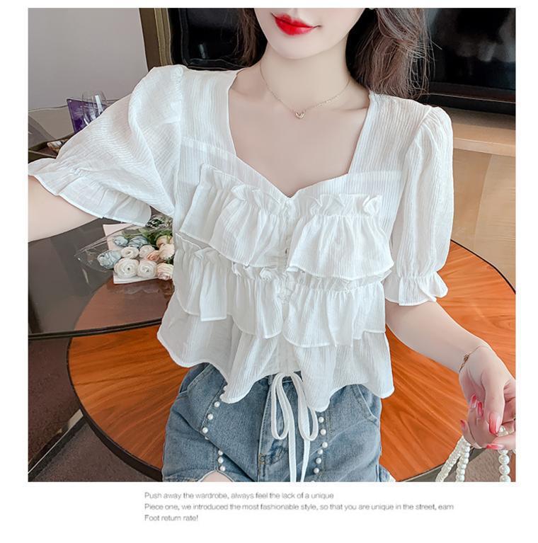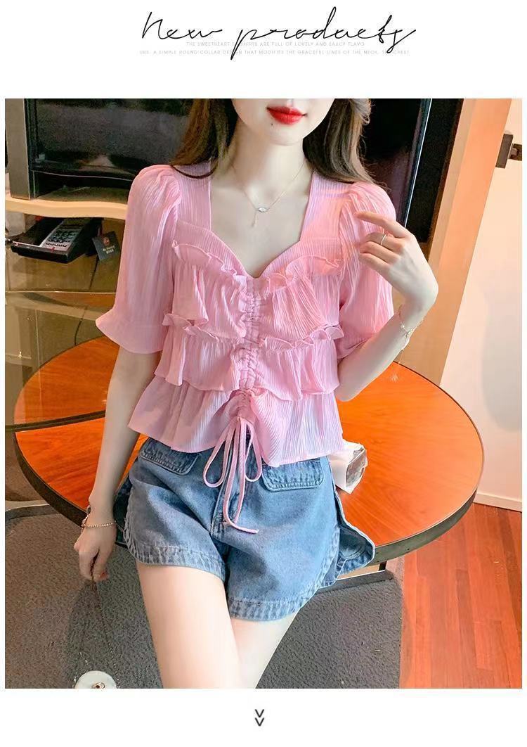 패션 스퀘어 칼라 러플 쉬폰 셔츠 여성의 2024 년 여름 새로운 달콤한 퍼프 슬리브 드로우 스트링 탑스토어 가기