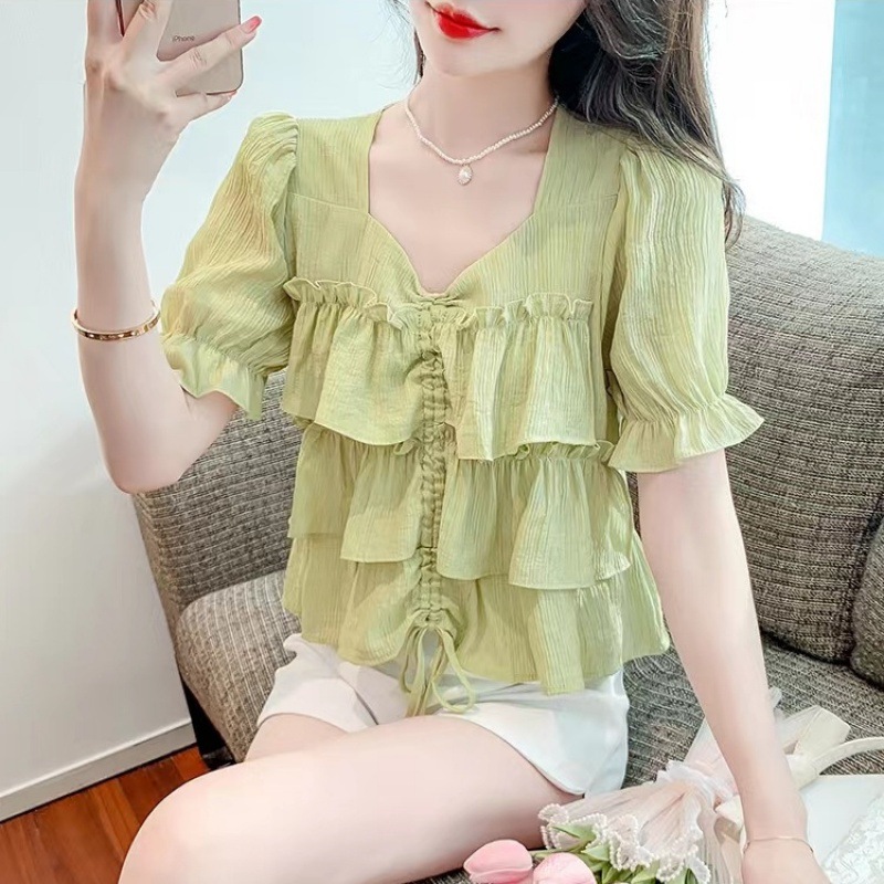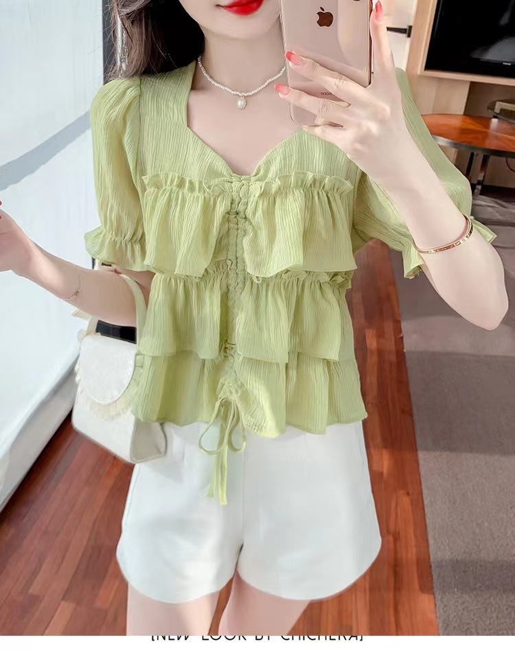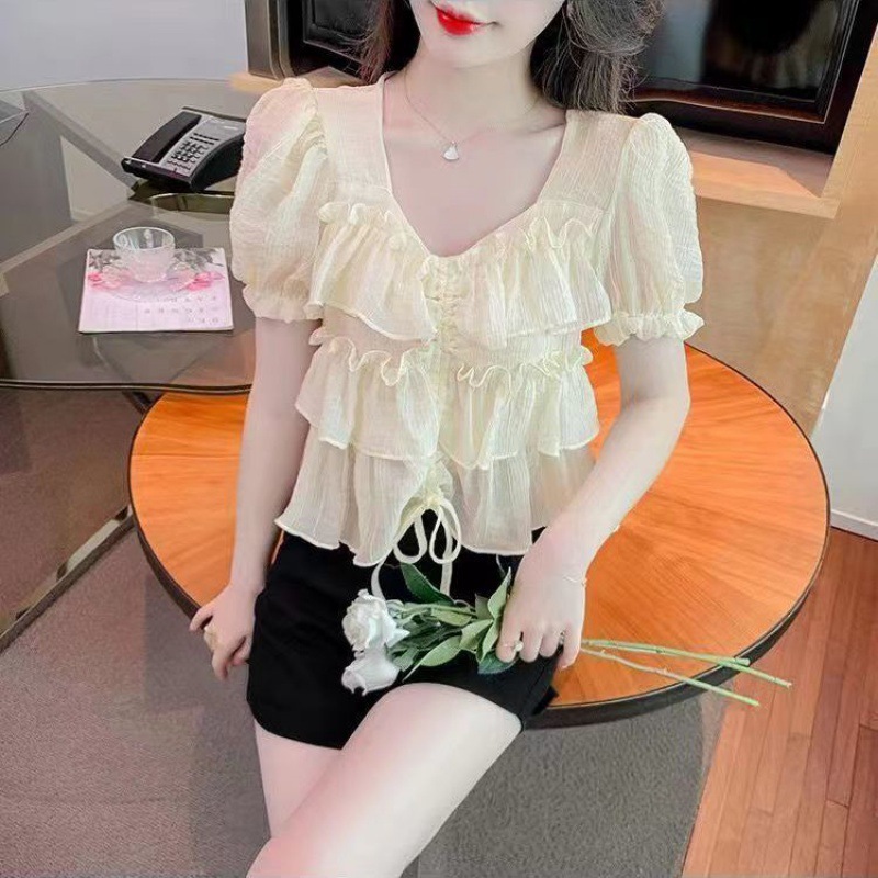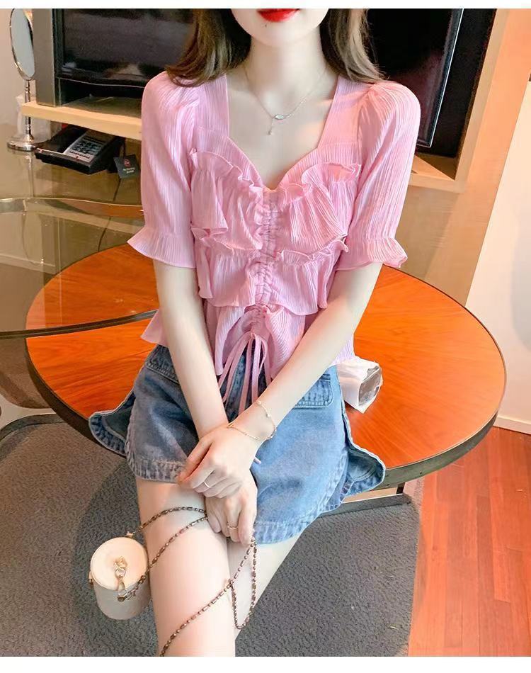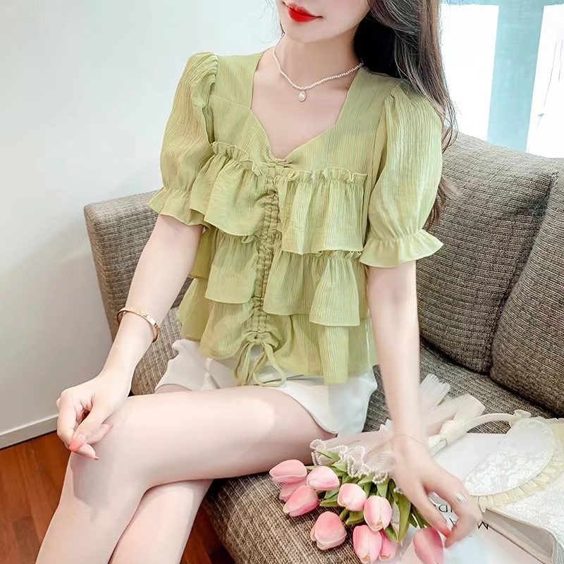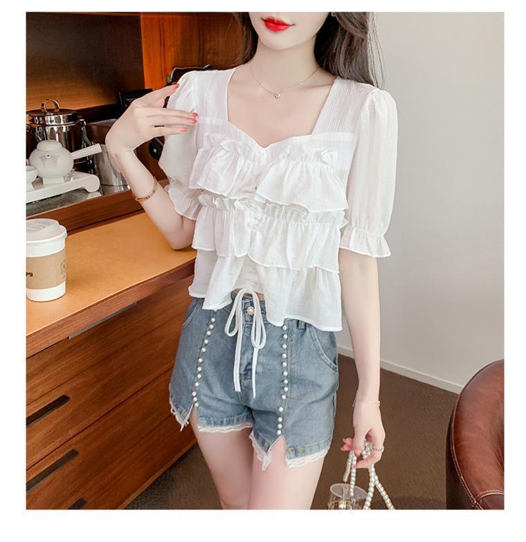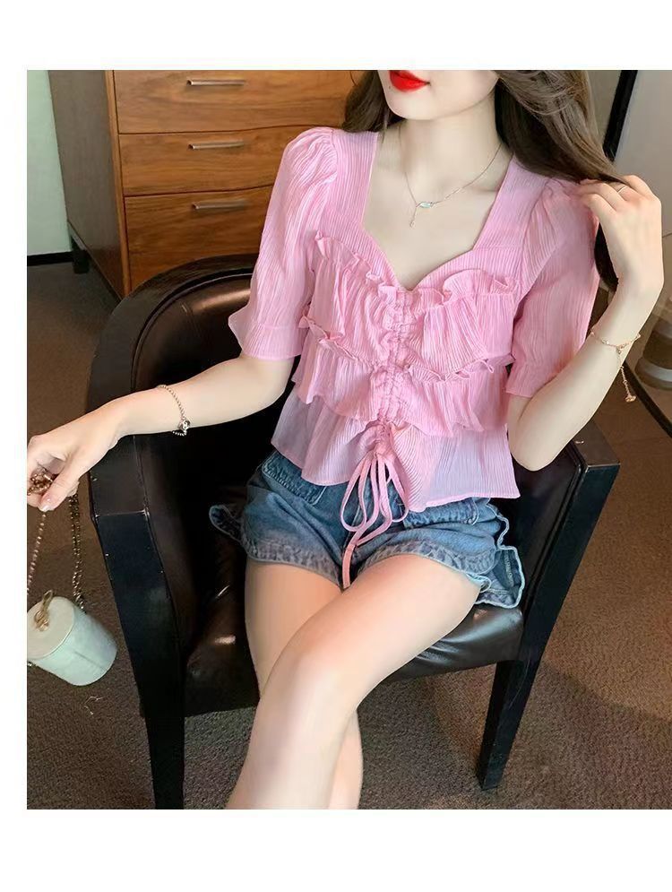 패션 스퀘어 칼라 러플 쉬폰 셔츠 여성의 2024 년 여름 새로운 달콤한 퍼프 슬리브 드로우 스트링 탑스토어 가기