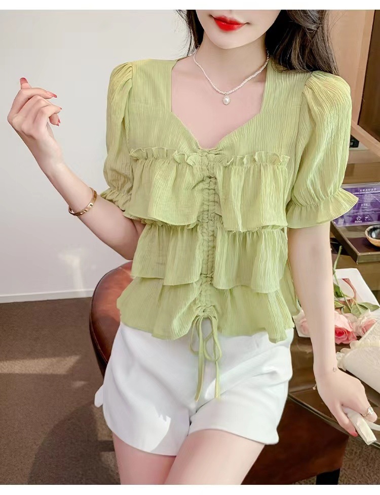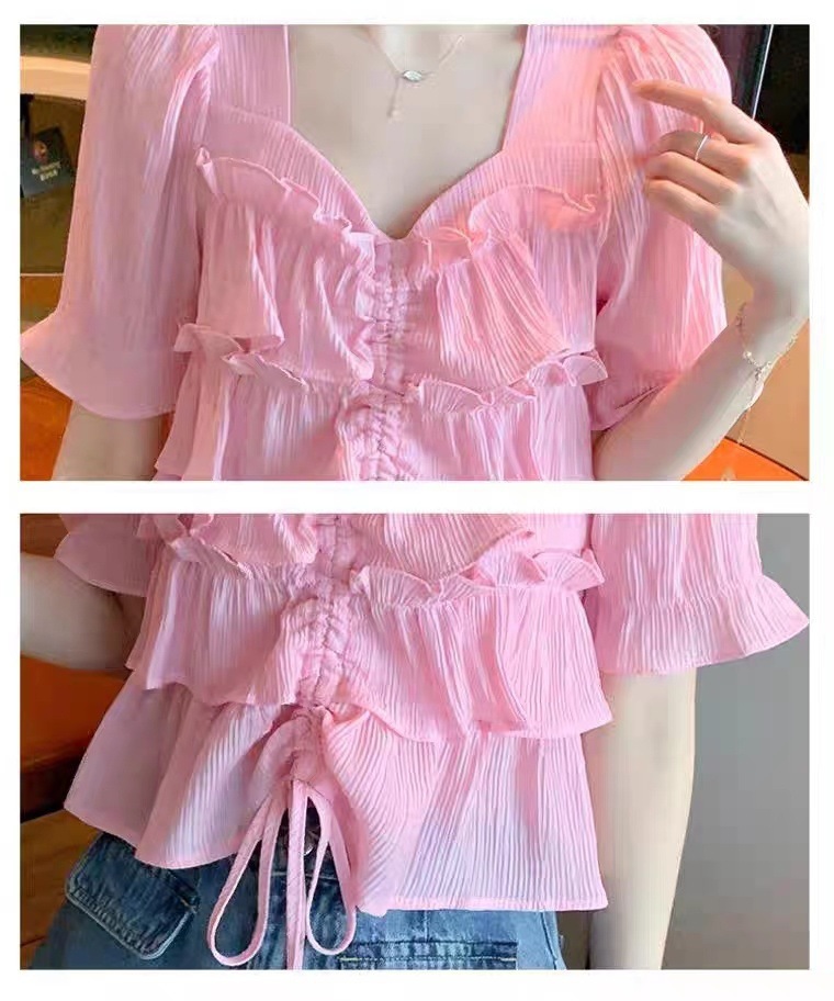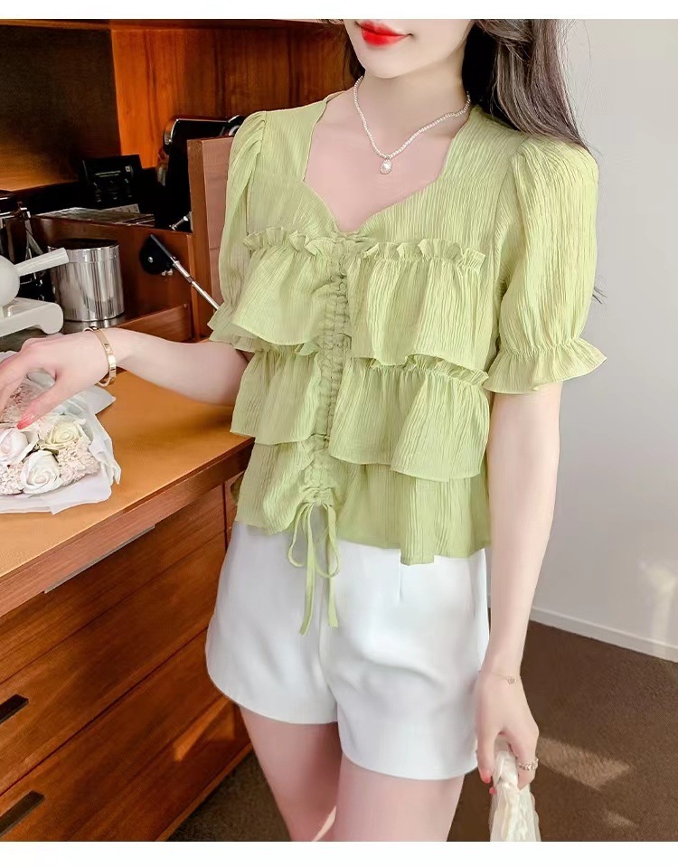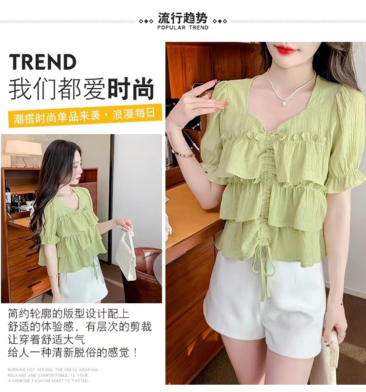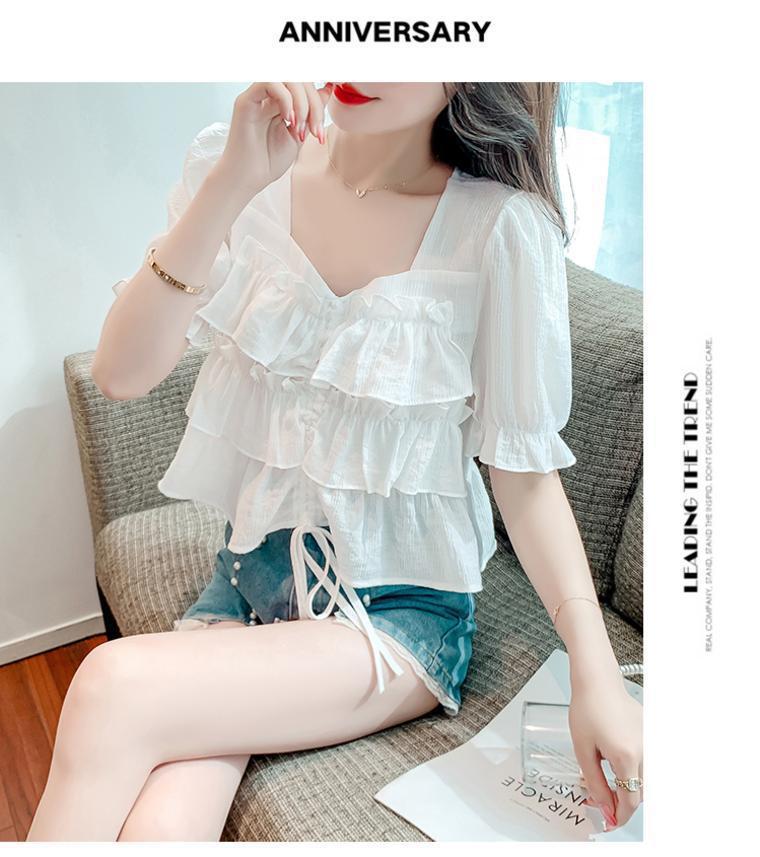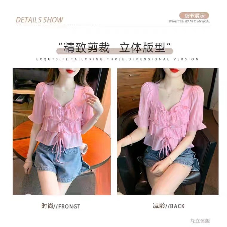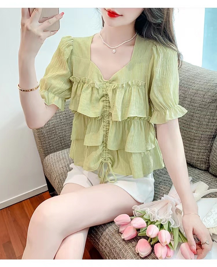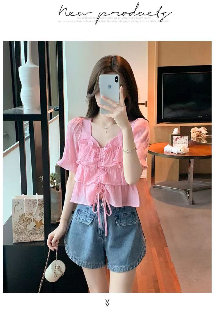 패션 스퀘어 칼라 러플 쉬폰 셔츠 여성의 2024 년 여름 새로운 달콤한 퍼프 슬리브 드로우 스트링 탑스토어 가기