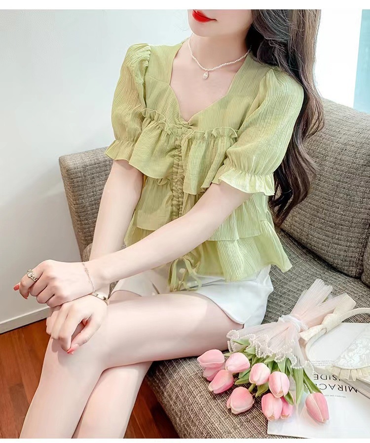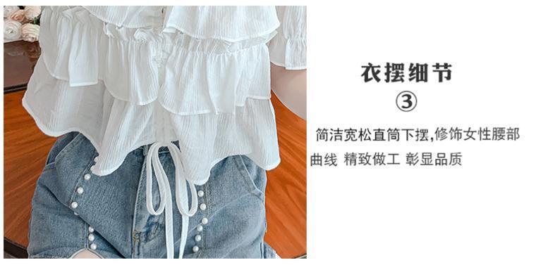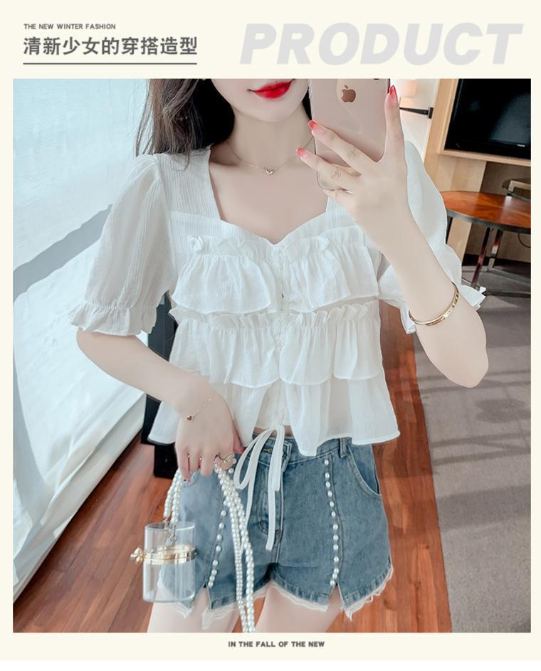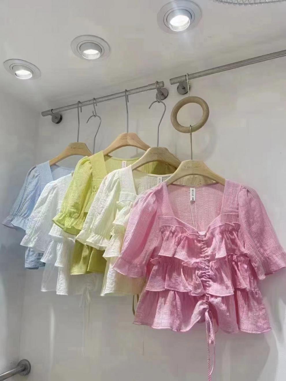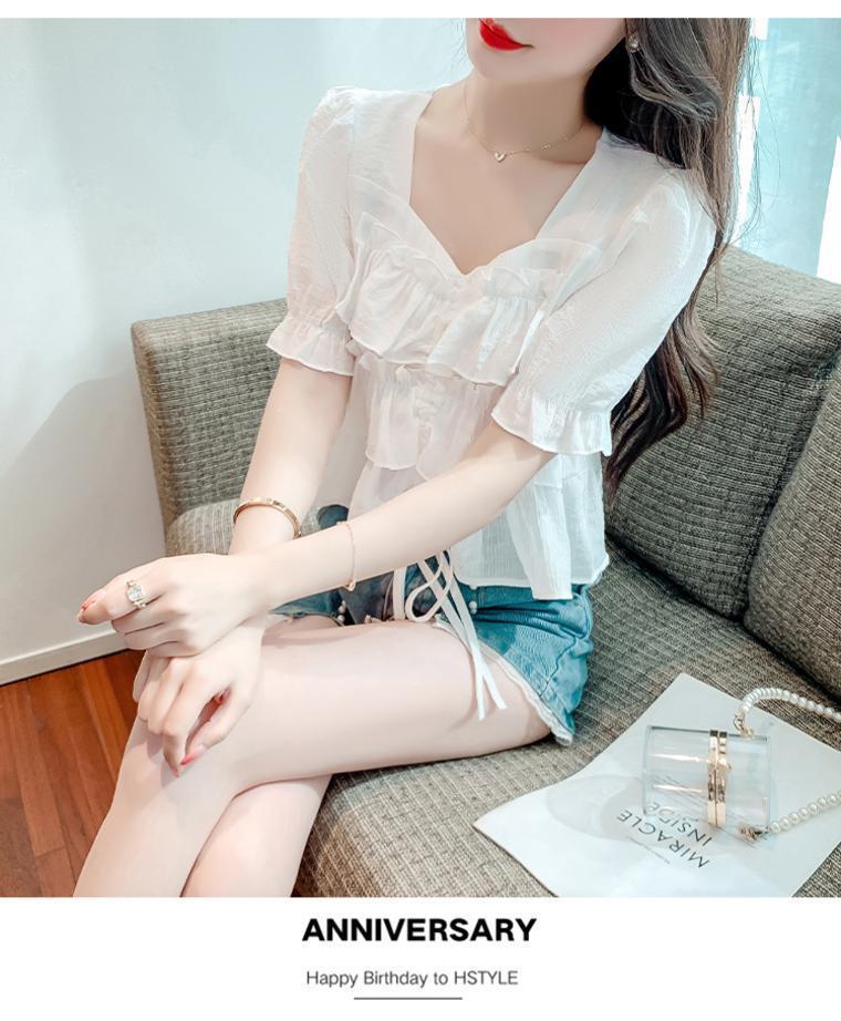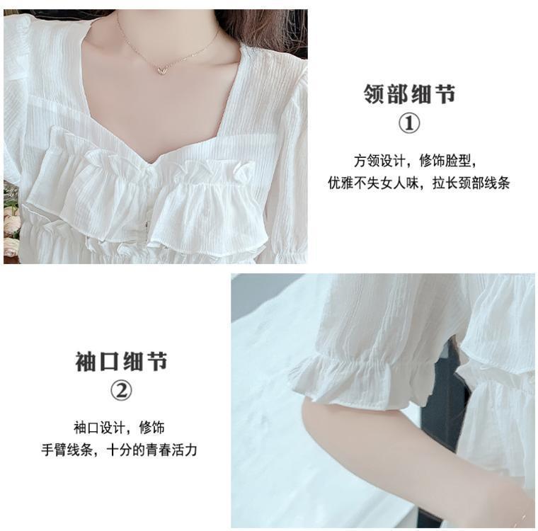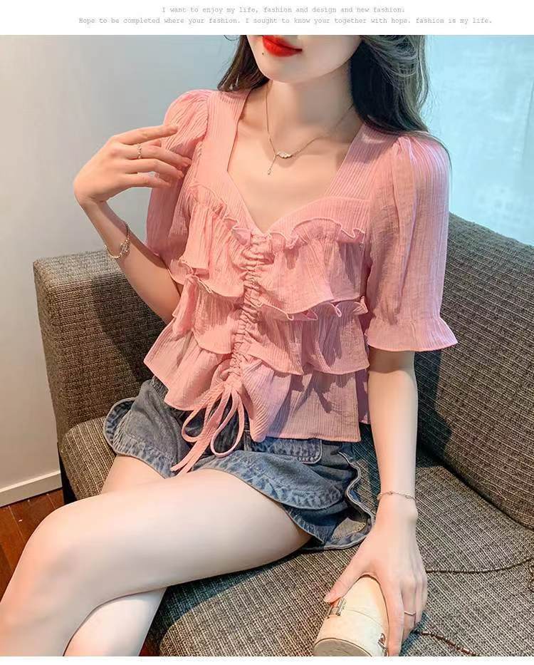 패션 스퀘어 칼라 러플 쉬폰 셔츠 여성의 2024 년 여름 새로운 달콤한 퍼프 슬리브 드로우 스트링 탑스토어 가기