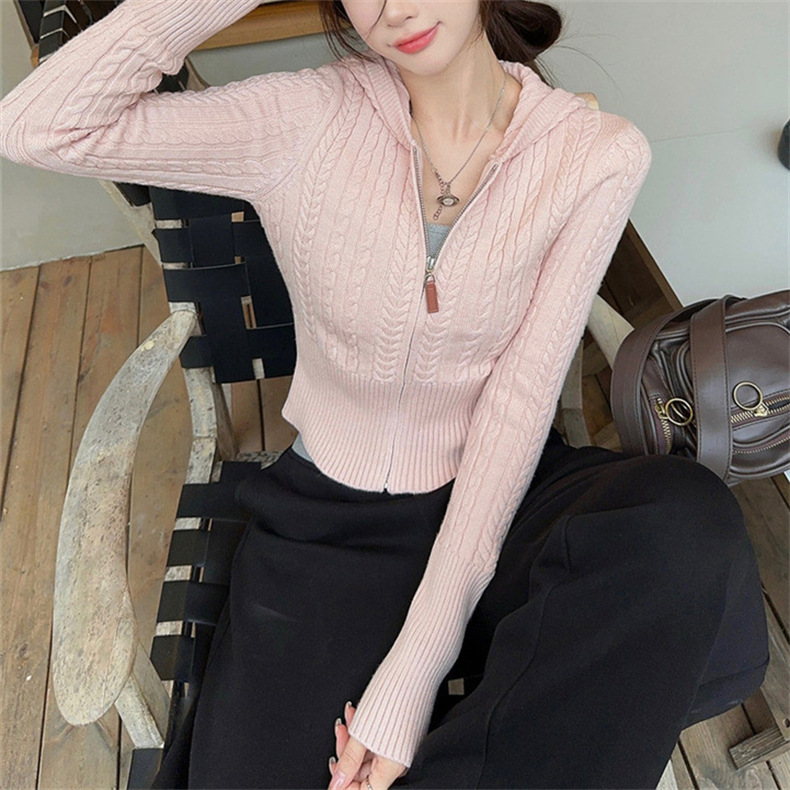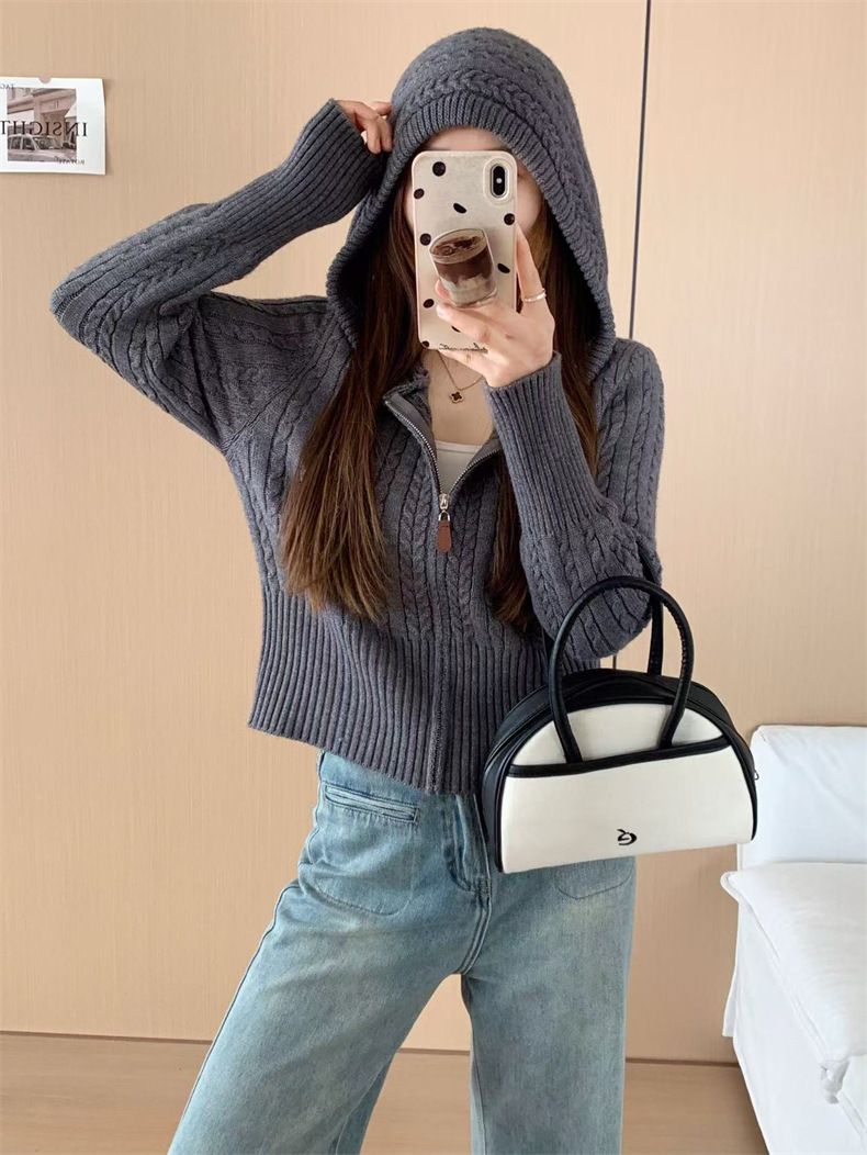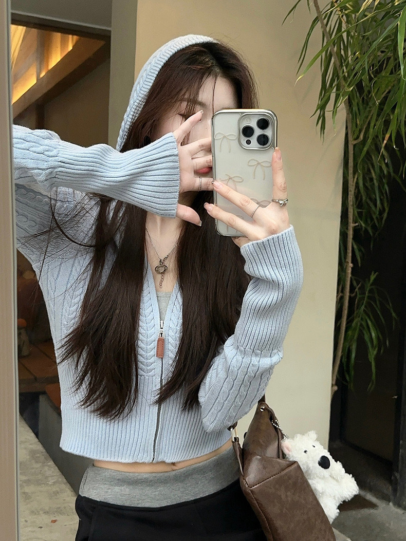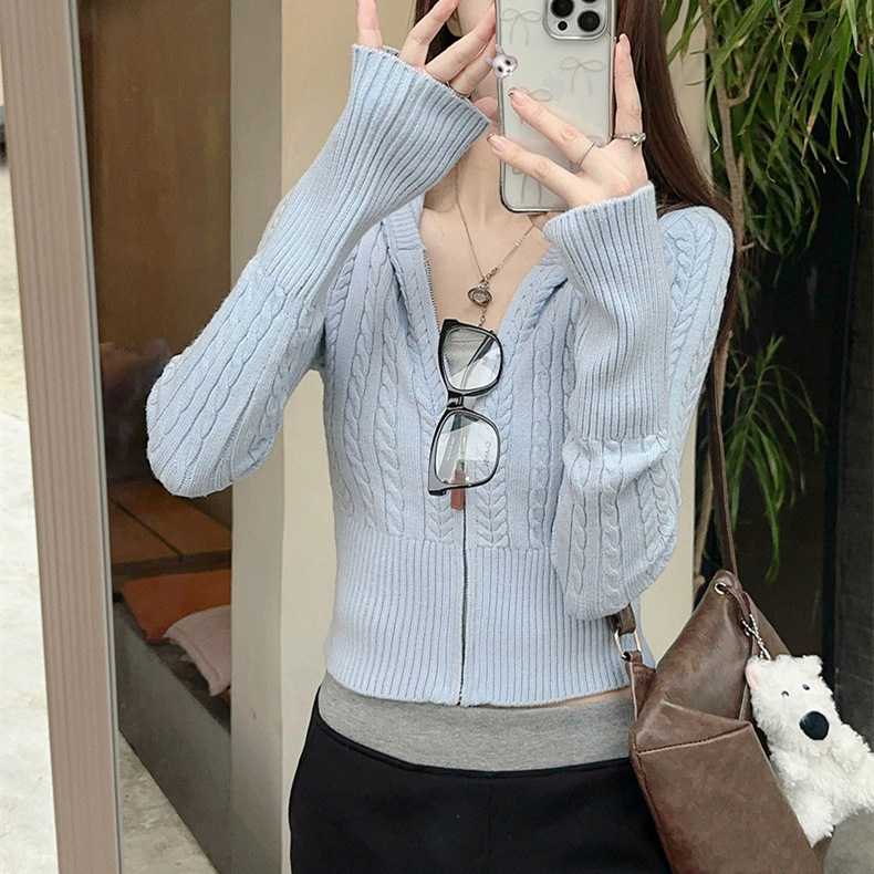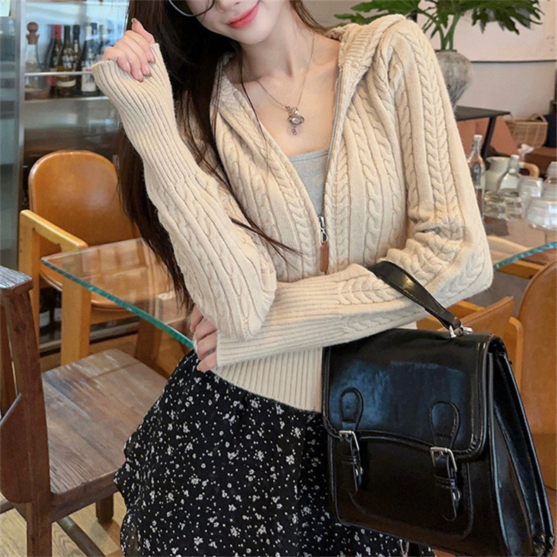 부드러운 바람 트위스트 후드 니트 카디건 여성 2025 년 봄 새로운 슬림핏 슬리밍 쇼트 스웨터 코트 탑스토어 가기