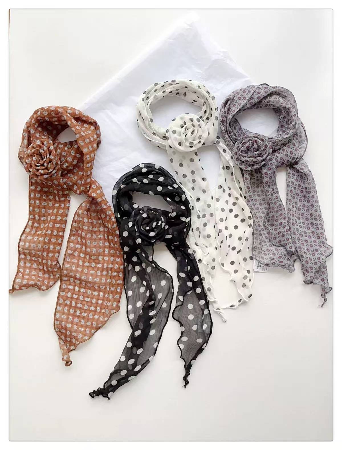 봄과 여름 새로운 프랑스 쉬폰 인쇄 실크 스카프 얇은 올매치 우아한 목 스카프 타이 붕대 머리 장식 스카프