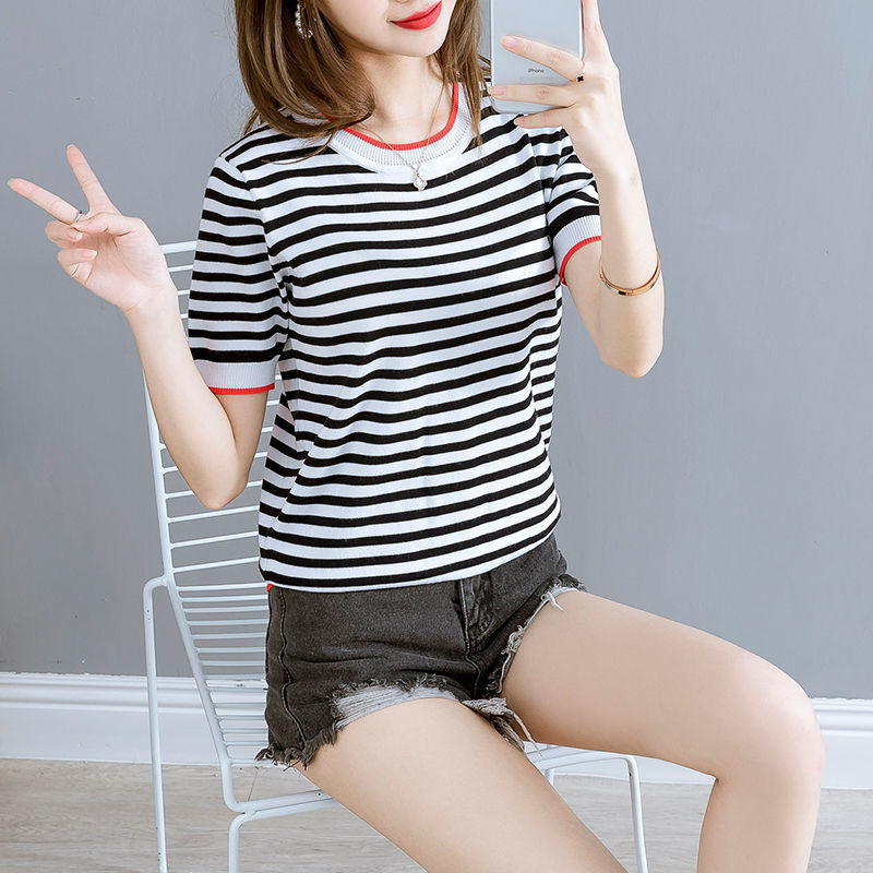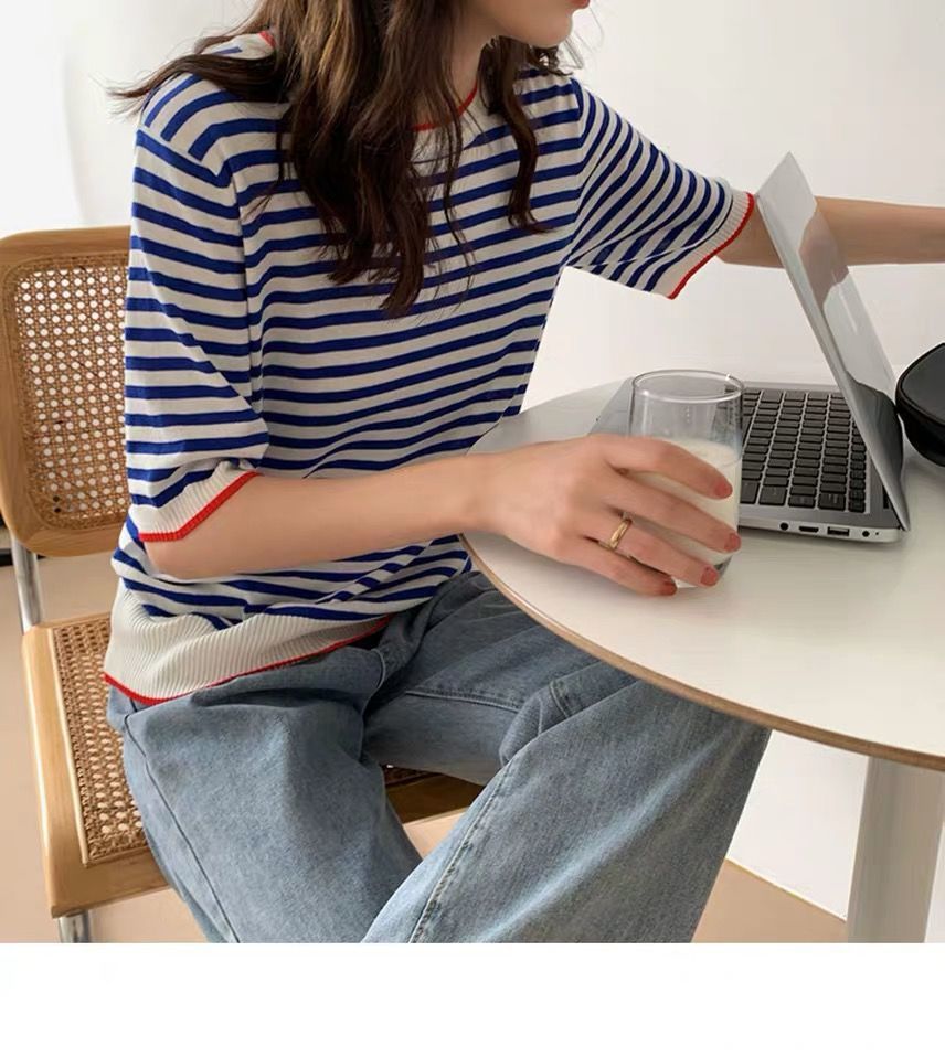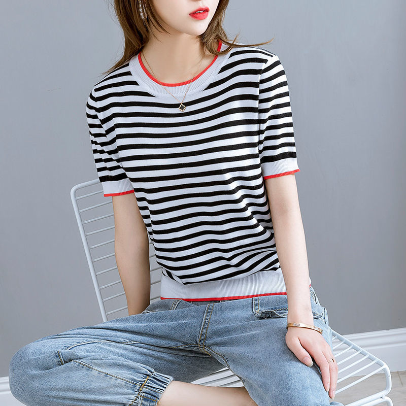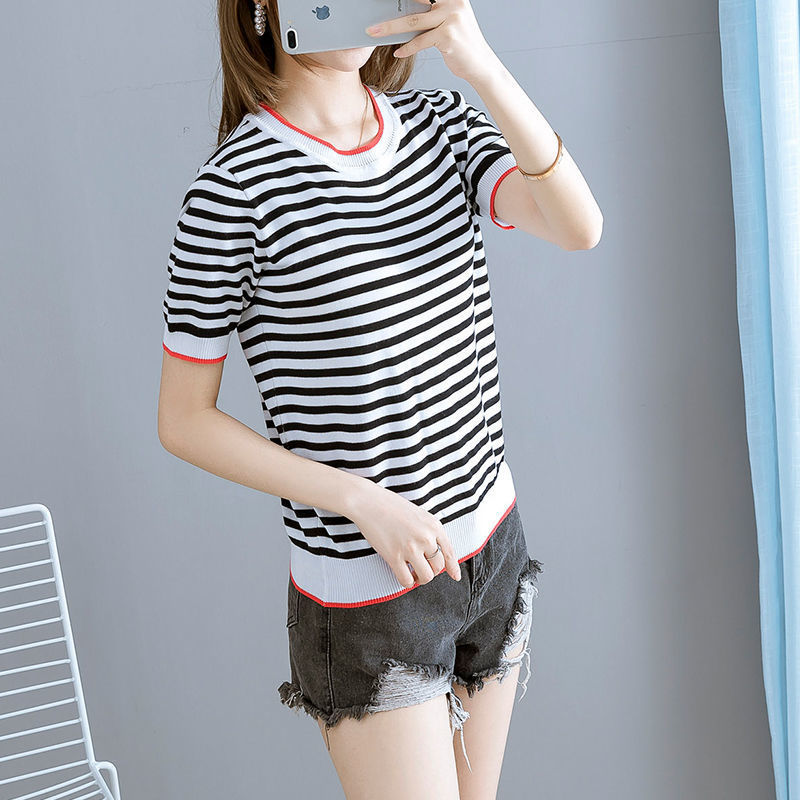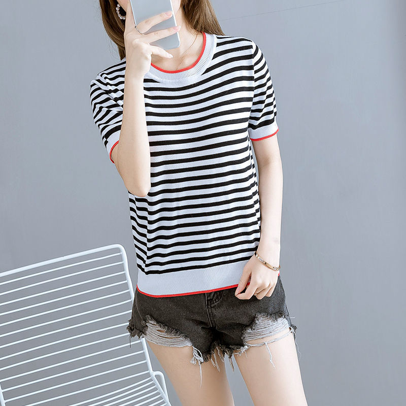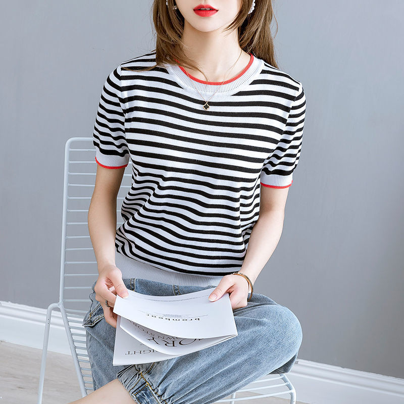 여름 새로운 스타일 신선한 느슨한 줄무늬 셔츠 여성용 스타일 니트 반팔 유행 아이스 실크 얇은 셔츠스토어 가기