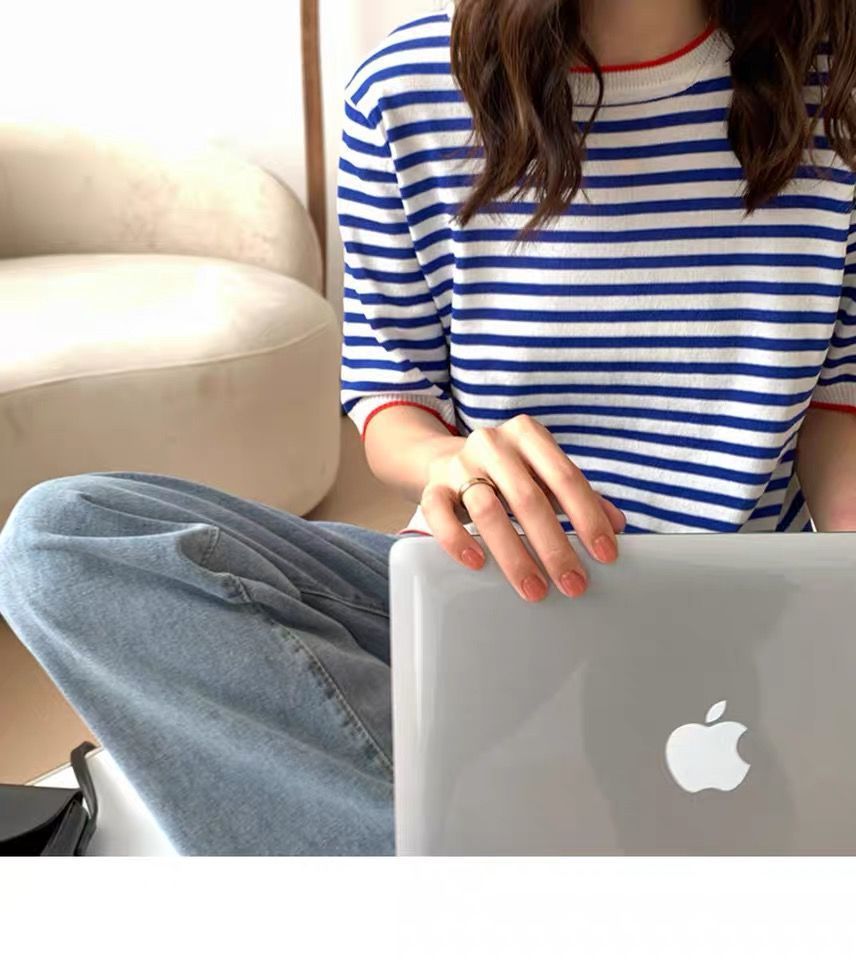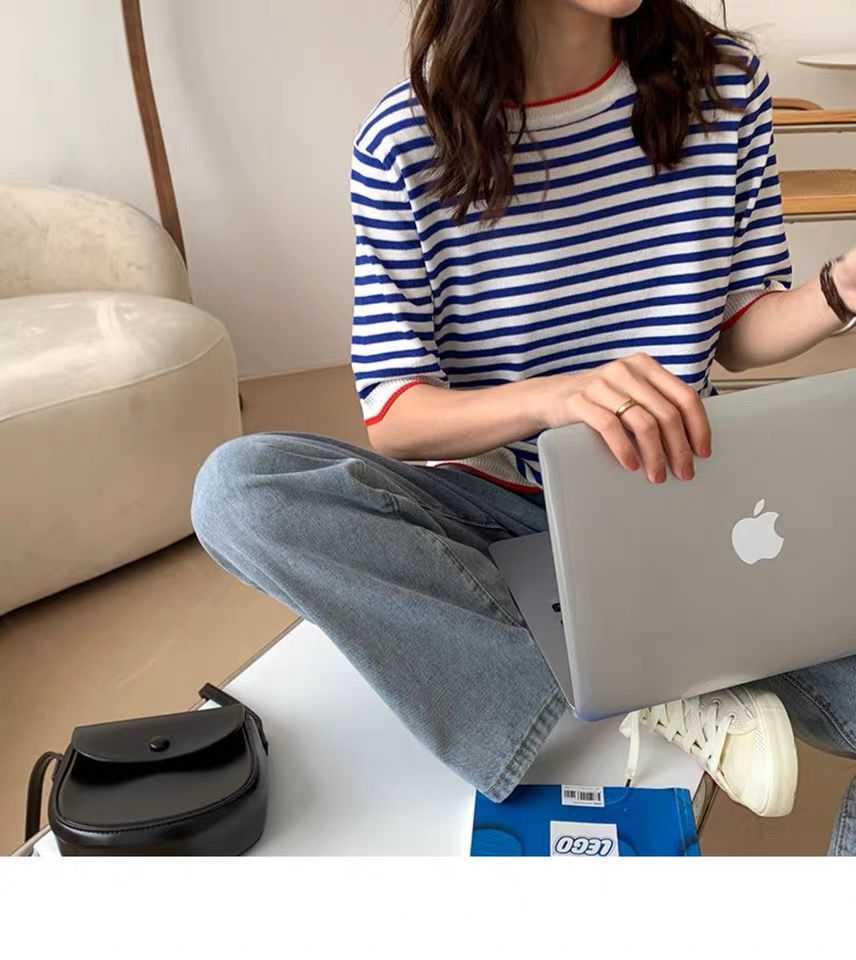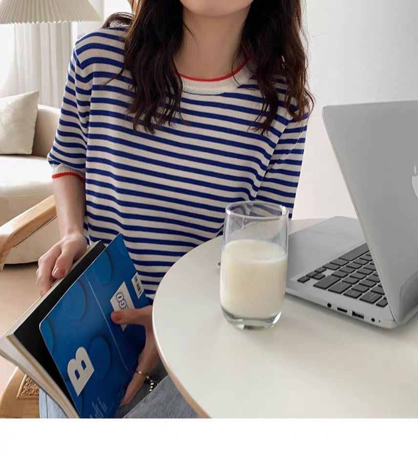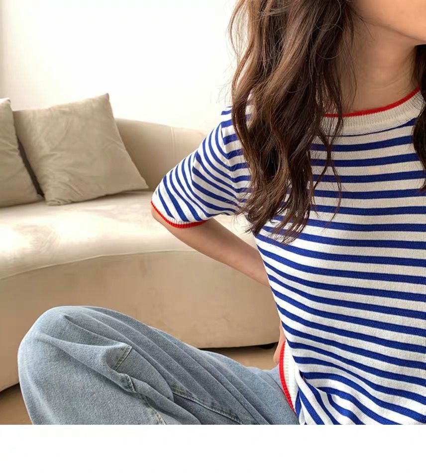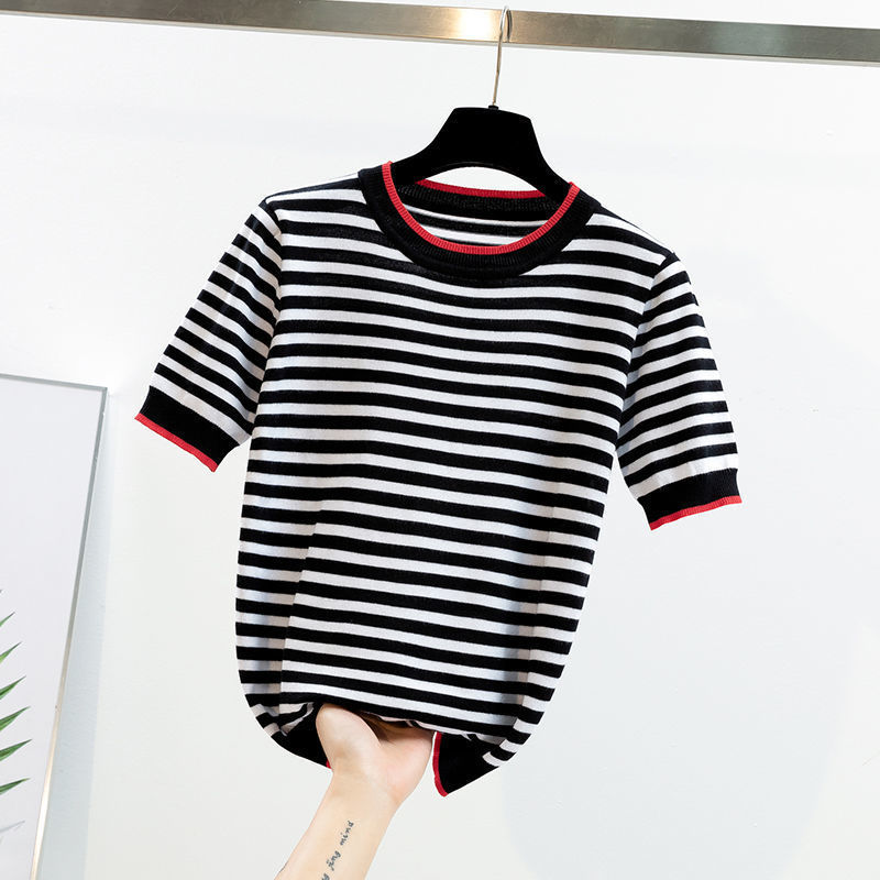 여름 새로운 스타일 신선한 느슨한 줄무늬 셔츠 여성용 스타일 니트 반팔 유행 아이스 실크 얇은 셔츠스토어 가기