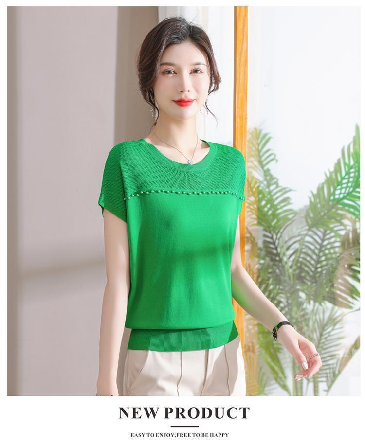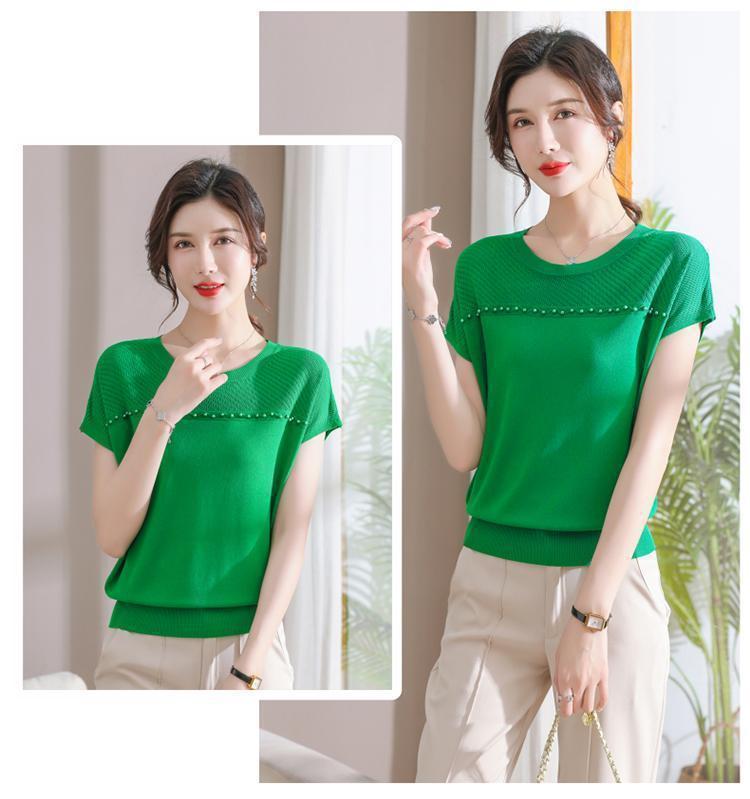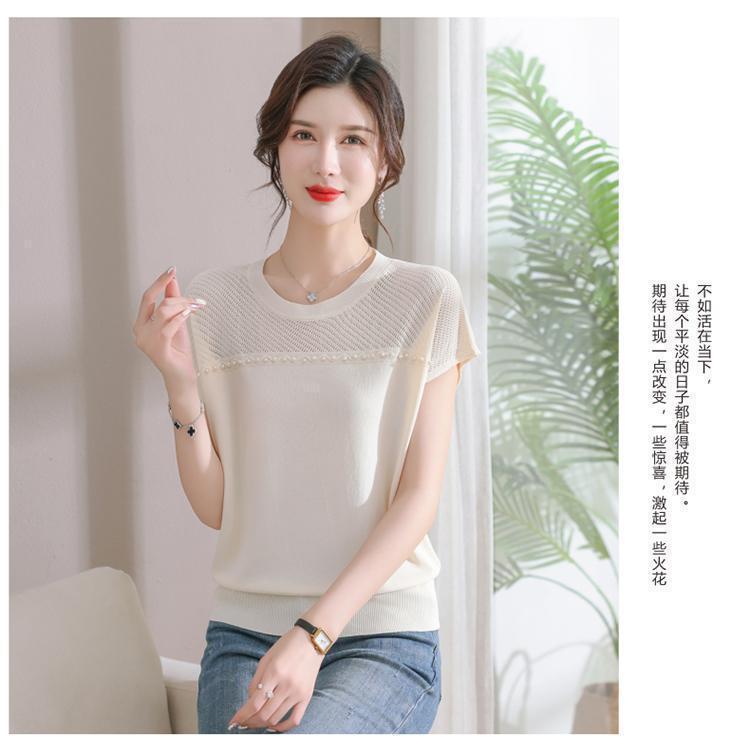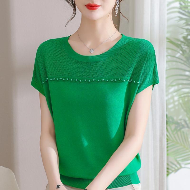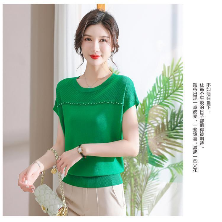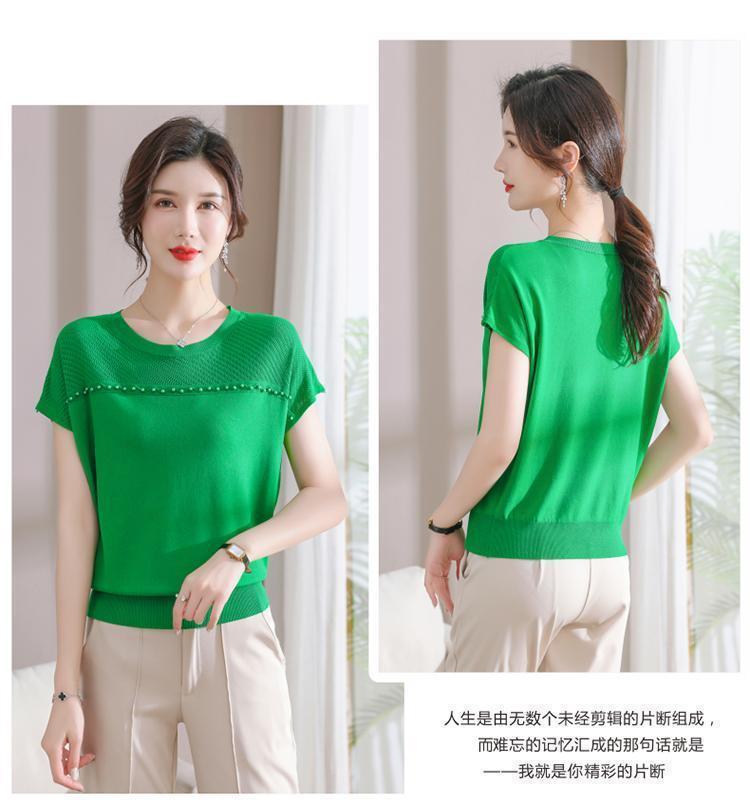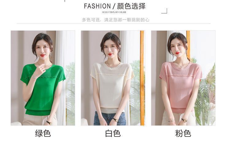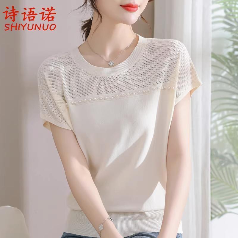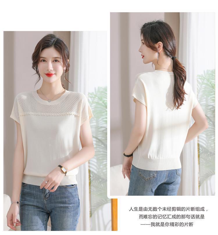 2024 년 여름 새 스웨터 탑 반팔 얇은 아이스 실크 셔츠 여성용 스몰 사이즈 올 매치 루즈