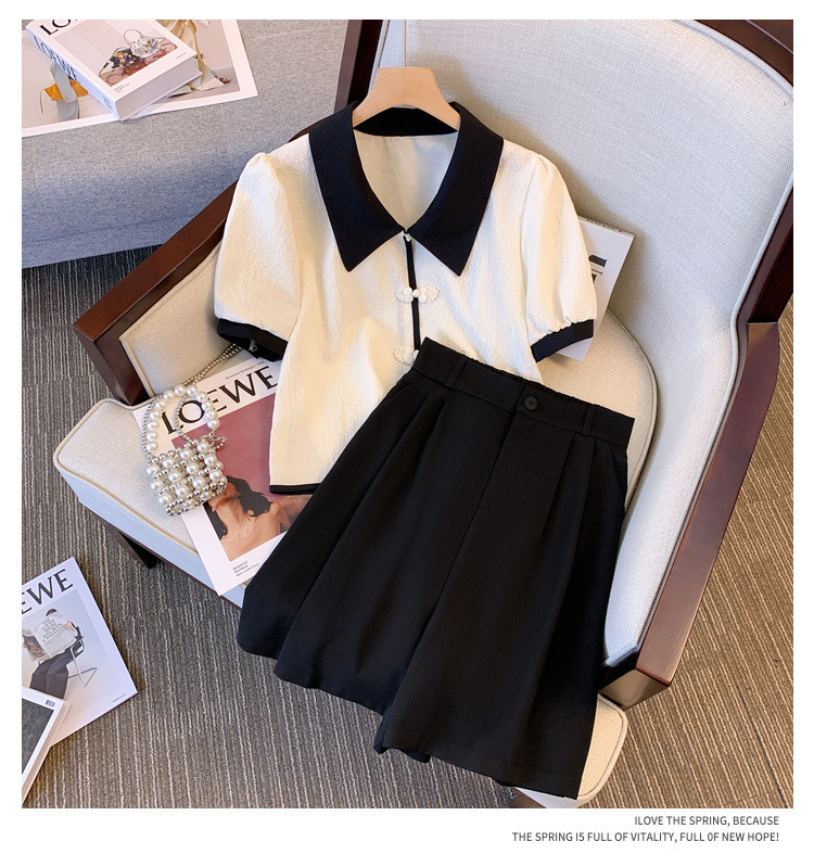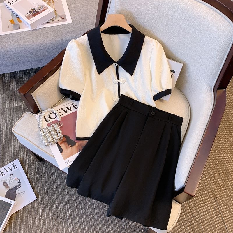 플러스 사이즈 여성의 2024 새로운 뚱뚱한 자매 세련된 짧은 셔츠 탑 여름 높은 허리 캐주얼 바지 투피스 세트