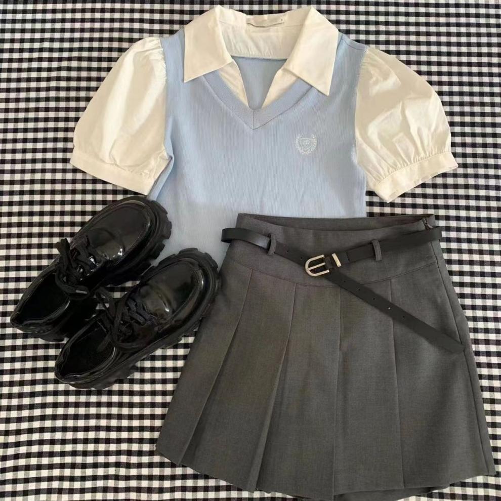 여자 여름 우유 투피스 세트 투피스 세트 2025 새로운 스타일 서양식 대학 유행 반팔 셔츠 주름 치마