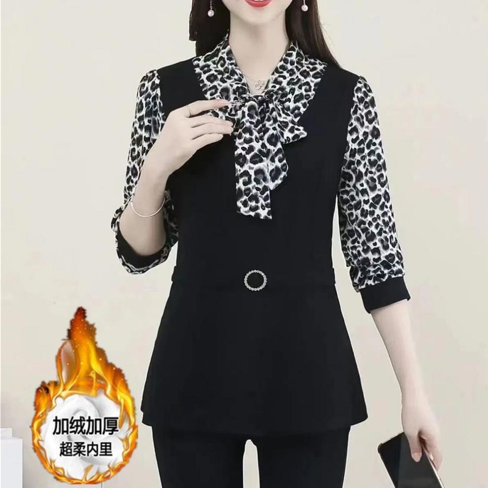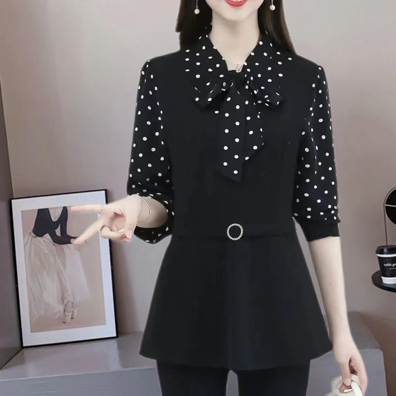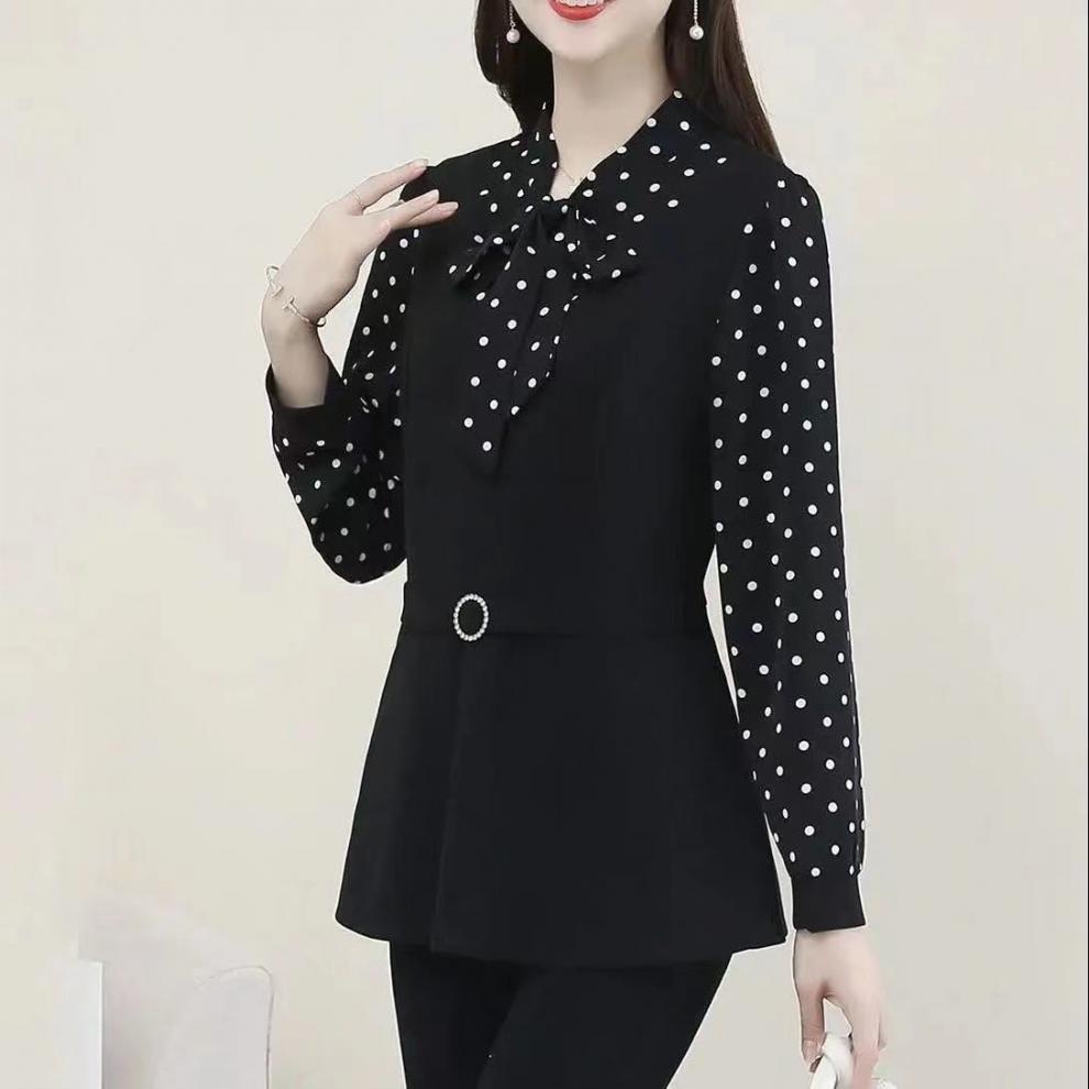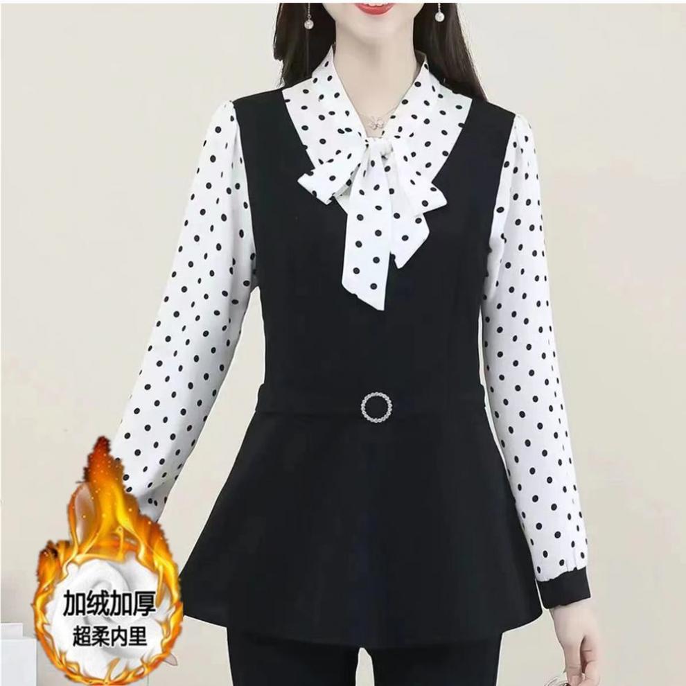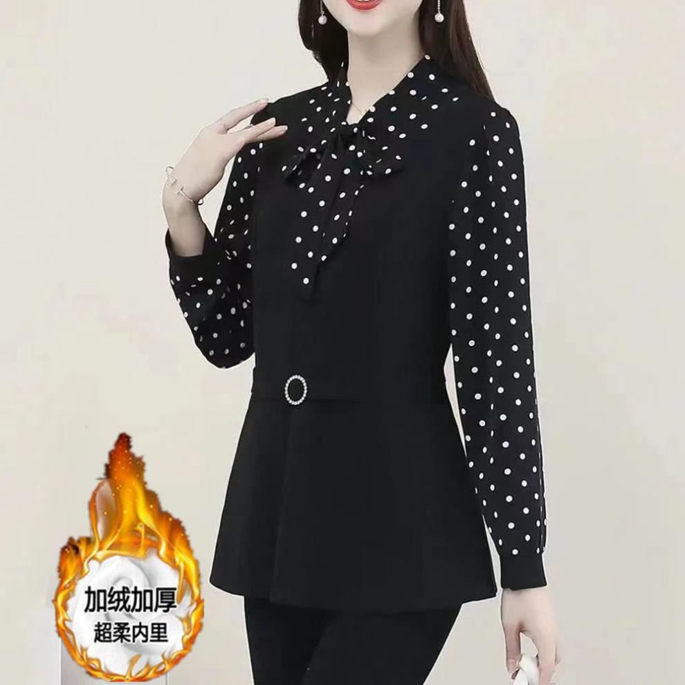 어머니의 플러스 사이즈 배를 덮고있는 나이를 줄이는 긴 소매 레이스 업베이스 셔츠 여성의 2025 봄 새로운 중간 길이 최고 트렌디