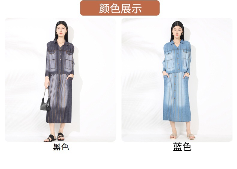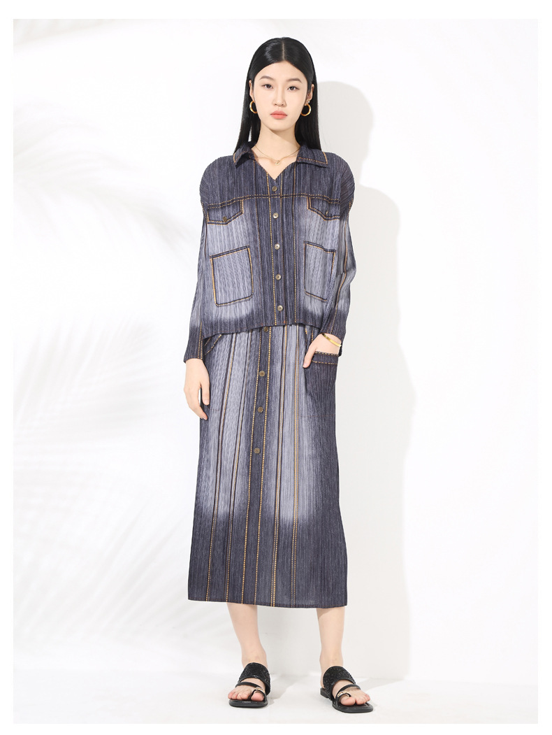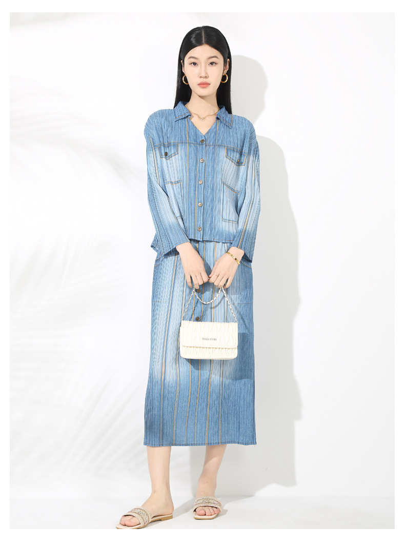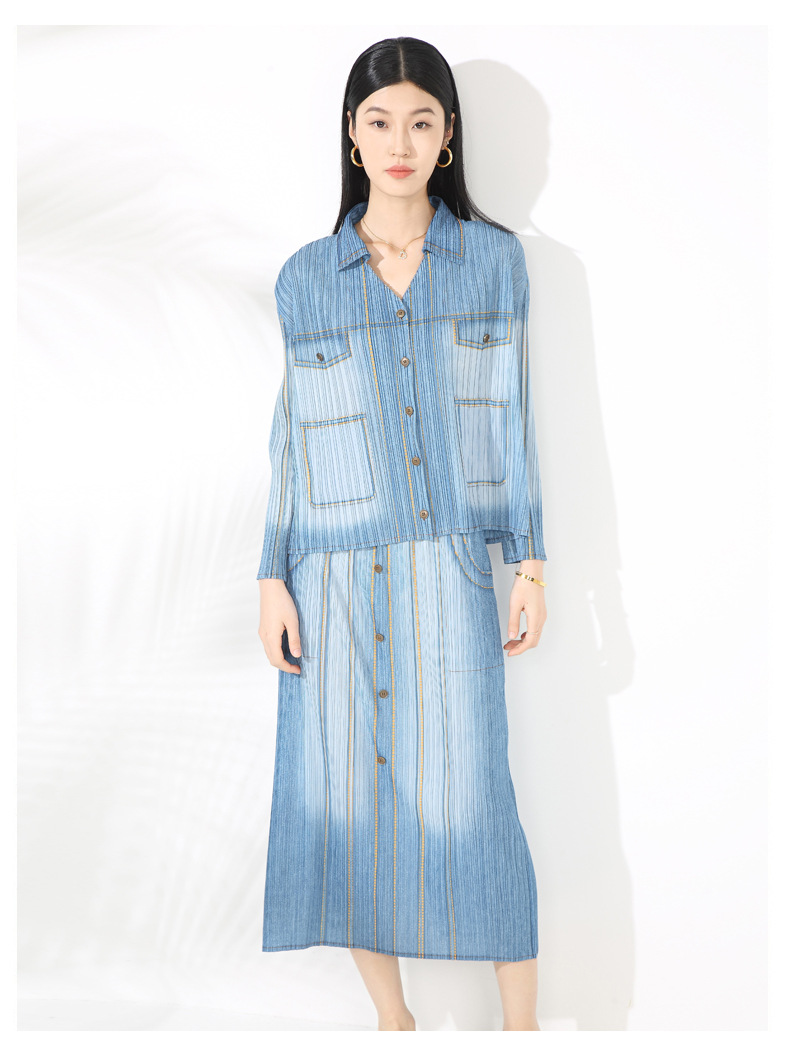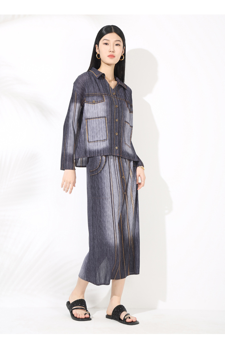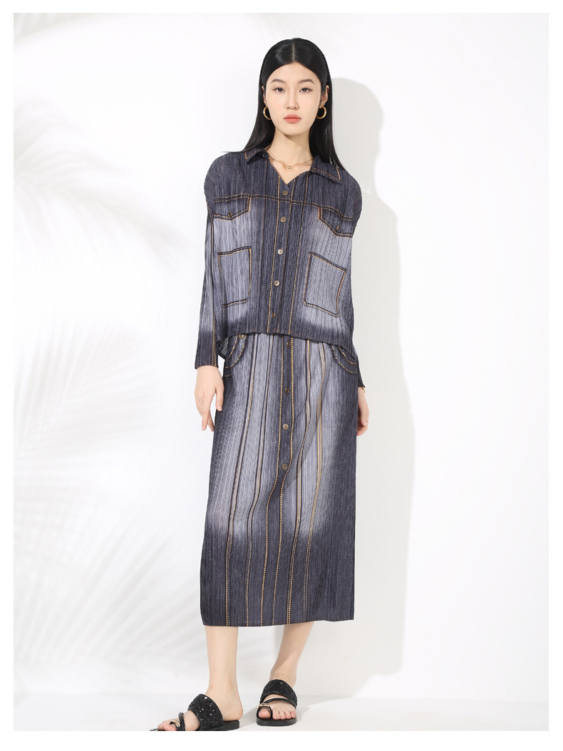 Pleated 패션 캐주얼 세트 여성의 2025 봄 새로운 데님 컬러 그라디언트 프린트 셔츠 칼라 탑 오버 스커트스토어 가기