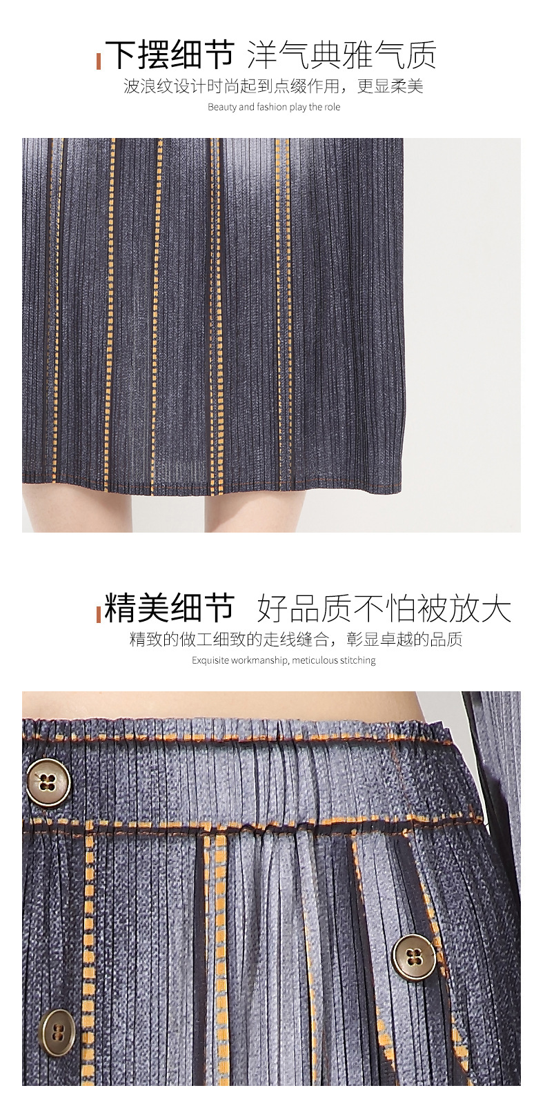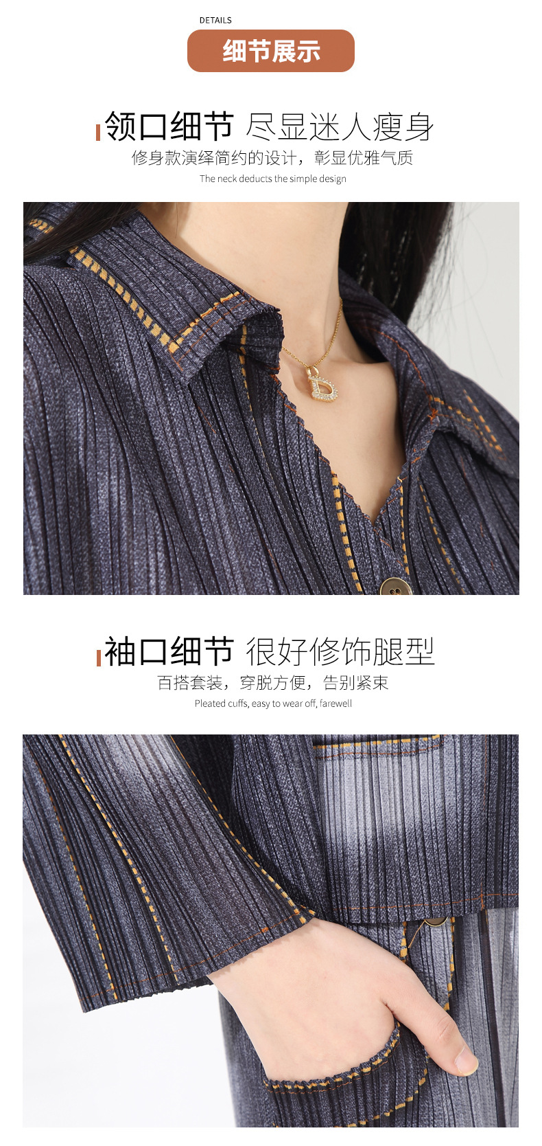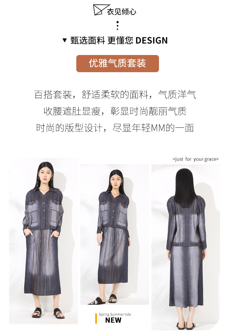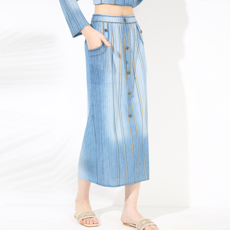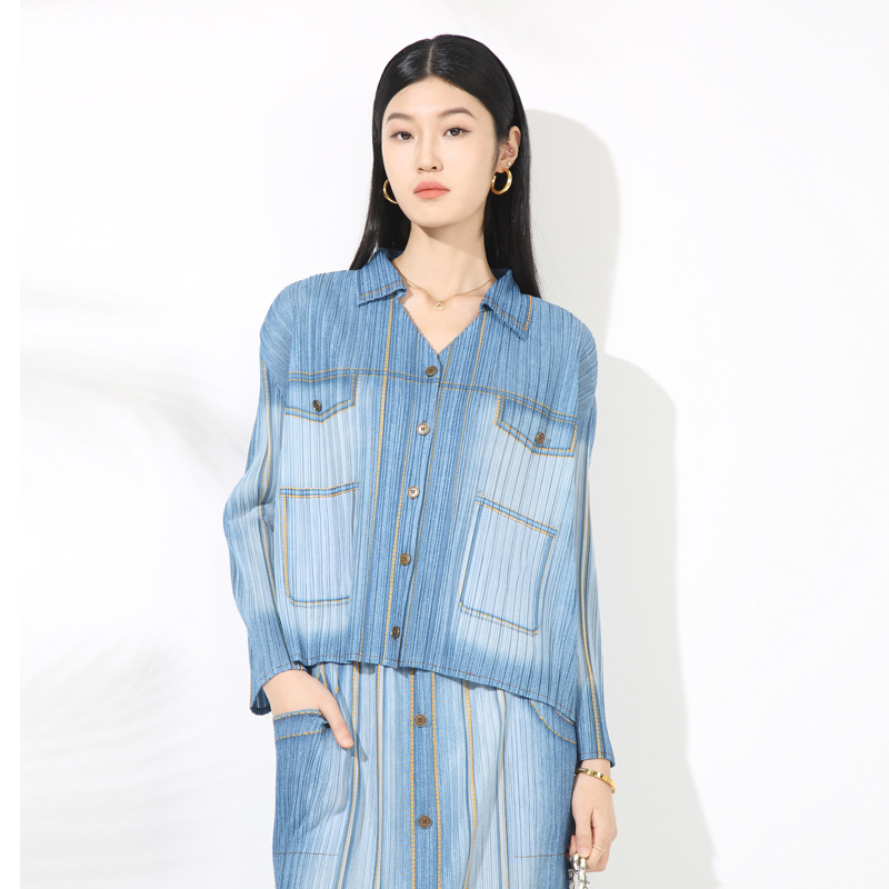 Pleated 패션 캐주얼 세트 여성의 2025 봄 새로운 데님 컬러 그라디언트 프린트 셔츠 칼라 탑 오버 스커트스토어 가기