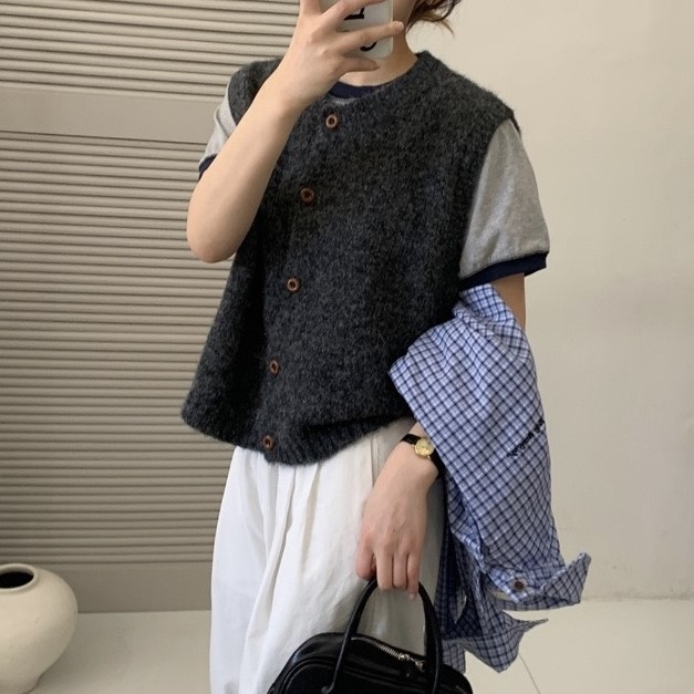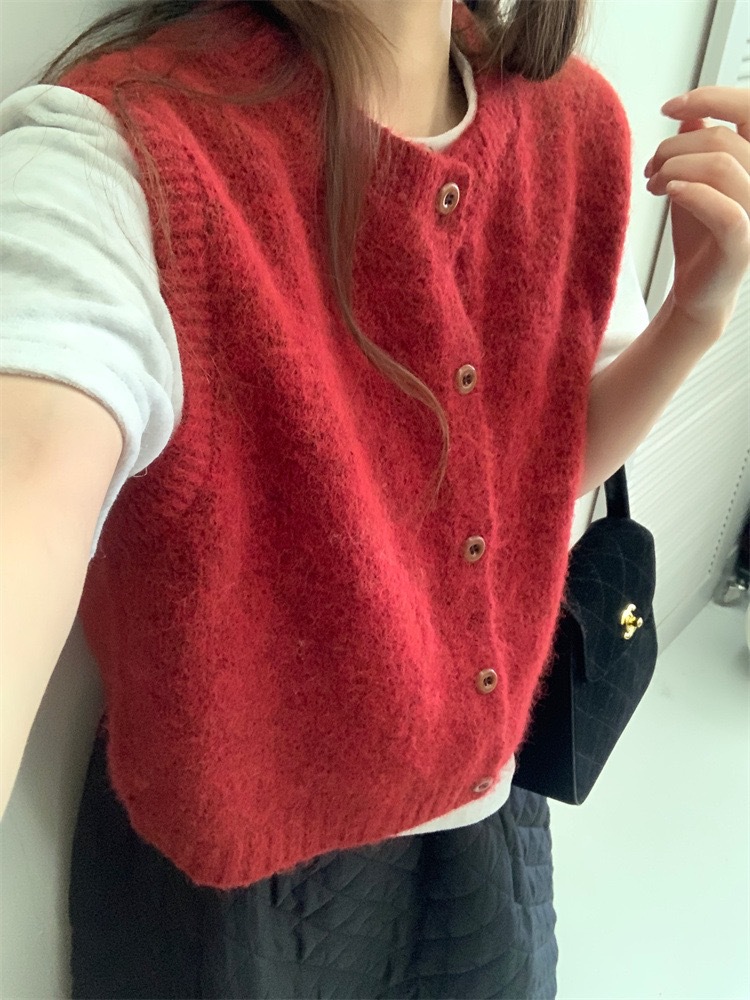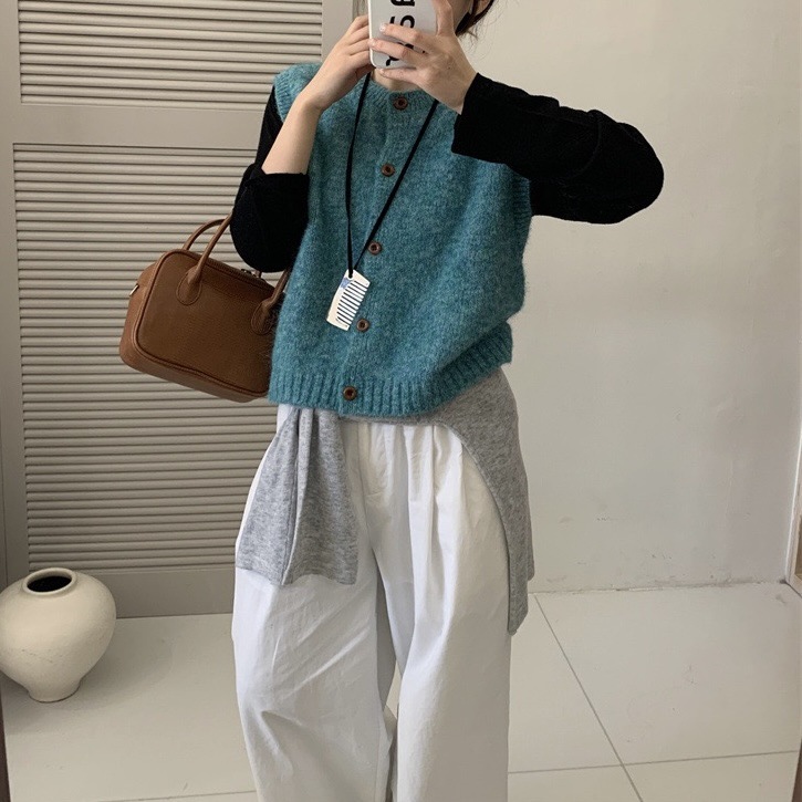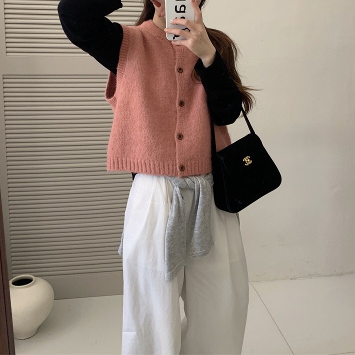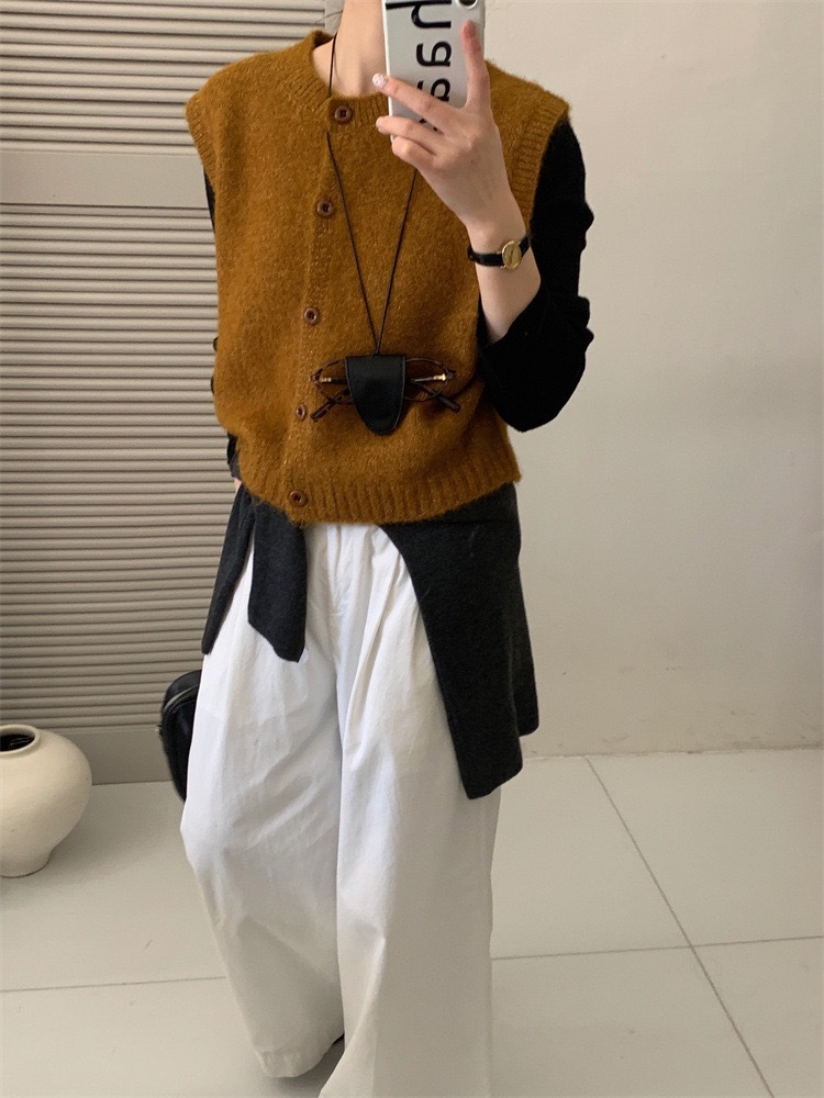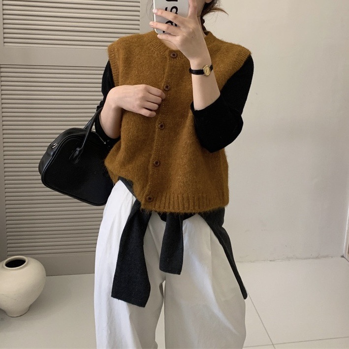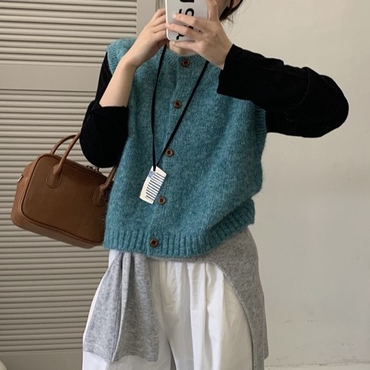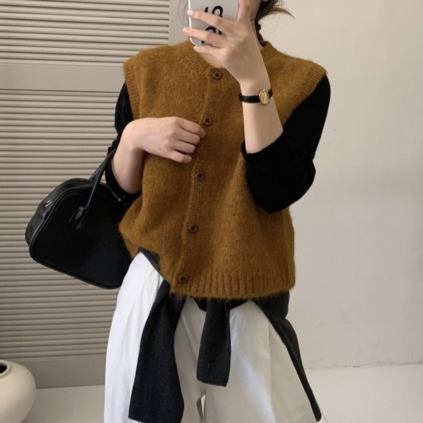한국 고급 센스 싱글 브레스트 니트 조끼 여성 카디건 봄 · 가을 느슨하게 쌓인 웨이스트코트 스웨터 조끼 탑