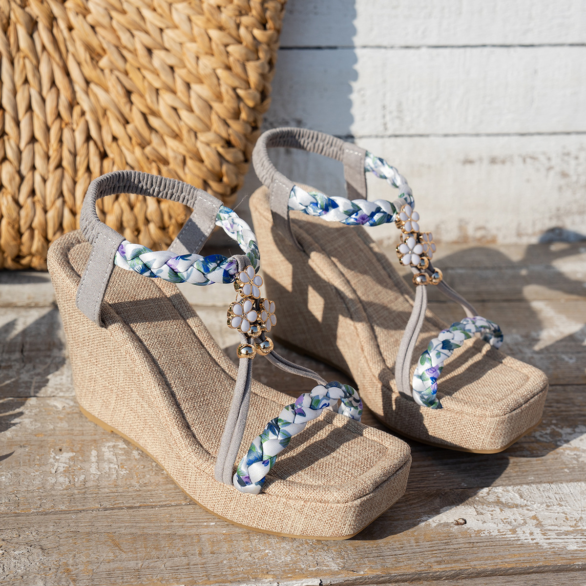 대외 무역 두꺼운 밑창 웨지 샌들 여성 2025 년 유럽과 미국의 새로운 짠 대마 로프 탄성 보헤미안 스타일 하이힐