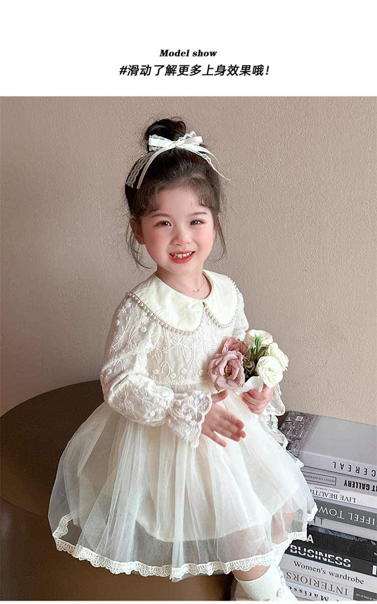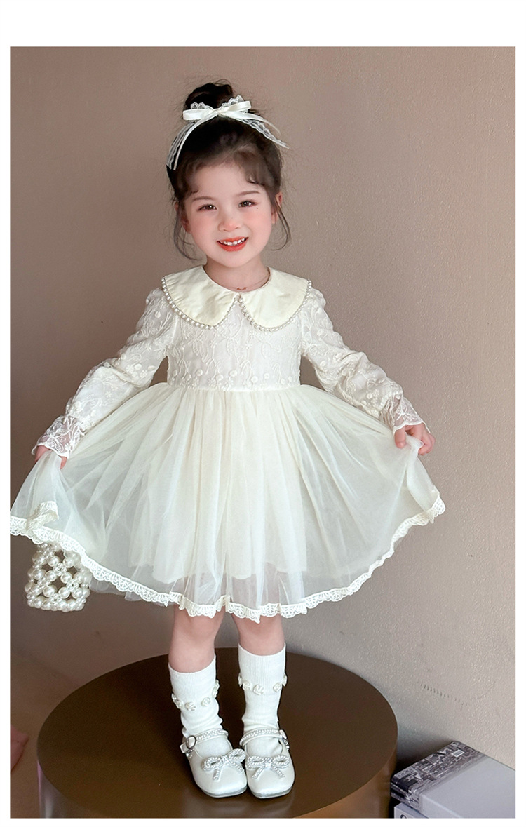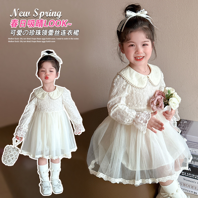 소녀의 봄과 가을 원피스 2025 새로운 세련된 패션 공주 원피스 여성의 아기 인터넷 인기 진주 칼라 레이스 원피스스토어 가기