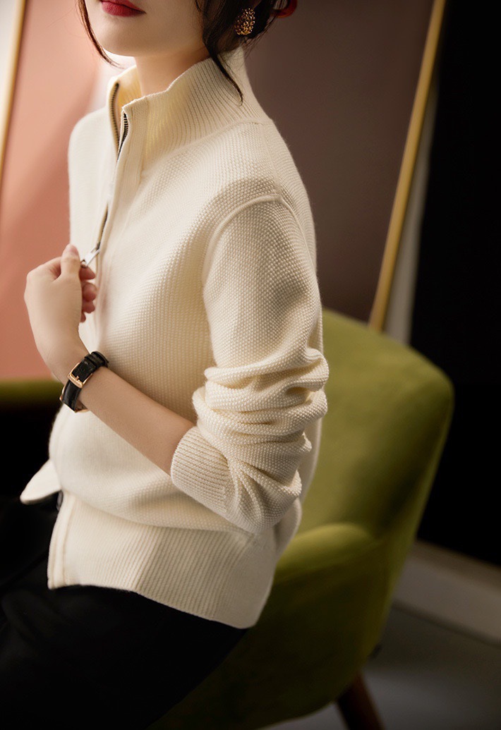 가을 새로운 작은 칼라 더블 지퍼 디자인 센스 양모 니트 카디건 여성의 세련된 니치 긴 소매 어깨 외부 착용스토어 가기