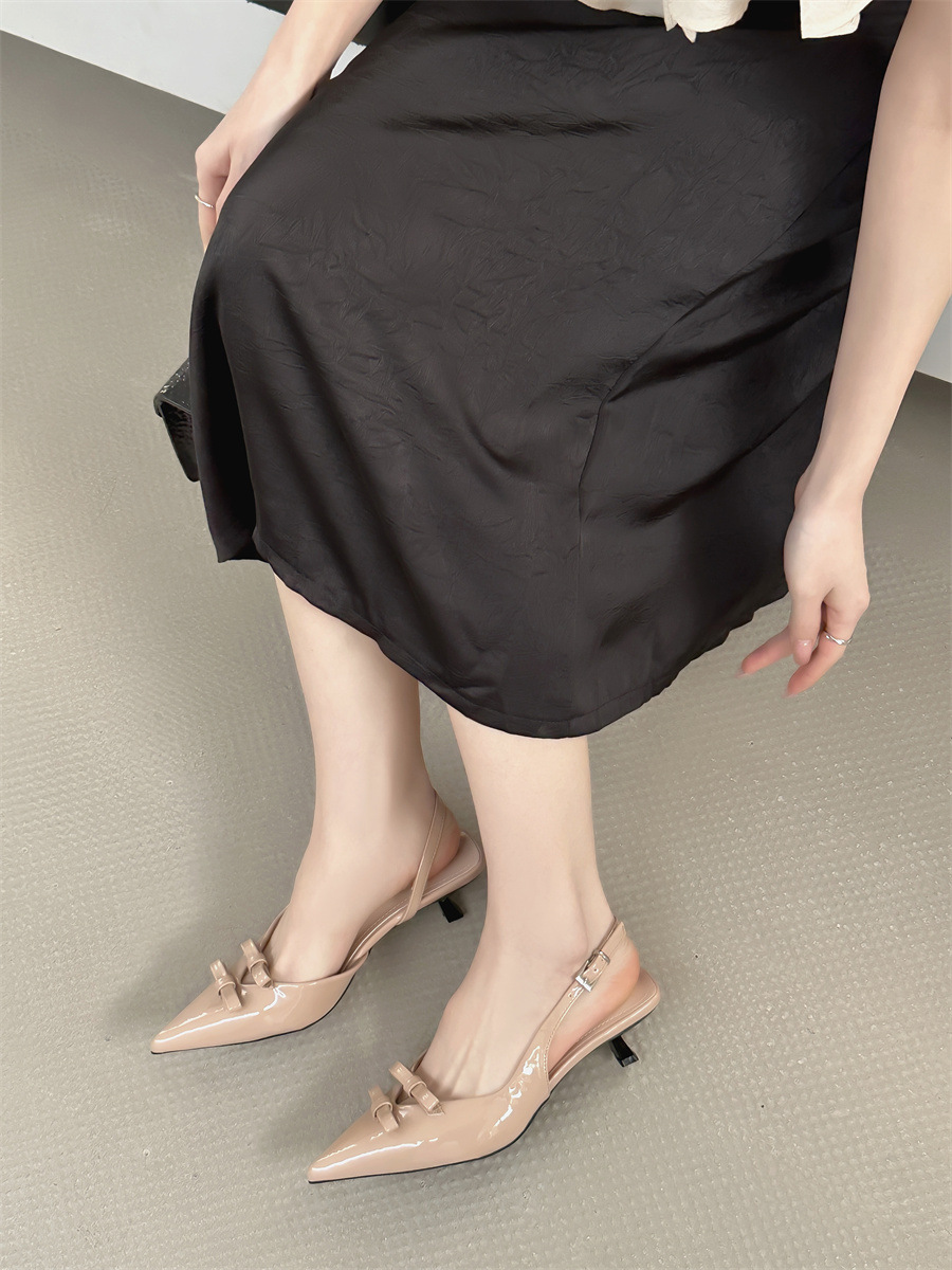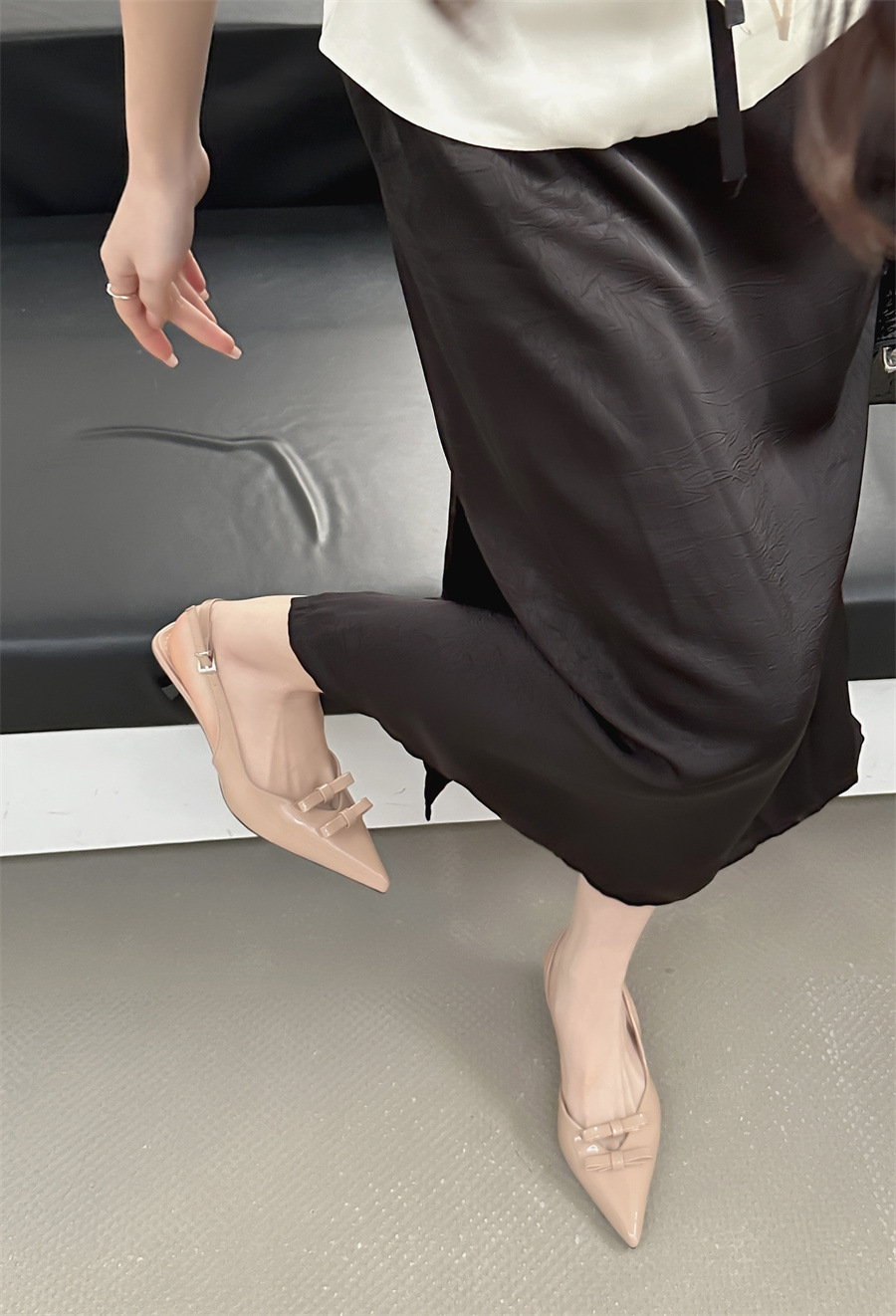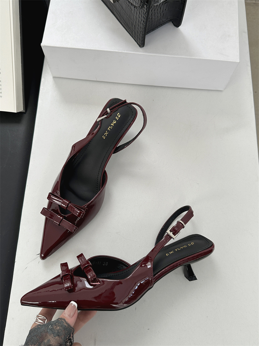 프랑스 뾰족한 발가락 여성 신발 2025 이른 봄 빨간 활 발가락 싱글 레이어 신발 유행 뒷면 빈 굽이 우아한 샌들