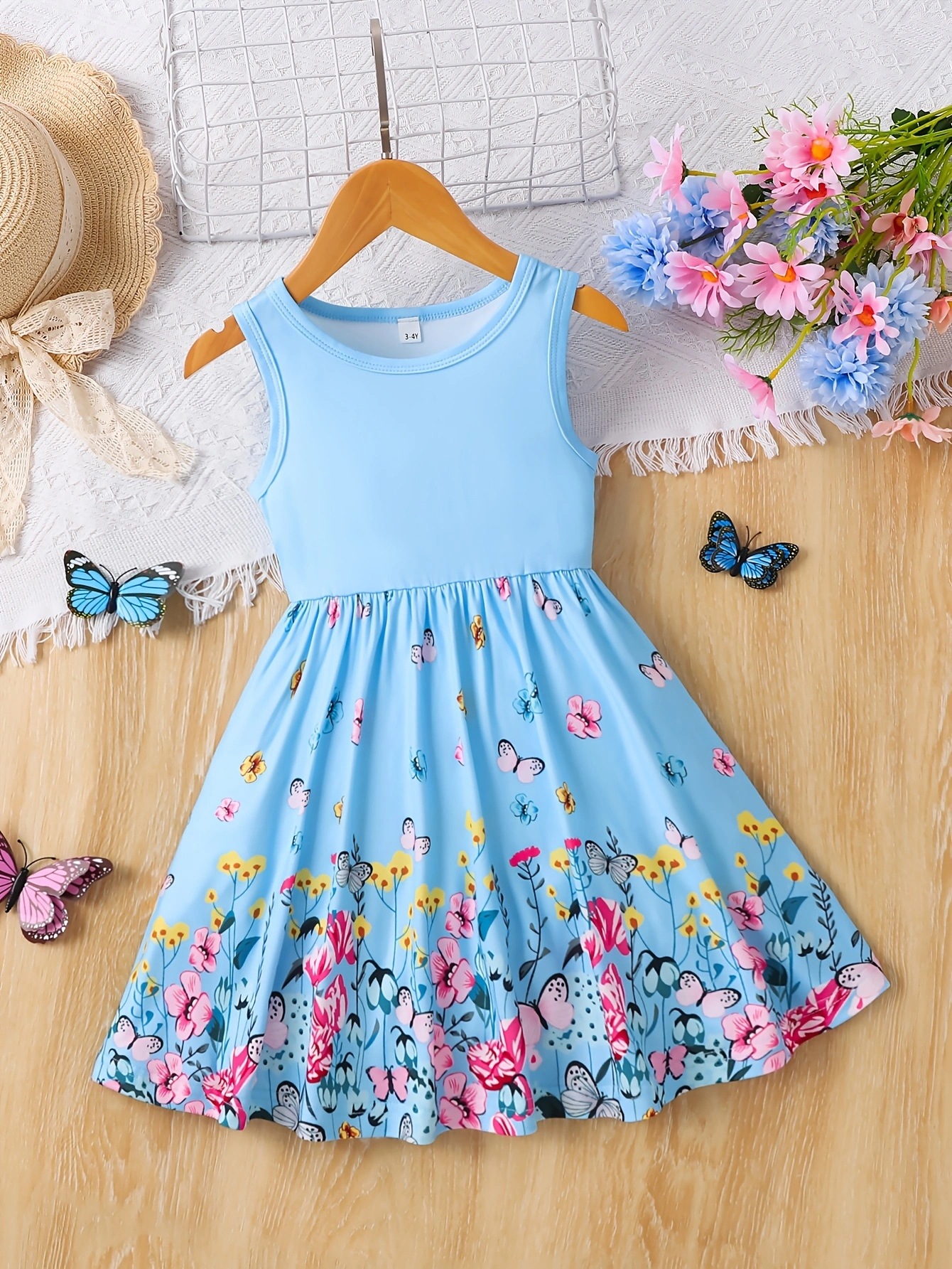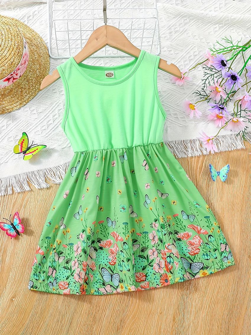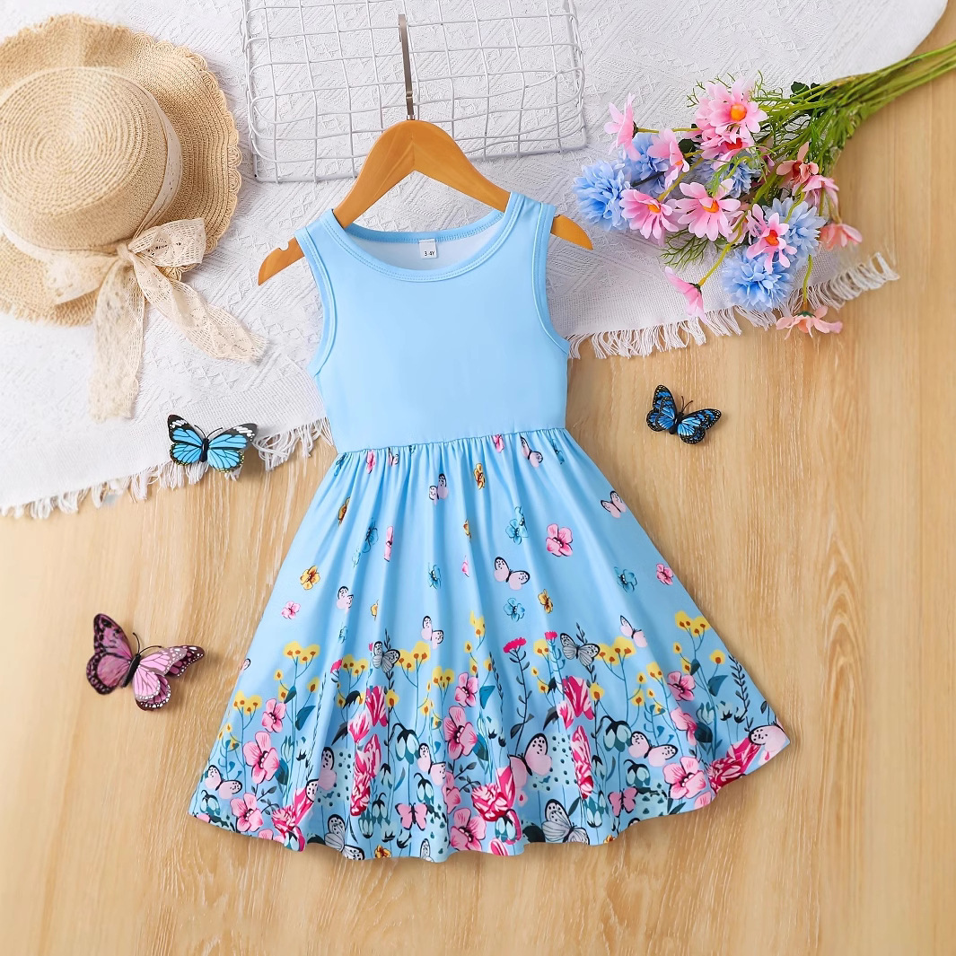 국경 간 INS 어린이와 소녀 여름 민소매 나비 꽃 인쇄 둥근 목 꽉 허리 디스플레이 원피스 조수스토어 가기