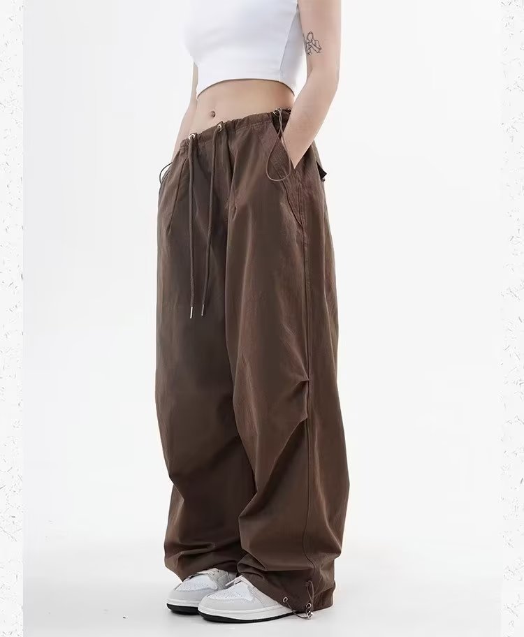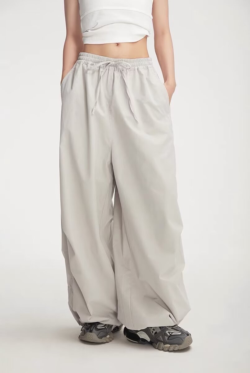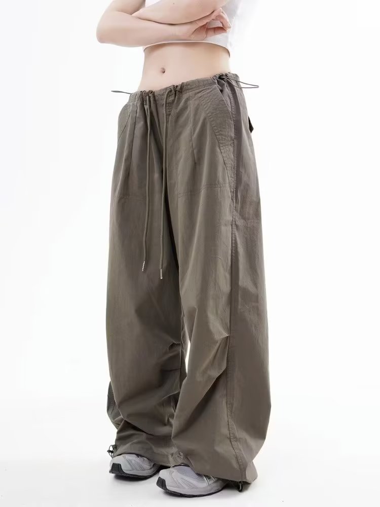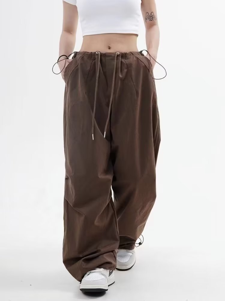 아메리칸 스타일 레트로 핫 소녀 디자인 센스 드로우 스트링 군중 바지 여성의 2023 여름 얇은 슬리밍 넓은 다리 높은 허리 걸레 바지