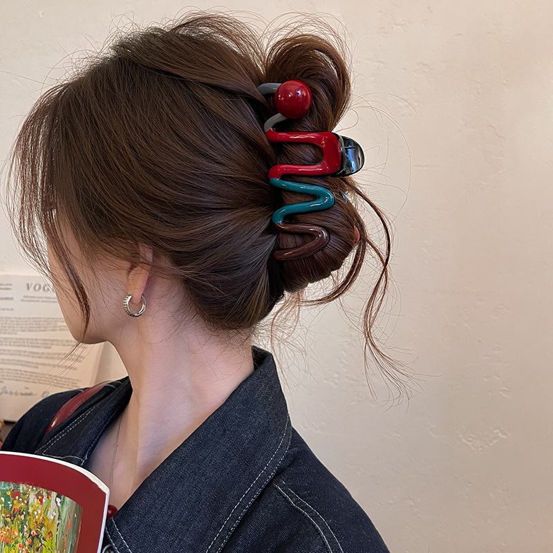 빨간색과 파란색 대비 컬러 헤어 클립 대형 상어 클립 헤어 클립 여성의 머리 뒤 2024 새로운 하이 엔드 센스 클립 헤어 액세서리스토어 가기