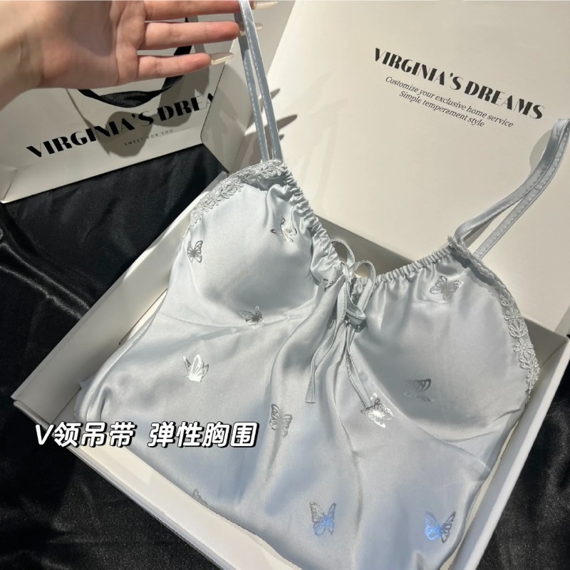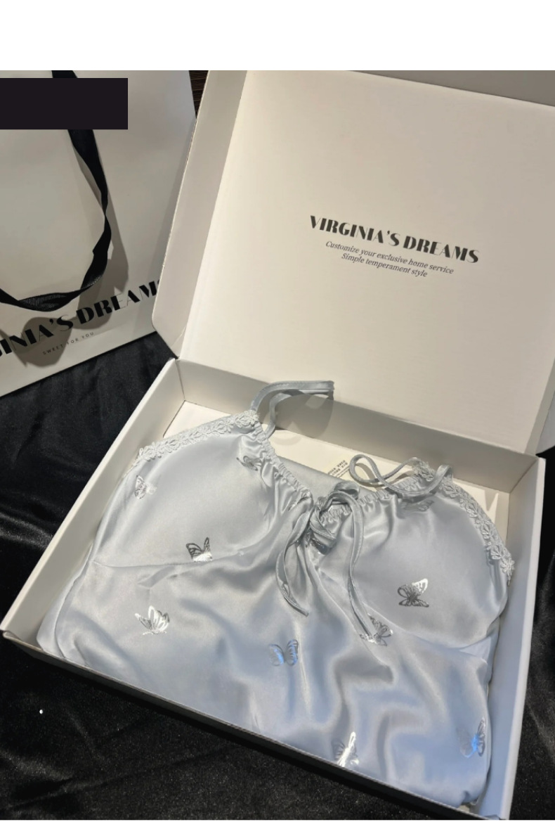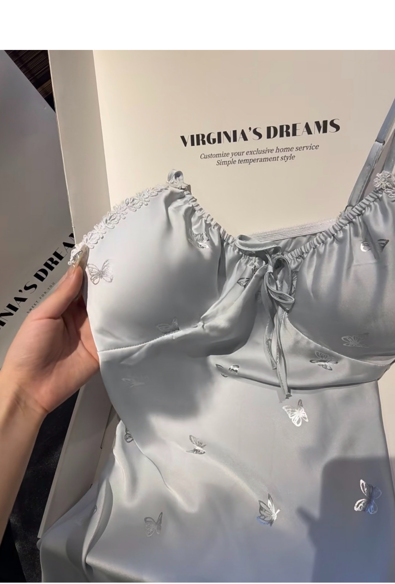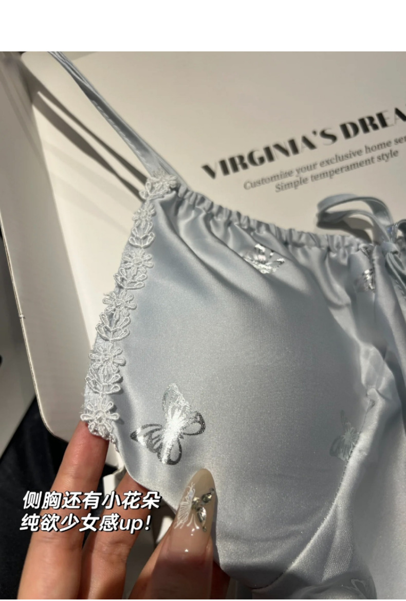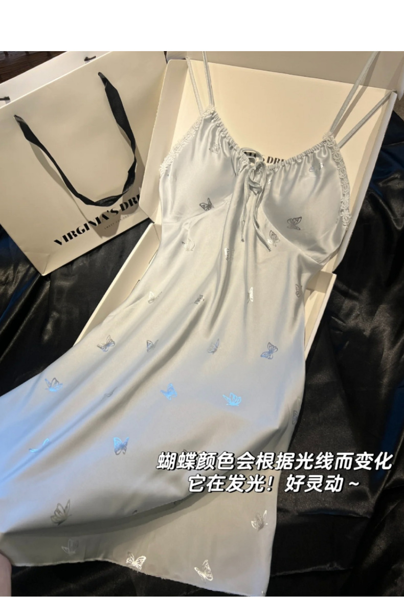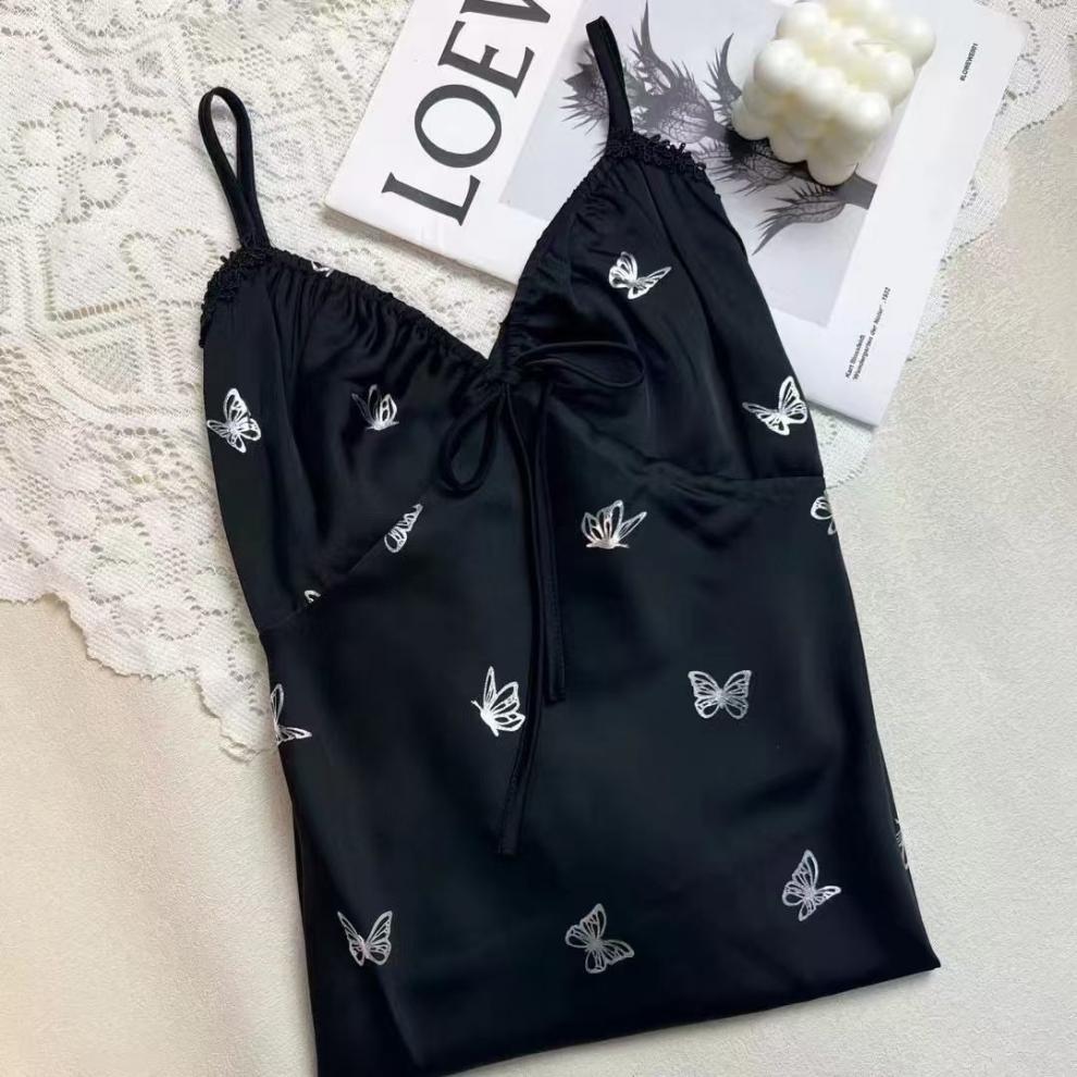 2025 초가을 섹시한 순수한 욕망 나비 인쇄 슬링 나이트 가운 여성의 여름 아이스 실크 멋진 잠옷-가슴 패드 홈스토어 가기