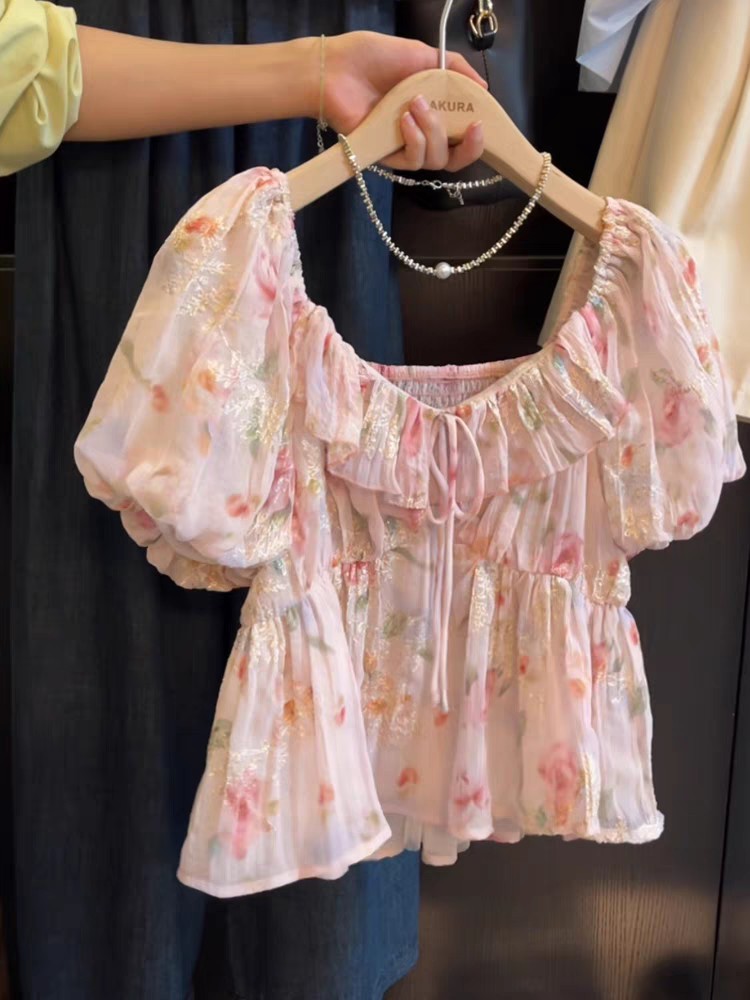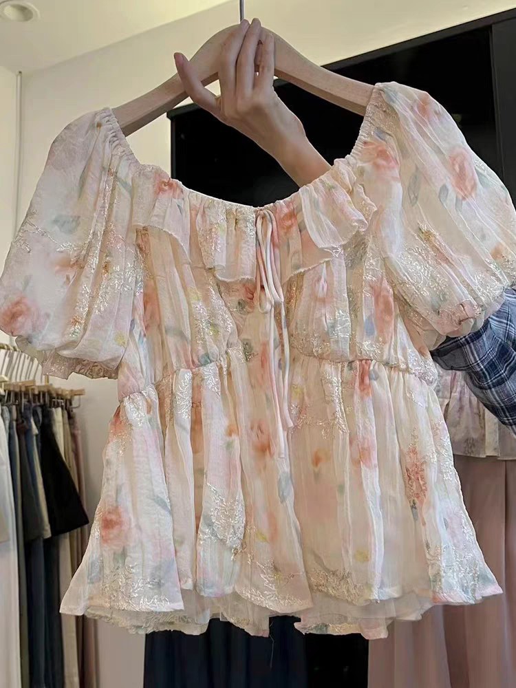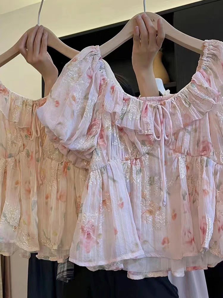 재고 2025 여름 새로운 쉬폰 셔츠 달콤한 레이디 슬림 핏 슬리밍 패션 인쇄 반소매 최고 쉬폰 셔츠