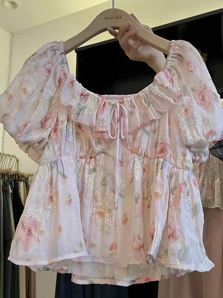 재고 2025 여름 새로운 쉬폰 셔츠 달콤한 레이디 슬림 핏 슬리밍 패션 인쇄 반소매 최고 쉬폰 셔츠스토어 가기