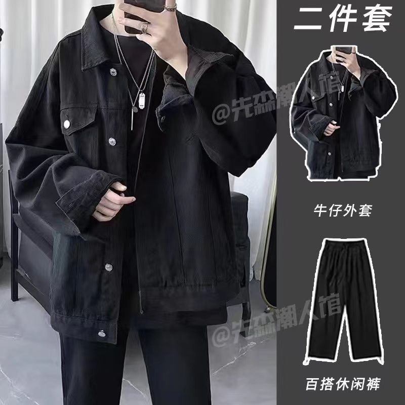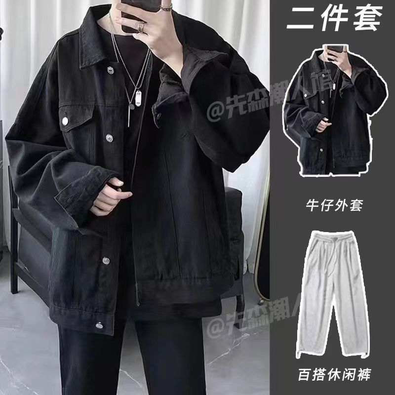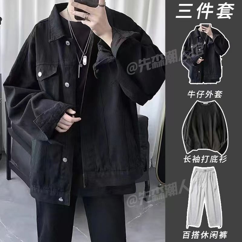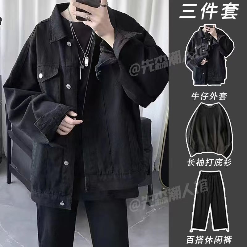[3 피스 세트], 스프링 코트 하이 엔드 블랙 데님 코트 남자 루즈 재킷 남자 매칭 세트