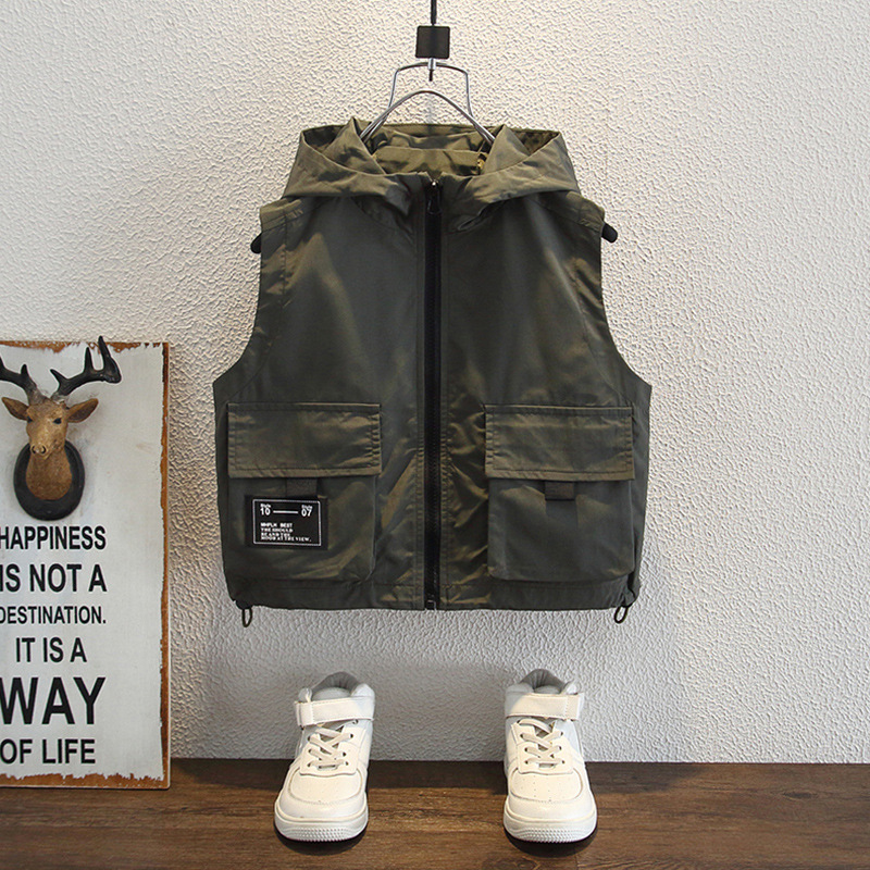 소년 조끼 2025 새로운 어린이 봄웨어 툴링 숄더 웨이스트 코트 아기의 봄과 가을 의상 소년의 봄 후드 조끼스토어 가기