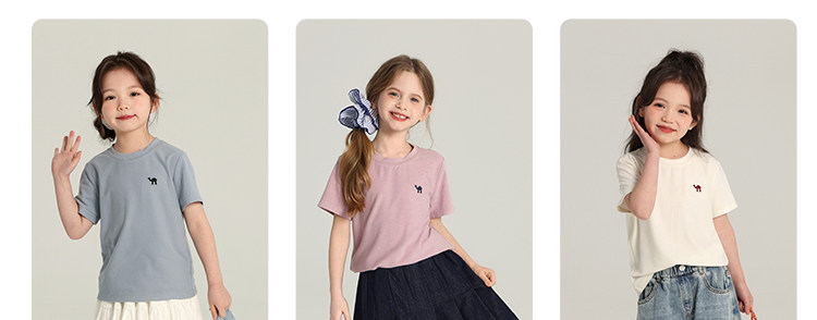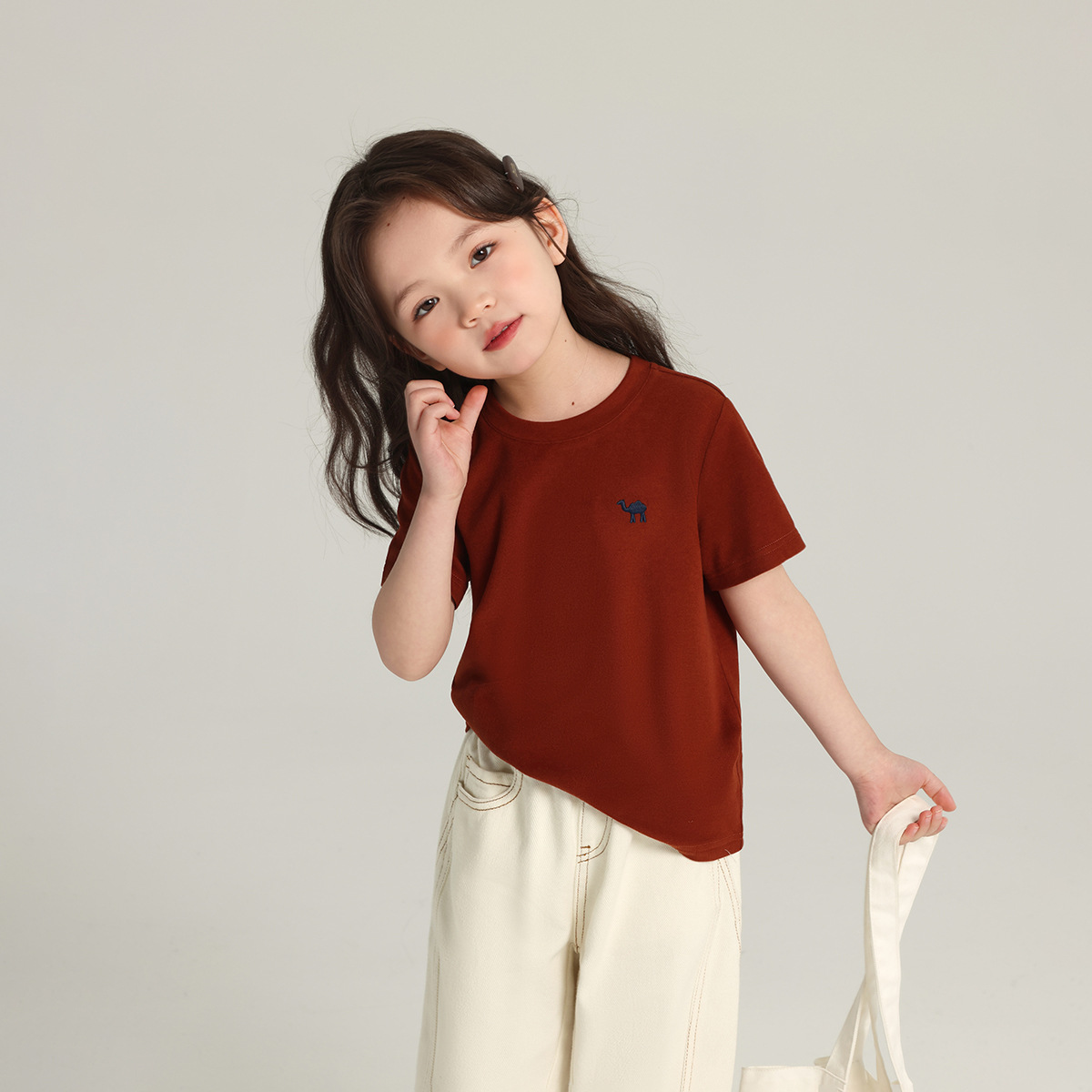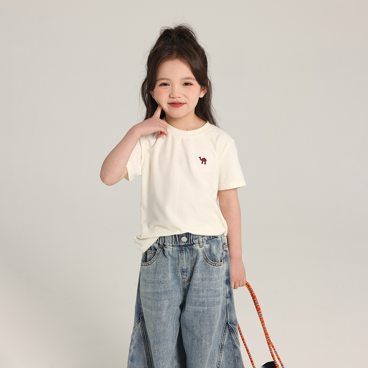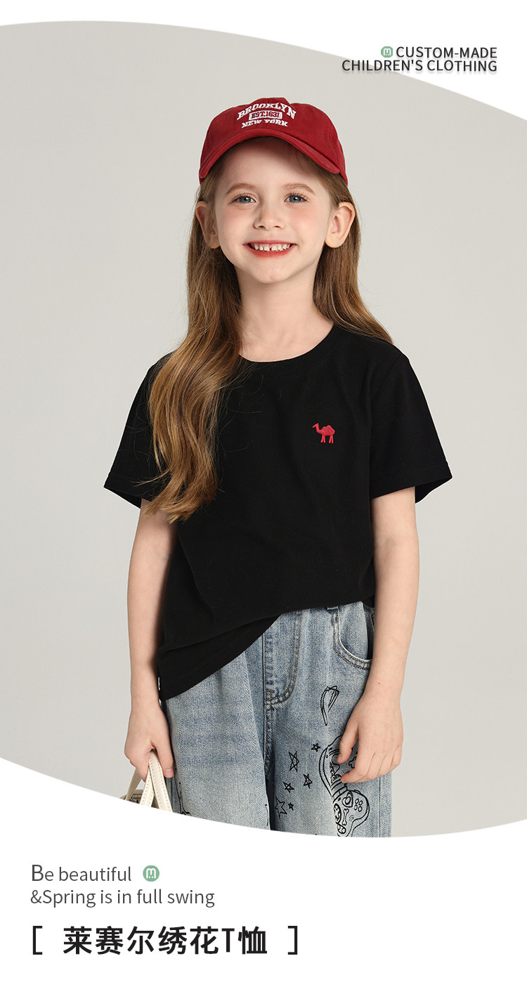 푸딩 할루 소녀 반팔 바닥 셔츠 2025 봄 신작 어린이 다목적 솔리드 컬러 자수 티셔츠스토어 가기