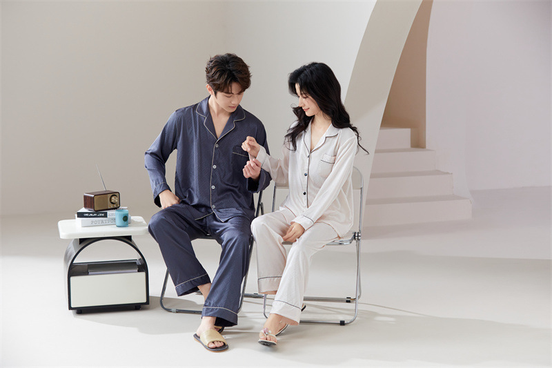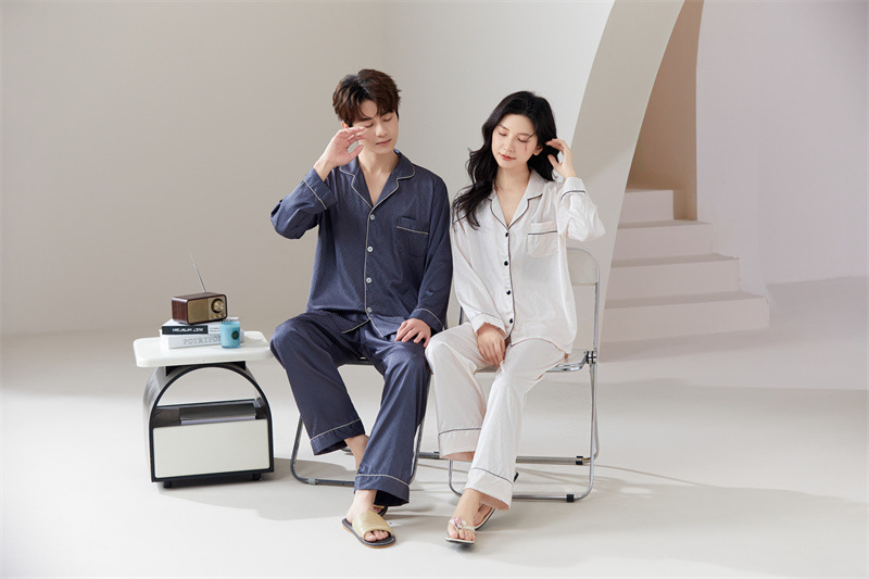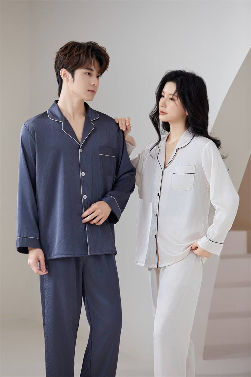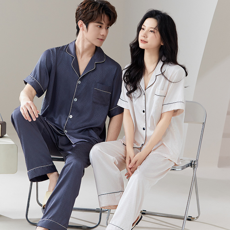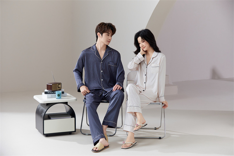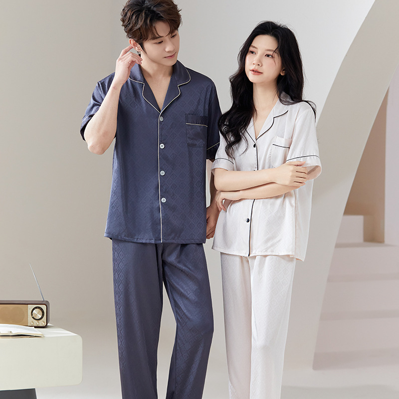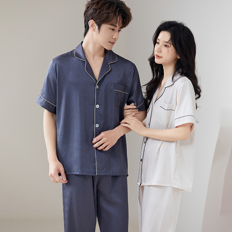 새로운 커플 얼음 실크 잠옷 남성 긴팔 라이트 럭셔리 자카드 카디건 얇은 하이 엔드 여성 홈웨어 정장 여름