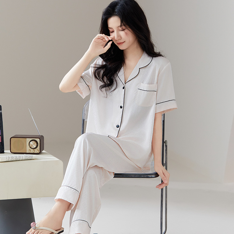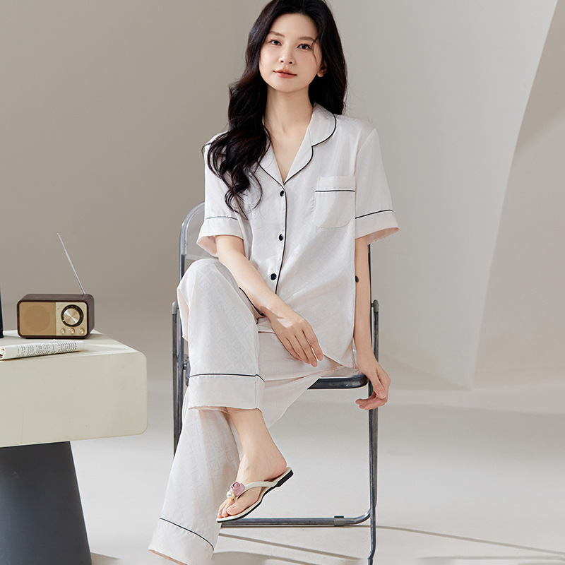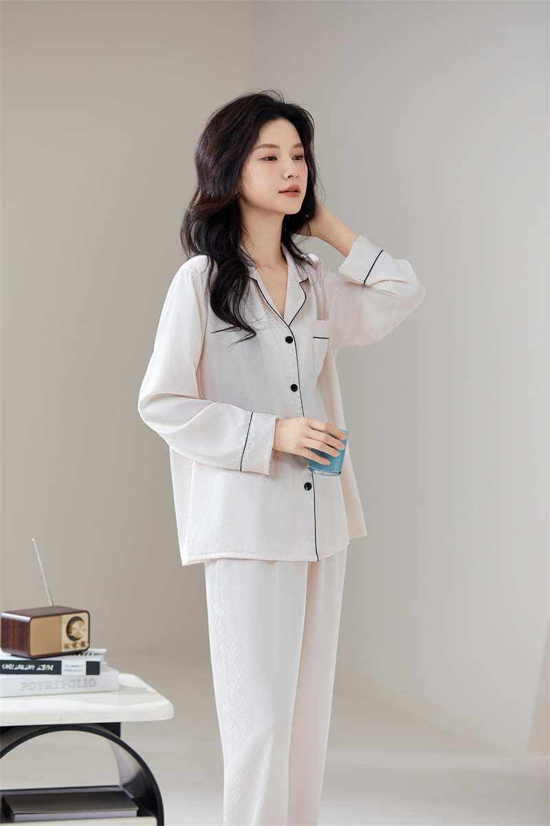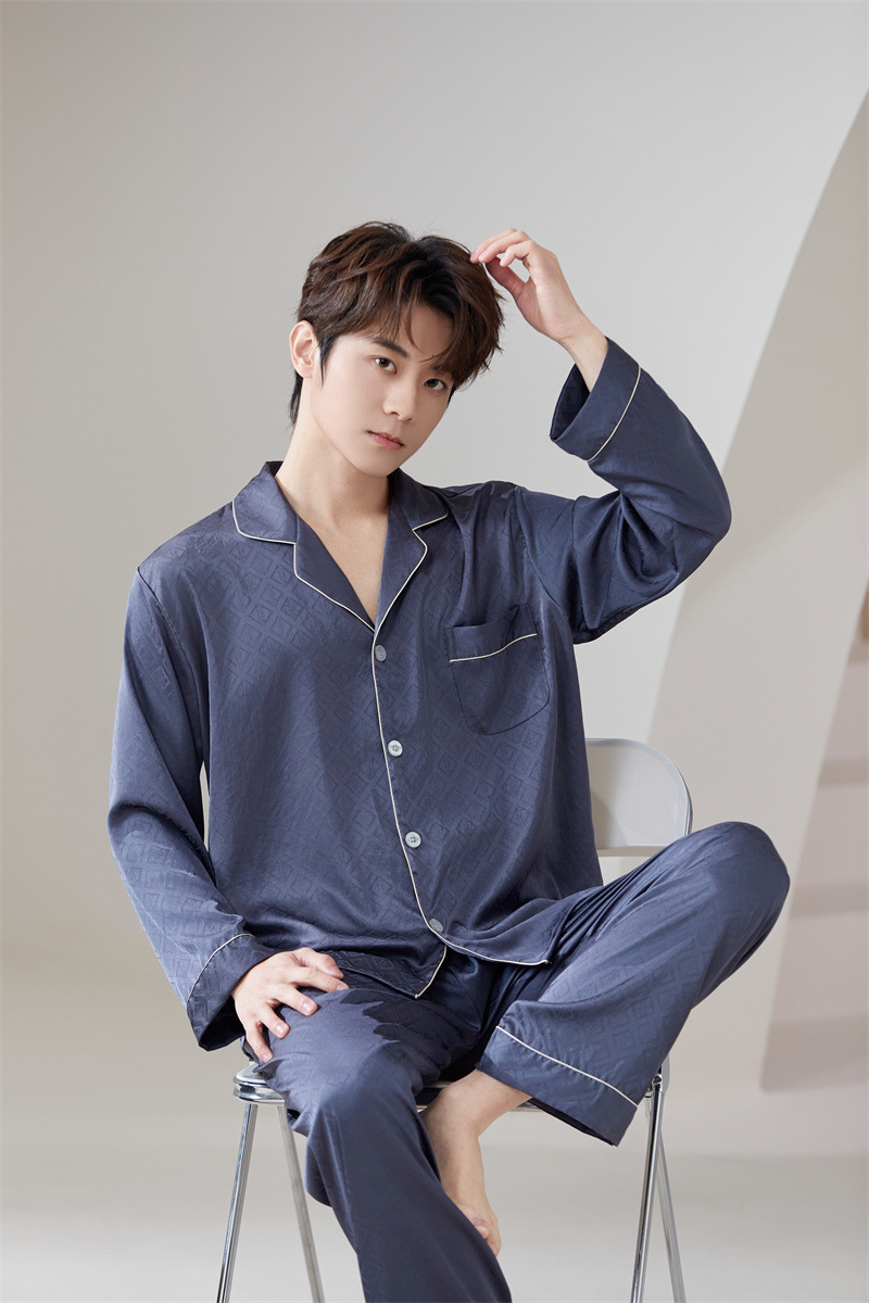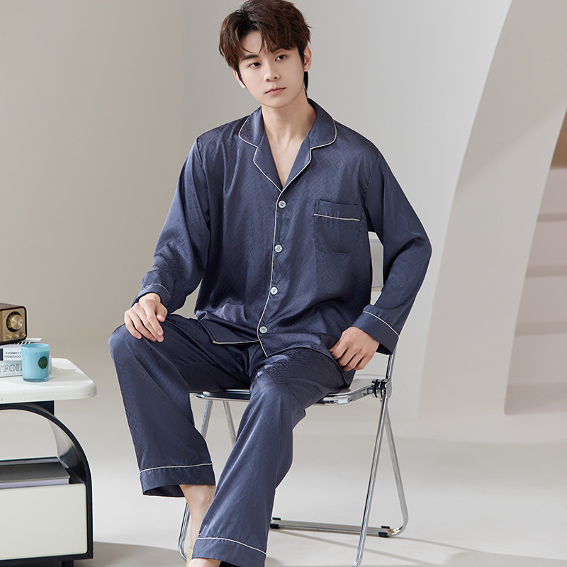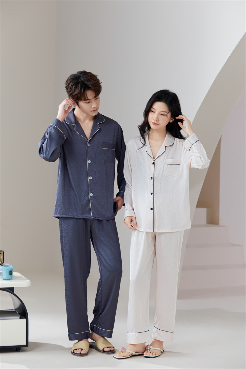 새로운 커플 얼음 실크 잠옷 남성 긴팔 라이트 럭셔리 자카드 카디건 얇은 하이 엔드 여성 홈웨어 정장 여름