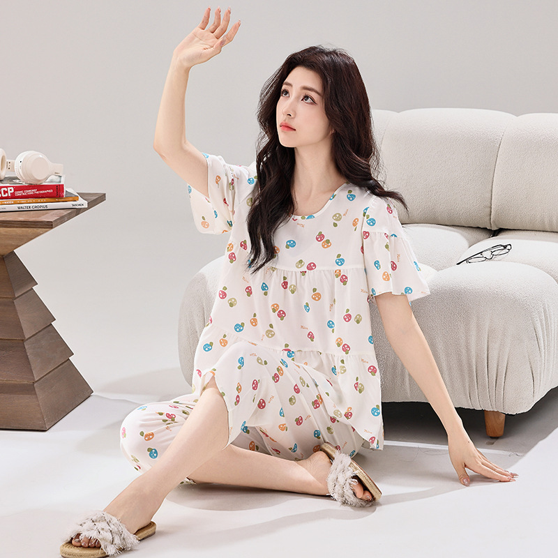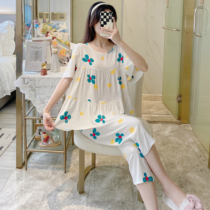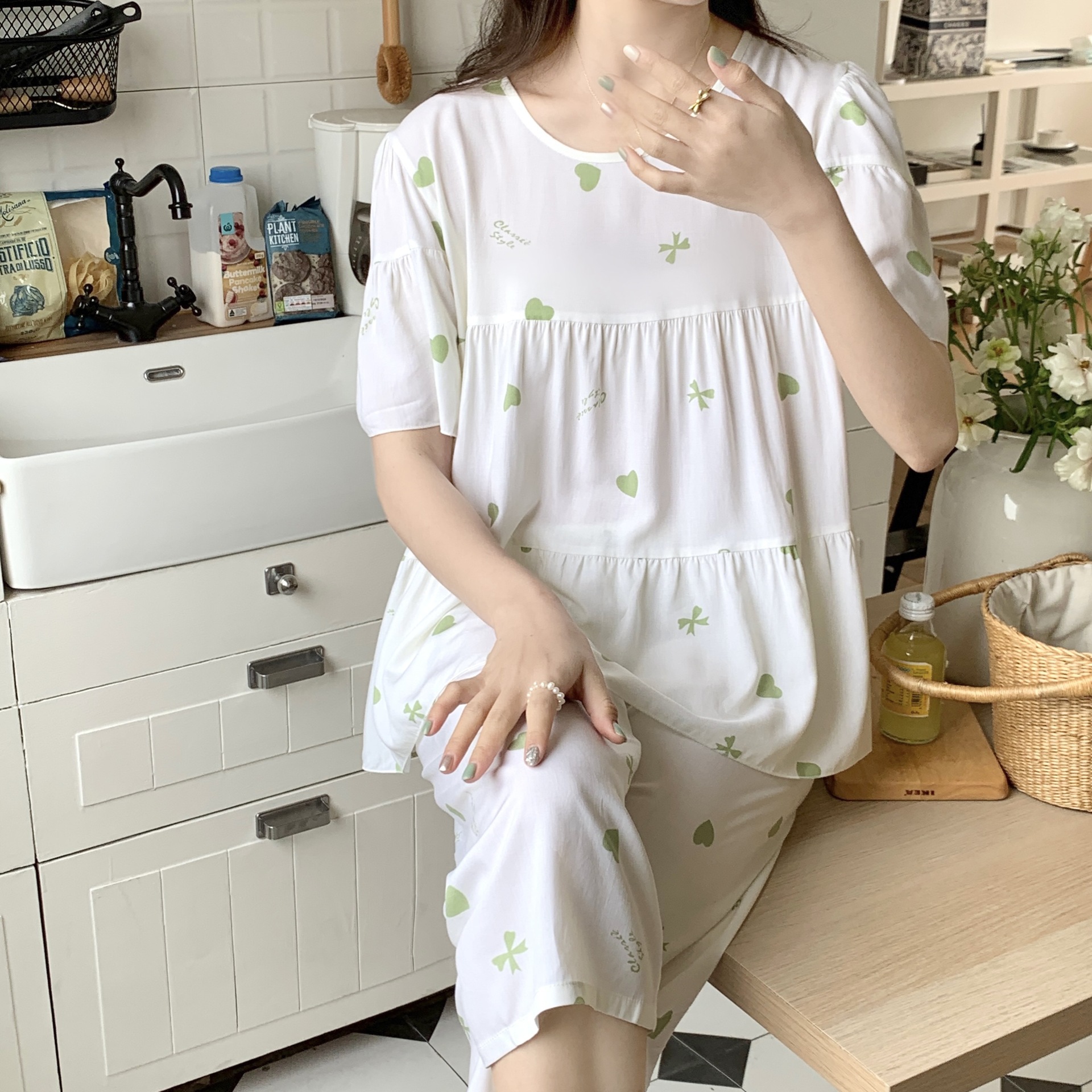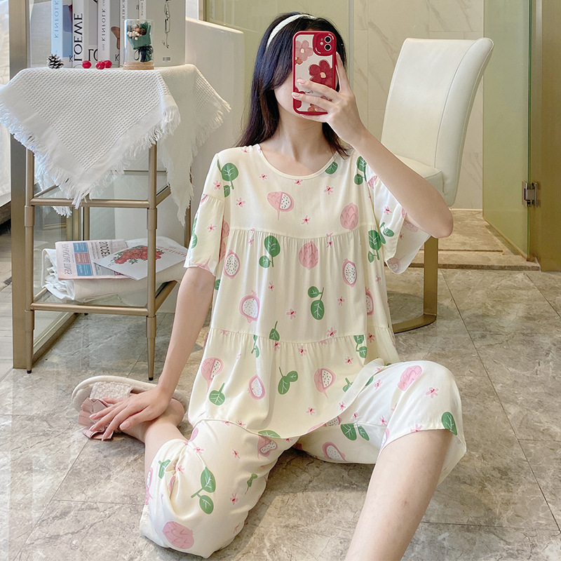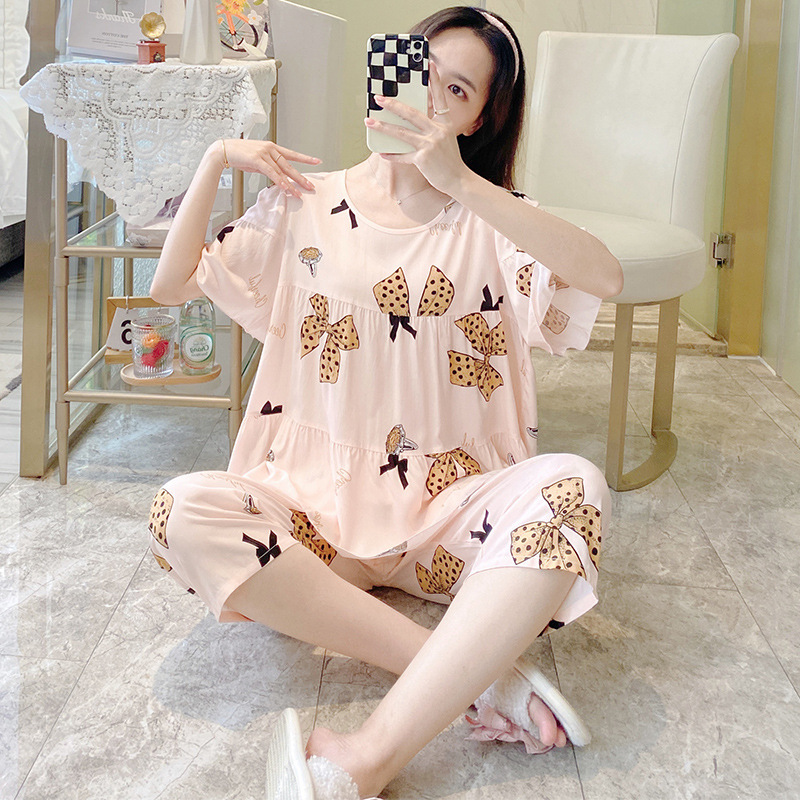 새로운 여름 여성 파자마 반팔 자른 바지 세트 1 인칭 면 실크 신선한 선샤인 목가적 스타일 홈 의류 판매
