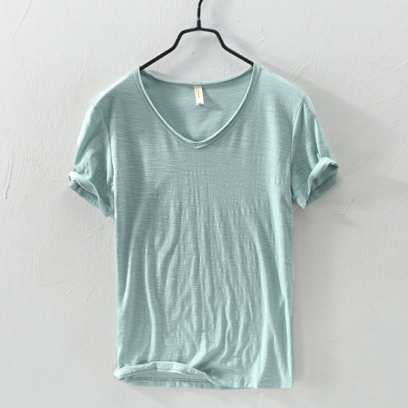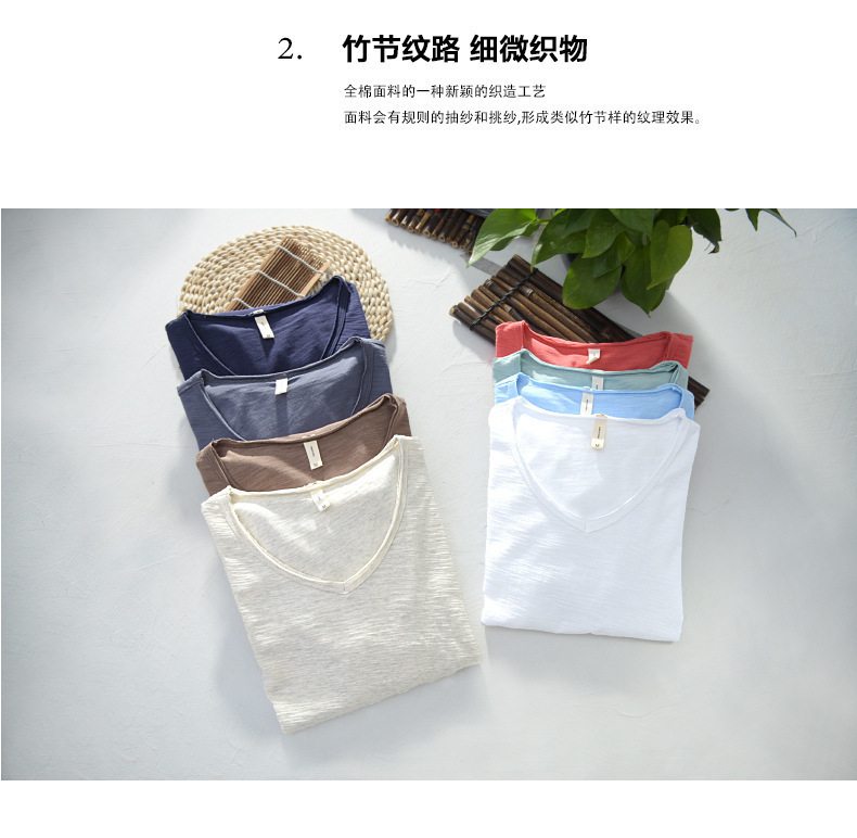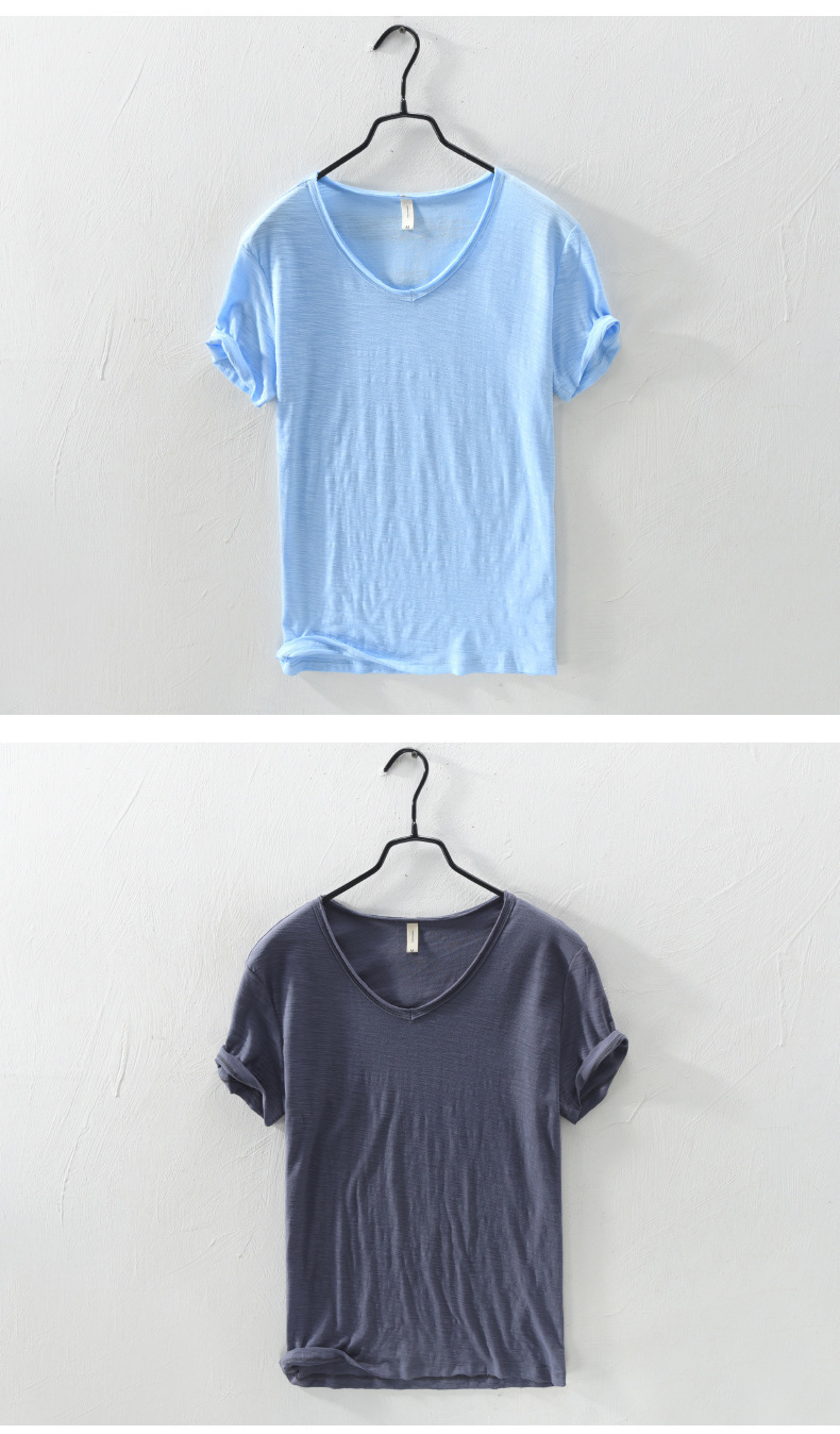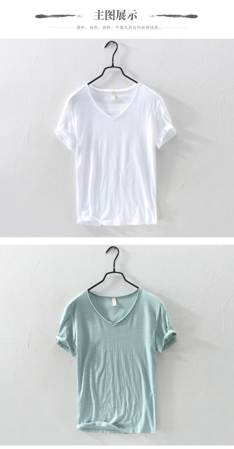 심플 슬럽 코튼 티셔츠 남자 반팔 새 여름 유행 남자 반소매 느슨한 올 매치 V 넥 티셔츠 남자 구식