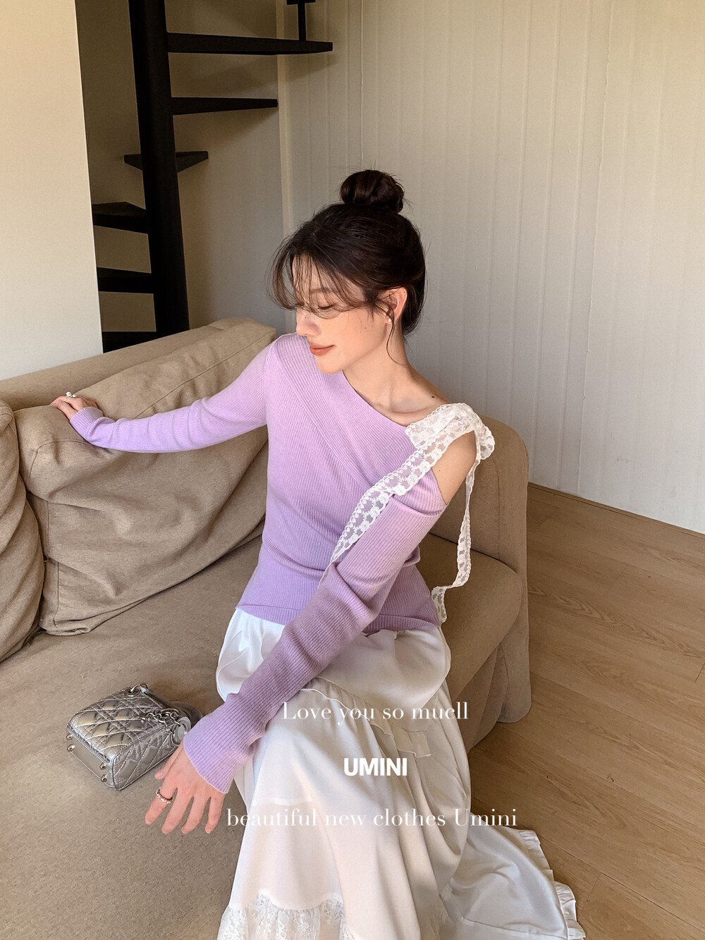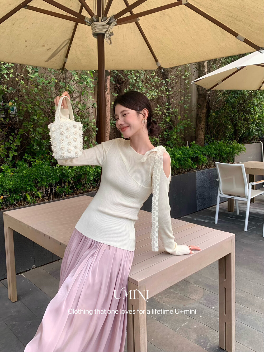U + MINI 13 라인 6137 새로운 봄 새로운 프랑스 날씬한 어깨 물 용해 꽃 6% 양모 레이스 업 스웨터