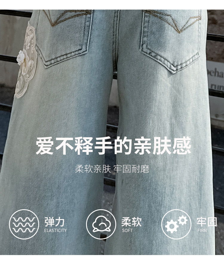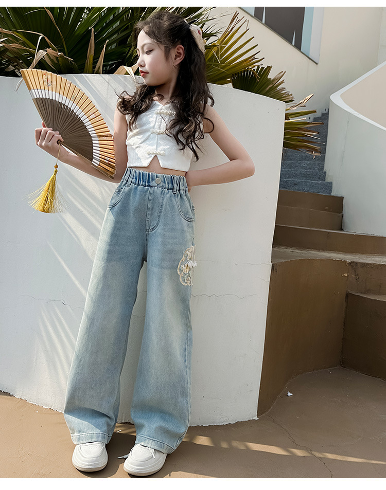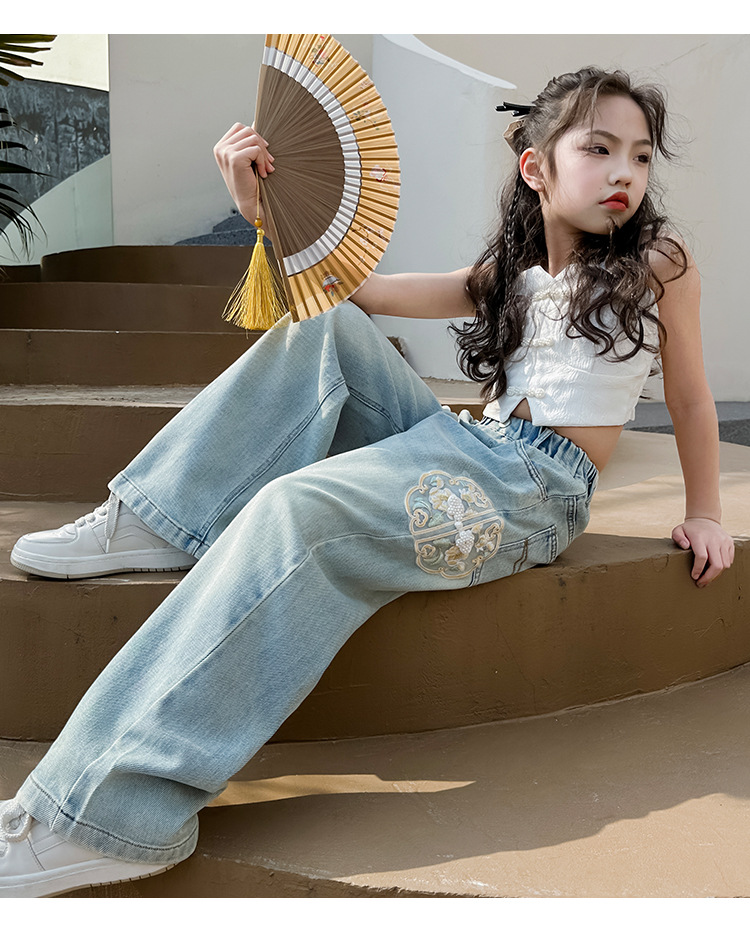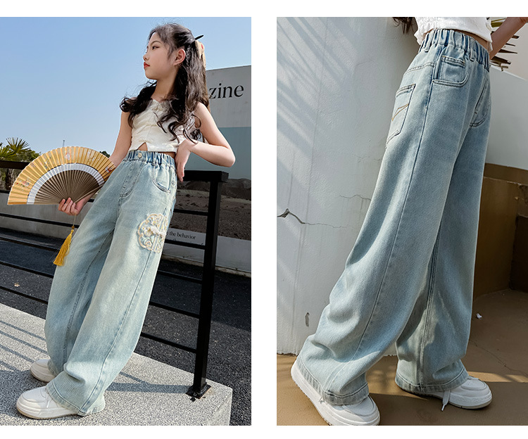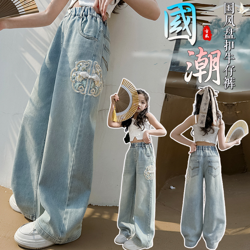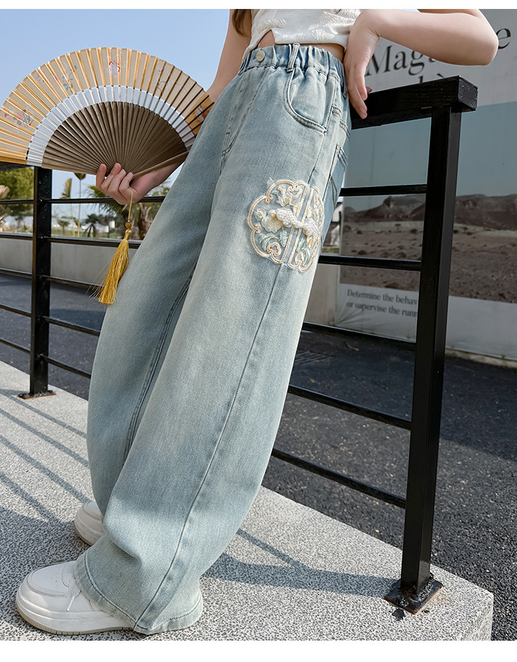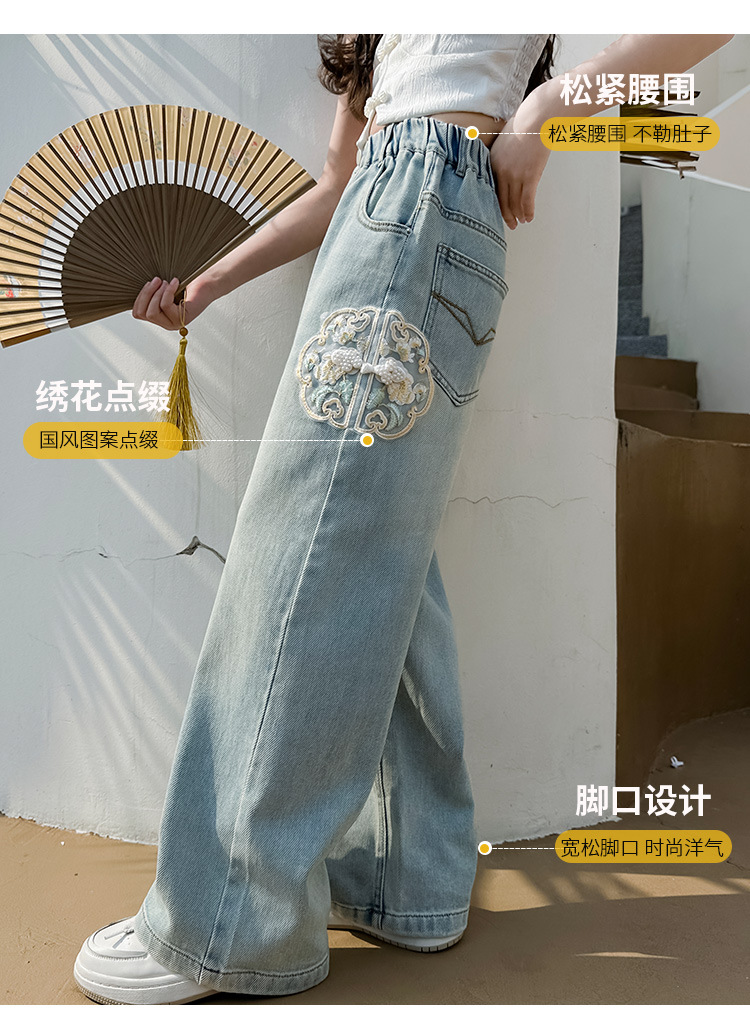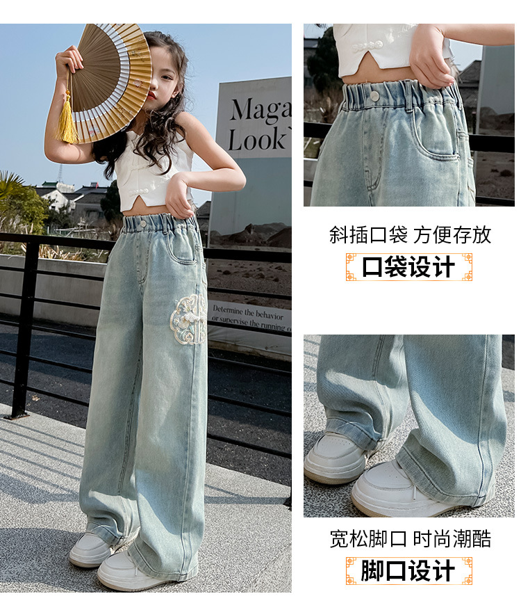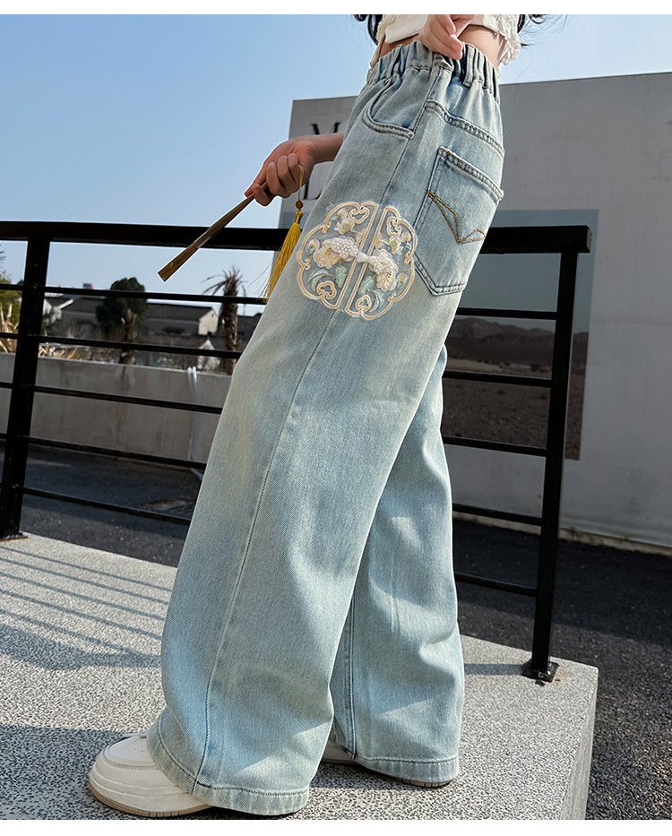 소녀 바지 봄과 가을 2024 새로운 가을 원피스 소녀 Guofeng 자수 직선 다리 바지 어린이 청바지