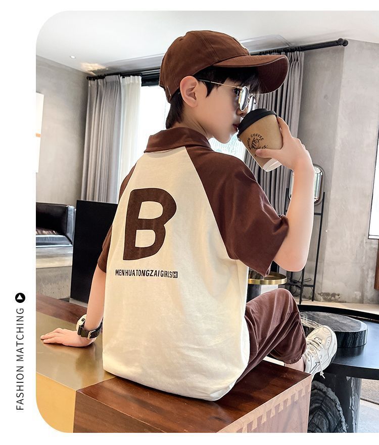 소년 여름 유행 2025 새로운 스타일 바 대형 어린이 편지 POLO 반팔 바지 캐주얼 스포츠 세트 트렌디스토어 가기
