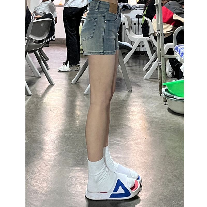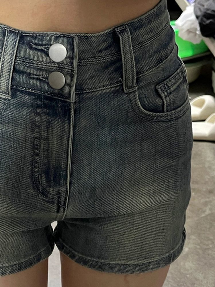 빈티지 블루 스트레이트 힙 데님 반바지 여성용 높은 허리 세척 스트레치 올 매치 배지 슬림 핏 슬림 핏 긴 다리
