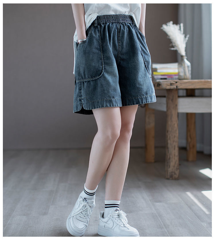 여름 TikTok 폭발성 얇은 배 모양의 넓은 다리 도파민 스포츠 반바지 4 점 반바지 여성 데님 반바지