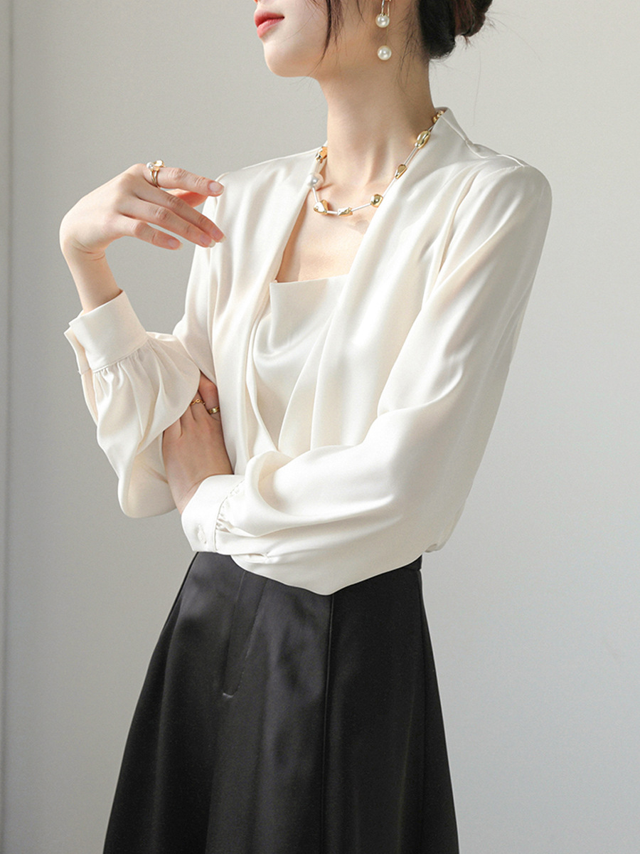 하이 엔드 유럽 서양식 독특한 하이 엔드 허리 타이트 탑 기질 올 매치 블루 새틴 셔츠 최고 여성의 봄스토어 가기