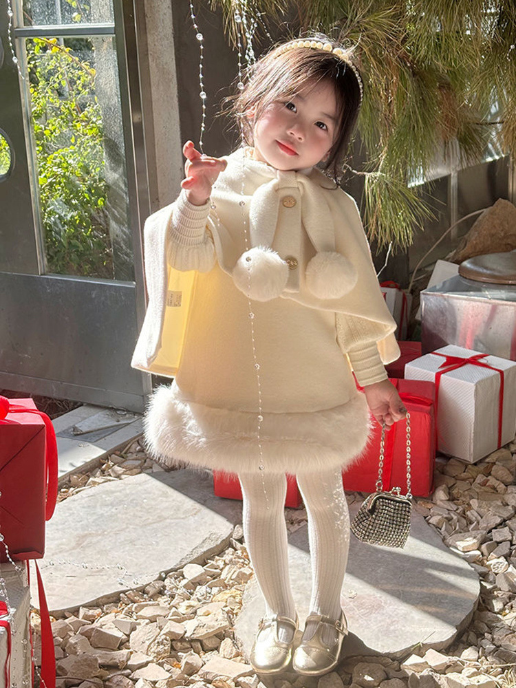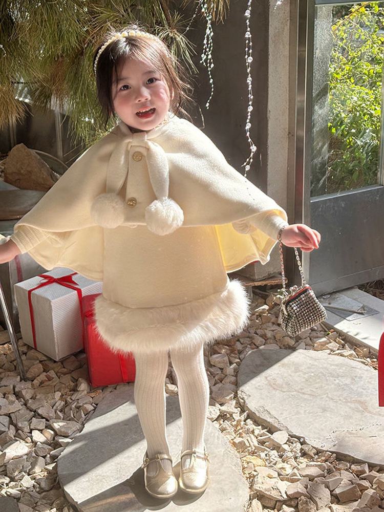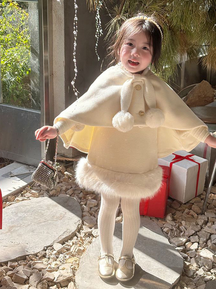 한국 아동복 2025 봄과 가을 새로운 귀여운 아이보리 봉제 조끼 치마 소녀 모직 케이프 코트